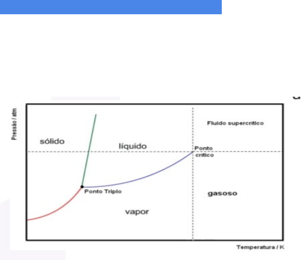 DIAGRAMA DE MUDANÇAS DE FASES Os diagramas de fases permitem conhecer a fase termodinamicamente mais estável de um material em qualquer condição de temperatura e pressão, diferentemente das curvas de aquecimento que são construídas mantendo a pressão constante. Nesse diagrama, as curvas que separam as regiões correspondentes às fases são denominadas curvas de equilíbrio. Essas curvas mostram os valores de temperatura e pressão em que duas fases estão presentes em equilíbrio, em um sistema. A curva verde corresponde à fusão ou solidificação, a vermelha corresponde à sublimação e, finalmente, a azul corresponde à vaporização ou condensação. O ponto triplo é o ponto que indica os valores de temperatura e pressão em que estão presentes, em equilíbrio, as três fases. O ponto crítico nos dá as condições de temperatura e pressão crítica. Sistemas que apresentam valores de temperatura e pressão acima do ponto crítico são denominados fluidos supercrítico. image1.jpg