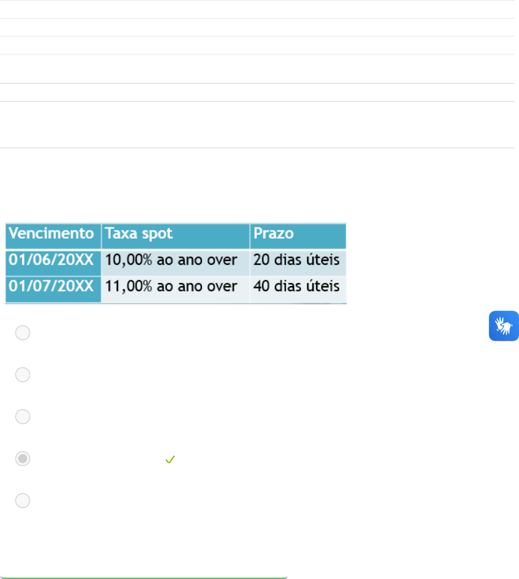 Iniciado em segunda-feira, 29 abr. 2024, 18:21 Estado Finalizada Concluída em segunda-feira, 29 abr. 2024, 18:33 Tempo empregado 11 minutos 51 segundos Avaliar 9,0 de um máximo de 10,0(90%) Questão 1 Correto Atingiu 1,0 de 1,0 Na tabela a seguir, são mostrados os valores das taxas spot (também chamadas de taxas à vista) para várias datas. Com base nessas taxas, calcule a taxa de juros forward para o mês de junho. a. 11,81% ao ano over. b. 11,41% ao ano over. c. 11,61% ao ano over. d. 12,01% ao ano over. e. 11,21% ao ano over. A resposta correta é: 12,01% ao anoover. 02/05/2024, 21:10 Avaliação Final - Matemática Financeira: Revisão da tentativa https://ava.faculdadefocus.edu.br/mod/quiz/review.php?attempt=518217&cmid=621 1/10 Questão 2 Correto Atingiu 1,0 de 1,0 Roberta fez uma aplicação num fundo de investimentos de longo prazo. O investimento foi feito por um prazo de 3 anos a uma taxa de juros de 10% ao ano. Para investimento num fundo com prazo superior a 720 dias, a alíquota de Imposto de Renda é de 15%. Calcule a taxa de juros líquida de impostos desse investimento. a. 9,5% ao ano. b. 8,6% ao ano. c. 7,7% ao ano. d. 5,9% ao ano. e. 6,8% ao ano. A resposta correta é: 8,6% ao ano. 02/05/2024, 21:10 Avaliação Final - Matemática Financeira: Revisão da tentativa https://ava.faculdadefocus.edu.br/mod/quiz/review.php?attempt=518217&cmid=621 2/10 Questão 3 Correto Atingiu 1,0 de 1,0 Apesar de a Taxa Interna de Retorno (TIR) ser uma metodologia muito utilizada na análise de investimentos, apresenta um problema que é solucionado pela Taxa Interna de Retorno Modificada (TIRM). Qual é o problema da TIR que é corrigido pela TIRM? a. A TIR assume que todos os recursos intermediários recebidos serão reinvestidos à mesma taxa de juros que o projeto proporciona. A TIRM corrige isso, reinvestindo as receitas intermediárias à taxa que seria realmente possível reinvestir o dinheiro recebido. b. A TIR não pode ser calculada quando o investimento apresenta taxa de retorno negativa, enquanto que a TIRM permite essa situação. c. A TIR supõe que a taxa mínima de atratividade seja zero, enquanto que a TIRM não tem essa premissa. d. A TIR exige que o VPL seja sempre positivo, enquanto que a TIRM não faz essa exigência. e. Não existem diferenças entre a TIR e a TIRM. A resposta correta é: A TIR assume que todos os recursos intermediários recebidos serão reinvestidos à mesma taxa de juros que o projeto proporciona. A TIRM corrige isso, reinvestindo as receitas intermediárias à taxa que seria realmente possível reinvestir o dinheiro recebido. 02/05/2024, 21:10 Avaliação Final - Matemática Financeira: Revisão da tentativa https://ava.faculdadefocus.edu.br/mod/quiz/review.php?attempt=518217&cmid=621 3/10 Questão 4 Correto Atingiu 1,0 de 1,0 Uma empresa faz um empréstimo no banco e descobre que ele cobrará a taxa DI, que é a taxa utilizada nos empréstimos que um banco faz ao outro e que são muito próximas da taxa de juros básica da economia, também chamada de taxa de juros livre de risco. O gerente-financeiro da empresa verifica que, ao longo do último ano, a taxa DI foi de 12% ao ano. A ele foi incumbida a função de determinar qual será a taxa de juros mensal do empréstimo. Esse gestor decide simplesmente que uma aproximação para a taxa mensal que ocorrerá no futuro é a taxa equivalente à taxa anual que ocorreu no último ano. Encontre a taxa de juros mensal equivalente. a. 2,00% ao mês. b. 1,50% ao mês. c. 1,20% ao mês. d. 0,94% ao mês. e. 1,00% ao mês. A resposta correta é: 0,94% ao mês. 02/05/2024, 21:10 Avaliação Final - Matemática Financeira: Revisão da tentativa https://ava.faculdadefocus.edu.br/mod/quiz/review.php?attempt=518217&cmid=621 4/10 Questão 5 Correto Atingiu 1,0 de 1,0 Bernardo comprou uma Letra do Tesouro Nacional (LTN) um ano antes do seu vencimento. Esse é um título prefixado e cuja taxa de juros é conhecida na sua compra. Esse título estava cotado a uma taxa de juros de 15% ao ano. No mesmo dia da compra, ocorreram mudanças na economia nacional, fazendo com que a taxa de juros caísse para 12% ao ano. Bernardo vendeu o título no mesmo dia, depois dessas mudanças. Ele obteve ganho ou prejuízo? a. Com base nas informações apresentadas, não é possível saber se houve ganho ou prejuízo. b. Ele obteve ganho, pois a taxa de juros caiu. c. Ele obteve prejuízo, pois sempre que a taxa de juros varia ocorre prejuízo para o detentor da LTN. d. Ele obteve prejuízo, pois a taxa de juros caiu. e. Como a LTN é um título de renda fixa, não ocorreu variação do seu valor. A resposta correta é: Ele obteve ganho, pois a taxa de juros caiu. 02/05/2024, 21:10 Avaliação Final - Matemática Financeira: Revisão da tentativa https://ava.faculdadefocus.edu.br/mod/quiz/review.php?attempt=518217&cmid=621 5/10 Questão 6 Correto Atingiu 1,0 de 1,0 Um banco, ao descontar notas promissórias, utiliza o desconto comercial, cobrando taxa de juros de 3% ao mês. Um cliente desse banco possui recebíveis no valor de R$ 200.000,00. Calcule o valor que esse cliente receberá do banco ao descontar a nota promissória 3 meses antes do vencimento. a. R$ 194.000,00 b. R$ 187.000,00 c. R$ 182.000,00 d. R$ 183.028,33 e. R$ 185.000,00 A resposta correta é: R$ 182.000,00 02/05/2024, 21:10 Avaliação Final - Matemática Financeira: Revisão da tentativa https://ava.faculdadefocus.edu.br/mod/quiz/review.php?attempt=518217&cmid=621 6/10 Questão 7 Incorreto Atingiu 0,0 de 1,0 Um empreendedor está fazendo estimativas do crescimento da sua empresa recém-criada. Apesar de a empresa estar ativa há apenas um ano, ela tem apresentado um crescimento acelerado: a taxa de crescimento nos últimos 3 meses foi de 3,5% ao mês. Esse empreendedor assume que o crescimento que ocorrerá nos próximos 12 meses será igual ao que ocorreu nos últimos meses. Calcule o crescimento anual previsto para a empresa. a. 36,00% ao ano. b. 65,43% ao an
