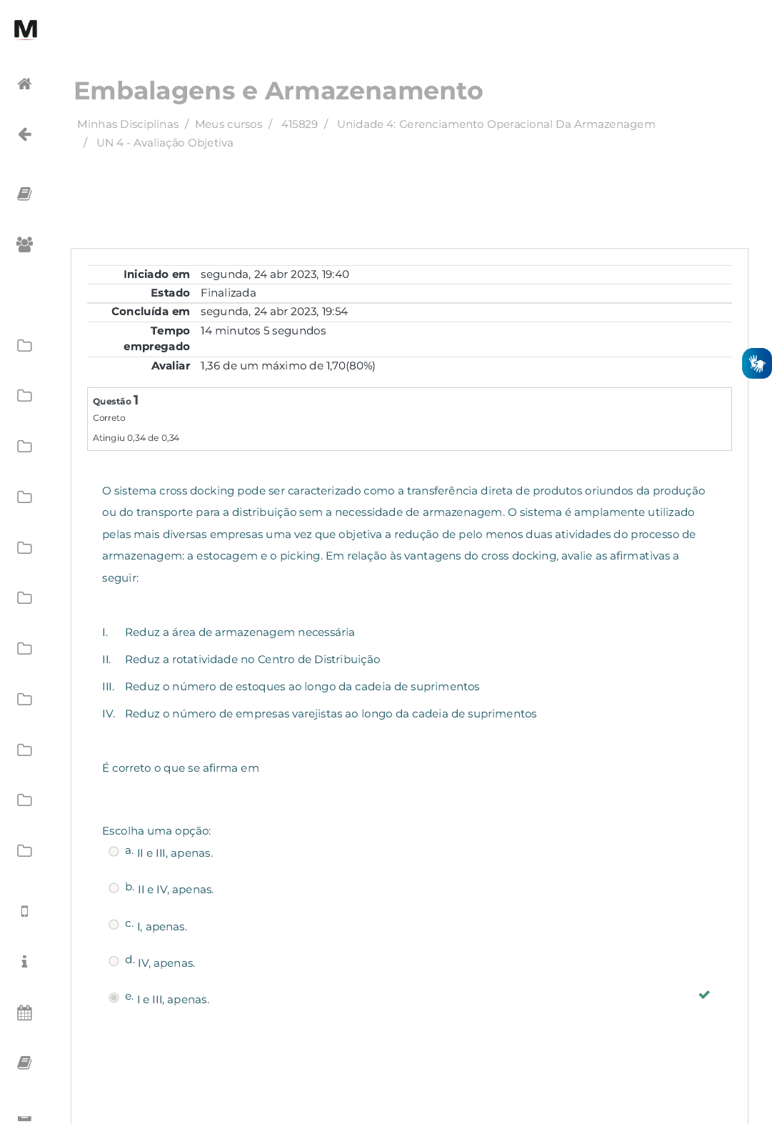 Minhas Disciplinas / Meus cursos / 415829 / Unidade 4: Gerenciamento Operacional Da Armazenagem / UN 4 - Avaliação Objetiva Embalagens e Armazenamento Iniciado em segunda, 24 abr 2023, 19:40 Estado Finalizada Concluída em segunda, 24 abr 2023, 19:54 Tempo empregado 14 minutos 5 segundos Avaliar 1,36 de um máximo de 1,70(80%) Questão 1 Correto Atingiu 0,34 de 0,34 O sistema cross docking pode ser caracterizado como a transferência direta de produtos oriundos da produção ou do transporte para a distribuição sem a necessidade de armazenagem. O sistema é amplamente utilizado pelas mais diversas empresas uma vez que objetiva a redução de pelo menos duas atividades do processo de armazenagem: a estocagem e o picking. Em relação às vantagens do cross docking, avalie as a�rmativas a seguir: I. Reduz a área de armazenagem necessária II. Reduz a rotatividade no Centro de Distribuição III. Reduz o número de estoques ao longo da cadeia de suprimentos IV. Reduz o número de empresas varejistas ao longo da cadeia de suprimentos É correto o que se a�rma em Escolha uma opção: a. II e III, apenas. b. II e IV, apenas. c. I, apenas. d. IV, apenas. e. I e III, apenas. https://avap.multivix.edu.br/my/ https://avap.multivix.edu.br/course/view.php?id=20130 https://avap.multivix.edu.br/course/view.php?id=20130§ion=5 https://avap.multivix.edu.br/mod/quiz/view.php?id=1310279 https://avap.multivix.edu.br/my/ https://avap.multivix.edu.br/course/view.php?id=20130 https://avap.multivix.edu.br/user/index.php?id=20130 https://avap.multivix.edu.br/course/view.php?id=20130§ion=1 https://avap.multivix.edu.br/course/view.php?id=20130§ion=2 https://avap.multivix.edu.br/course/view.php?id=20130§ion=3 https://avap.multivix.edu.br/course/view.php?id=20130§ion=4 https://avap.multivix.edu.br/course/view.php?id=20130§ion=5 https://avap.multivix.edu.br/course/view.php?id=20130§ion=6 https://avap.multivix.edu.br/course/view.php?id=20130§ion=7 https://avap.multivix.edu.br/course/view.php?id=20130§ion=8 https://avap.multivix.edu.br/course/view.php?id=20130§ion=9 https://avap.multivix.edu.br/course/view.php?id=20130§ion=10 https://avap.multivix.edu.br/course/view.php?id=20130§ion=11 https://avap.multivix.edu.br/hooks/portal/ https://avap.multivix.edu.br/mod/page/view.php?id=1252%2F%22%20target%3D%22_blank https://avap.multivix.edu.br/calendar/view.php/ https://avap.multivix.edu.br/local/staticpage/view.php?page=biblioteca https://portalweb.multivix.edu.br/gabaritos/login.aspx https://avap.multivix.edu.br/ Questão 2 Incorreto Atingiu 0,00 de 0,34 Questão 3 Correto Atingiu 0,34 de 0,34 A empresa de móveis Pinho Forte S/A está planejando suas operações de ressuprimento e resolveu fazer as análises iniciais tomando como base a sua demanda por verniz (um item amplamente utilizado na fabricação dos seus diversos produtos). Considerando uma demanda de 60 galões dentro de um mês, um custo de aquisição de R$ 17,75, taxa de juros de 0,5% ao mês e custo de ressuprimento de R$ 9,50, quantos galões devem ser solicitados em cada pedido de ressuprimento? Escolha uma opção: a. 41 b. 28 c. 30 d. 36 e. 31 O sistema milk run, que deriva das antigas práticas de abastecimento de leite nas fazendas dos Estados Unidos, consiste em acelerar a entrega das matérias-primas nas plantas fabris a partir do estabelecimento de rotas para fazer múltiplas cargas e entregas em muitas plantas. O sistema pode ser implementado de diferentes formas; dentre estas formas, destaca-se aquela em que encontra-se a melhor roteirização e determina-se a quantidade de peças a serem coletadas em cada viagem pelo fornecedor de serviços de transporte. Esta modalidade de milk run refere-se àquela realizada Escolha uma opção: a. por um cliente. b. por um operador logístico. c. pela própria empresa. d. por uma transportadora. e. por uma empresa parceira. https://avap.multivix.edu.br/my/ https://avap.multivix.edu.br/course/view.php?id=20130 https://avap.multivix.edu.br/user/index.php?id=20130 https://avap.multivix.edu.br/course/view.php?id=20130§ion=1 https://avap.multivix.edu.br/course/view.php?id=20130§ion=2 https://avap.multivix.edu.br/course/view.php?id=20130§ion=3 https://avap.multivix.edu.br/course/view.php?id=20130§ion=4 https://avap.multivix.edu.br/course/view.php?id=20130§ion=5 https://avap.multivix.edu.br/course/view.php?id=20130§ion=6 https://avap.multivix.edu.br/course/view.php?id=20130§ion=7 https://avap.multivix.edu.br/course/view.php?id=20130§ion=8 https://avap.multivix.edu.br/course/view.php?id=20130§ion=9 https://avap.multivix.edu.br/course/view.php?id=20130§ion=10 https://avap.multivix.edu.br/course/view.php?id=20130§ion=11 https://avap.multivix.edu.br/hooks/portal/ https://avap.multivix.edu.br/mod/page/view.php?id=1252%2F%22%20target%3D%22_blank https://avap.multivix.edu.br/calendar/view.php/ https://avap.multivix.edu.br/local/staticpage/view.php?page=biblioteca https://portalweb.multivix.edu.br/gabaritos/login.aspx https://avap.multivix.edu.br/ Questão 4 Correto Atingiu 0,34 de 0,34 O Grá�co de Pareto ou ABC foi desenvolvido a partir dos estudos de Vilfredo Pareto e baseia-se na análise da concentração de certa característica por uma pequena parcela da população analisada. Comumente, esta concentração se dá na proporção de 80 para 20. Ou seja, 20% da população concentra 80% da característica analisada. Daí, uma outra forma de reconhecer o diagrama: grá�co 80-20. No que se refere ao grá�co de Pareto, analise as assertivas a seguir e a relação proposta entre elas. I. Na prática, a curva ABC é utilizada como uma base sobre a necessidade de compra de mercadorias e matérias-primas de maneira priorizada. PORQUE II. A utilização do grá�co no contexto da logística deve dar destaque ao gerenciamento dos itens mais críticos, ou seja, aqueles pertencentes à classe C. A respeito dessas asserções, assinale a opção correta. Escolha uma opção: a. As asserções I
