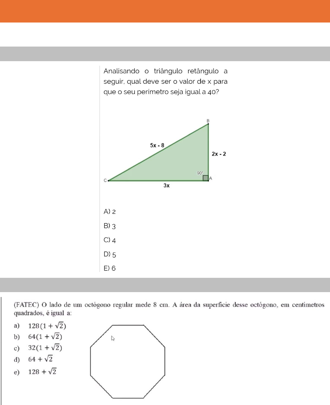 GEOMETRIA PLANA LISTA DE REVISÃO Questão 01 Questão 02 Questão 03 Questão 04 Questão 05 Questão 06 Questão 07 Questão 08 Questão 09 Questão 10 Questão 11 Questão 12 Questão 13 Questão 177 Um fabricante recomenda que, para cada m² do ambiente a ser climatizado,são necessário 800 BTUh desde que haja até duas pessoas no ambiente. A esse número devem ser acrescentados 600 BTUh para cada pessoa a mais, e também para cada aparelho eletrônico emissor de calor no ambiente. A seguir encontram- se as cinco opções de aparelhos desse fabricante e suas respectivas capacidades térmicas: O supervisor de um laboratório precisa comprar um aparelho para climatizar o ambiente. Nele, ficarão duas pessoas mais uma centrífuga que emite calor. O laboratório tem a forma de trapézio retângulo, com as medidas apresentadas na figura. Para economizar energia, o supervisor deverá escolher o aparelho de menor capacidade térmica que atenda às necessidades do laboratório e às recomendações do fabricante. A escolha do supervisor recairá sobre o aparelho do tipo 1. I. 2. II. 3. III. 4. IV. 5. V. Questão 14 Questão 15 Questão 16 Questão 17 Questão 18 Questão 19 Questão 20 Questão 21 Questão 22 Questão 23 Questão 24 Questão 25 Questão 26