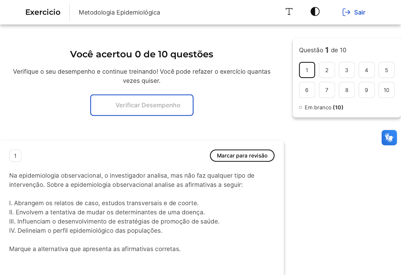 Você acertou 0 de 10 questões Verifique o seu desempenho e continue treinando! Você pode refazer o exercício quantas vezes quiser. Verificar Desempenho 1 Marcar para revisão Na epidemiologia observacional, o investigador analisa, mas não faz qualquer tipo de intervenção. Sobre a epidemiologia observacional analise as afirmativas a seguir: I. Abrangem os relatos de caso, estudos transversais e de coorte. II. Envolvem a tentativa de mudar os determinantes de uma doença. III. Influenciam o desenvolvimento de estratégias de promoção de saúde. IV. Delineiam o perfil epidemiológico das populações. Marque a alternativa que apresenta as afirmativas corretas. Questão 1 de 10 Em branco �10� 1 2 3 4 5 6 7 8 9 10 Exercicio Metodologia Epidemiológica Sair A B C D E I, II e III, apenas. I, III e IV, apenas. II, III e IV, apenas. I e II, apenas. II e III, apenas. Questão não respondida Opa! A alternativa correta é a letra B. Confira o gabarito comentado! Gabarito Comentado A epidemiologia observacional engloba estudos descritivos, como relatos de caso e séries de casos, e estudos analíticos, como estudos transversais e de coorte. Essa abordagem tem como objetivo principal traçar o perfil epidemiológico das populações, orientar ações de assistência, prevenção e controle de doenças, além de influenciar o desenvolvimento de estratégias de promoção de saúde. Portanto, as afirmativas I, III e IV estão corretas. Por outro lado, a afirmativa II está incorreta, pois a tentativa de mudar os determinantes de uma doença ou interromper seu progresso por meio de um novo A B C tratamento, por exemplo, é característica da epidemiologia experimental, e não da epidemiologia observacional. Portanto, a alternativa correta é a B� I, III e IV, apenas. 2 Marcar para revisão De maneira geral, a incidência de acidentes ofídicos aumenta nos meses correspondentes ao verão (dezembro - fevereiro) em comparação com os meses mais frios. Associa-se esse aumento, por exemplo, à maior atividade humana nos trabalhos de campo durante os períodos mais quentes, facilitando dessa forma o contato acidental entre o indivíduo e as serpentes. Marque a alternativa que apresenta o tipo de variação temporal nos agravos de saúde. Variação sazonal. Variação irregular. Tendência secular ou histórica. D E Variação cíclica. Variação reprodutiva. Questão não respondida Opa! A alternativa correta é a letra A. Confira o gabarito comentado! Gabarito Comentado O enunciado descreve um cenário em que a incidência de acidentes ofídicos aumenta durante os meses de verão, em comparação com os meses mais frios. Isso é um exemplo de variação sazonal, que é a variação da incidência de uma doença que coincide com as estações do ano e depende de um conjunto de fatores, como a radiação solar, temperatura, umidade atmosférica, chuvas, entre outros. Portanto, a alternativa correta é a "Variação sazonal". As outras alternativas não se aplicam ao cenário descrito. A tendência secular ou histórica refere-se à análise das mudanças na frequência de uma doença (incidência, mortalidade etc.) por um longo período de tempo, geralmente décadas. A variação irregular é aquela em que o número de casos não varia de forma previsível. A variação reprodutiva está relacionada à capacidade de reprodução da mulher, que não tem relação com o enunciado e a epidemiologia. A B C 3 Marcar para revisão A distribuição de doenças no espaço e no tempo é tema dos mais explorados em epidemiologia. Nos manuais clássicos da disciplina, por exemplo, a tríade "pessoa-tempo- lugar" é concebida como ferramenta básica para a descrição dos fenômenos epidemiológicos. Fonte: WERNECK, G.L.; STRUNCHINER, C.J. Estudos de agregados de doença no espaço- tempo: conceitos, técnicas e desafios. Cad. Saúde Pública 13 �4�, 1997. Em relação ao estudo da distribuição espacial das doenças, analise as afirmativas a seguir. I. O conceito de espaço no que se refere à distribuição de doenças vai muito além das características geográficas e naturais. II. A análise exploratória de dados é realizada através de ferramentas de geoprocessamento, geoestatística, modelagem matemática e sensoriamento remoto. III. A análise da medida de frequência de uma doença deve desconsiderar o espaço no qual ela está inserida. IV. Os estudos de migrantes analisam o impacto das variações geográficas na frequência de doença, separando os efeitos associados ao ambiente dos efeitos do indivíduo. Marque a alternativa que apresenta as afirmativas corretas. I, II e III, apenas. I, III e IV, apenas. I, II e IV, apenas. D E I e II, apenas. II e III, apenas. Questão não respondida Opa! A alternativa correta é a letra C. Confira o gabarito comentado! Gabarito Comentado Gabarito: I, II e IV, apenas. Justificativa: A análise da distribuição de doenças no espaço é um aspecto crucial em epidemiologia. O conceito de espaço vai além das características geográficas e naturais, incluindo também aspectos sociais, econômicos e culturais. Ferramentas de geoprocessamento, geoestatística, modelagem matemática e sensoriamento remoto são utilizadas na análise exploratória de dados. A afirmação III está incorreta, pois a análise da medida de frequência de uma doença não deve desconsiderar o espaço no qual ela está inserida, pois o ambiente pode influenciar na ocorrência da doença. Os estudos de migrantes, por sua vez, analisam o impacto das variações geográficas na frequência de doença, separando os efeitos associados ao ambiente dos efeitos do indivíduo. Portanto, as afirmativas I, II e IV estão corretas. A B C D E 4 Marcar para revisão Leia a descrição abaixo. Esse tipo de estudo tem início com um grupo de pessoas livres da doença de interesse, que são agrupadas de acordo com a presença ou ausência de determinado fator de exposição. Em seguida, os s