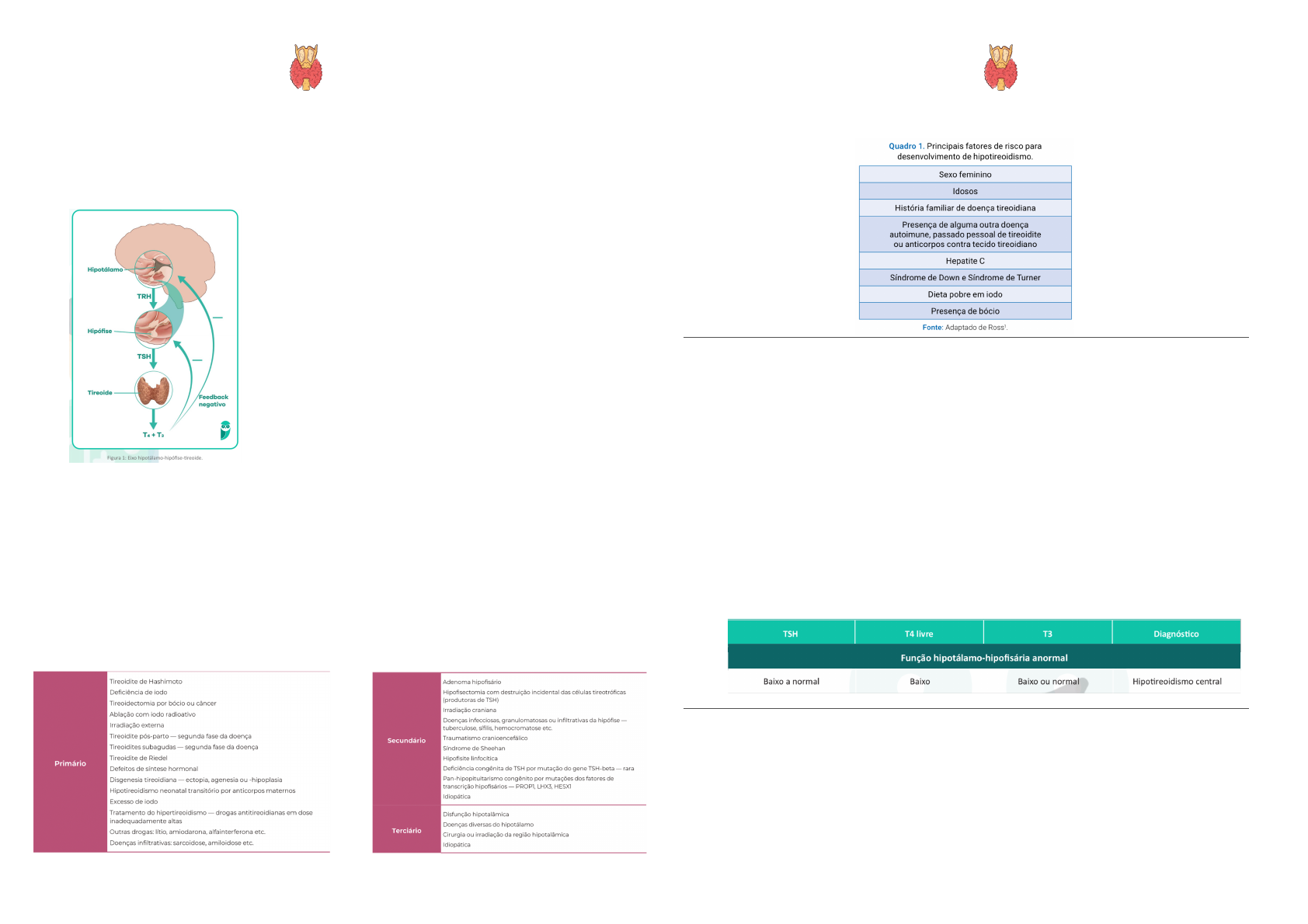 Hipotireoidismo e Hipertiroidismo Fisiologia da Tireoide: Existem dois hormônios tireoidianos: o T4 (tetraiodotironina ou tiroxina) e o T3 (tri-iodotironina). A produção de hormônios tireoidianos é regulada pelo eixo hipotálamo-hipófise-tireoide, como boa parte de todo sistema endócrino humano. Os neurônios hipotalâmicos sintetizam e liberam TRH na circulação porta-hipofisária, que irriga as células da adeno-hipófise que produzem e secretam o hormônio TSH. Esse eixo, funciona por meio de um feedback negativo, isto é, quando a glândula tireoide secreta T3 e T4, esses hormônios possuem a capacidade de inibir a liberação de TRH e TSH. Assim, se há aumento de T3 e T4, ocorre a redução de TSH e TRH, reduzindo a secreção dos hormônios tireoidianos. Hipotireoidismo: É uma síndrome clínica ocasionada por síntese/secreção insuficiente ou ação inadequada dos hormônios tireoidianos nos tecidos, resultando em lentificação generalizada do metabolismo. Podemos classificar em primário (“problema na tireoide”), secundário (“problema na hipófise”) ou terciário (“problema no hipotálamo”) e suas principais causas incluem: Os principais fatores de risco são: Hipotireoidismo Central: São as formas secundárias e terciárias de hipotireoidismo, ou seja, o “problema” está na hipófise ou no hipotálamo. Trata-se de uma causa incomum de hipotireoidismo, representando aproximadamente 1% dos casos. O TSH encontra-se baixo ou inapropriadamente normal, em face de um T4 livre que está sempre baixo. O hipotireoidismo centram adquirido pode ser causado por qualquer processo neoplásico infiltrativo, inflamatório ou traumático que acometa a hipófise ou o hipotálamo. Em decorrência disso, o próximo passo após a confirmação do hipotireoidismo de um padrão “central” é a realização de uma RM para pesquisa de doenças que justifiquem este achado. Hipotireoidismo Subclinico: É definido laboratorialmente pela presença de TSH elevado e T4 livre normal. A investigação seria realizada em situações nas quais existe suspeita para o HSC ou como screening em grupos específicos de indivíduos, como mulheres acima de 35 anos a cada cinco anos, pacientes com história prévia ou familiar de doença tireoidiana, submetidos à cirurgia de tireoide, terapia prévia com iodo radioativo ou radiação externa no pescoço, diabetes tipo 1, história pessoal ou familiar de doença autoimune, síndrome de Down e Turner, tratamento com lítio ou amiodarona, depressão, dislipidemia e hiperprolactinemia. A decisão de tratar ou não deve levar em conta fatores específicos, como idade, intensidade da doença, manifestações clínicas, qualidade de vida, presença de comorbidades, risco cardiovascular, preferências do paciente e julgamento clínico individual. O primeiro passo sempre deve ser a confirmação de elevação persistente do TSH com uma segunda dosagem, repetida 3 a 6 meses após a primeira. As indicações mais aceitas para o tratamento são: - Fatores de risco alto para evolução ao hipotireoidismo franco - Gestação ou intenção de gestar - Idade < 65 anos e risco cardiovascular elevado, desde que TSH ≥ 7mU/l - Presença de sintomas, desde que não exista outra causa mais provável. Manifestacoes Clinicas: Trata-se de um quadro clínico sistêmico, cujas manifestações se devem à diminuição do metabolismo basal e ao acúmulo de glicosaminoglicanos. Podemos entender melhor os sinais e os sintomas do hipotireoidismo compreendendo o mecanismo de suas manifestações. Assim como o quadro clínico, as alterações laboratoriais no hipotireoidismo são sistêmicas, e as principais são: 1. Hipoglicemia 2. Anemia 3. Dislipidemia mista, com hipercolesterolemia por aumento importante de LDL, discreto aumento de triglicérides e queda discreta do HDL 4. Aumento de transaminases e desidrogenase láctica (DHL) 5. Aumento de enzimas musculares (creatinofosfoquinase [CPK] e aldolase) 6. Redução do sódio corporal total 7. Aumento de prolactina 8. Discreto aumento nos níveis de paratormônio e vitamina D, podendo levar à hipercalcemia leve 9. Hipocortisolismo 10. Hipercapnia (hipercarbia) pela bradipneia 11. Redução da taxa de filtração glomerular, com aumento de creatinina e ácido úrico Diagnostico: O primeiro exame a ser solicitado na suspeita de hipotireoidismo é o TSH, que, se alterado, indica o prosseguimento da investigação com uma segunda coleta sanguínea para a dosagem do TSH e do T4 livre. Como a grande maioria dos pacientes com hipotireoidismo primário possui tireoidite crônica autoimune, a solicitação de anticorpos direcionados contra a tireoide é uma conduta opcional. A maioria dos especialistas concorda que a solicitação do anti-TPO tem mais utilidade em três situações: • Para investigar a possibilidade de bócio imunomediado em pacientes sem disfunção tireoidiana; • Para avaliar a probabilidade de progressão para hipotireoidismo clínico permanente em pacientes com hipotireoidismo subclínico, tireoidite indolor (silenciosa) ou tireoidite pós-parto. A conduta justifica-se porque a positividade do anti-TPO aumenta o risco desse desfecho; • Aborto recorrente, com ou sem infertilidade. A ultrassonografia também não faz parte da propedêutica habitual do hipotireoidismo, mas, quando realizada, costuma evidenciar padrão heterogêneo e redução difusa da ecogenicidade do parênquima glandular. Pode-se observar ainda a presença de áreas ecogênicas mal delimitadas separadas por faixas hipoecogênicas, o que confere ao parênquima um “aspecto nodular”, entretanto, como não se tratam de nódulos verdadeiros, são descritos como “pseudonódulos”. Quando o paciente apresenta-se com função tireoidiana normal e anti-TPO positivo, podemos afirmar que ele é portador de tireoidite crônica autoimune sem hipotireoidismo. Tais pacientes devem ser submetidos à reavaliação do status funcional tireoidian