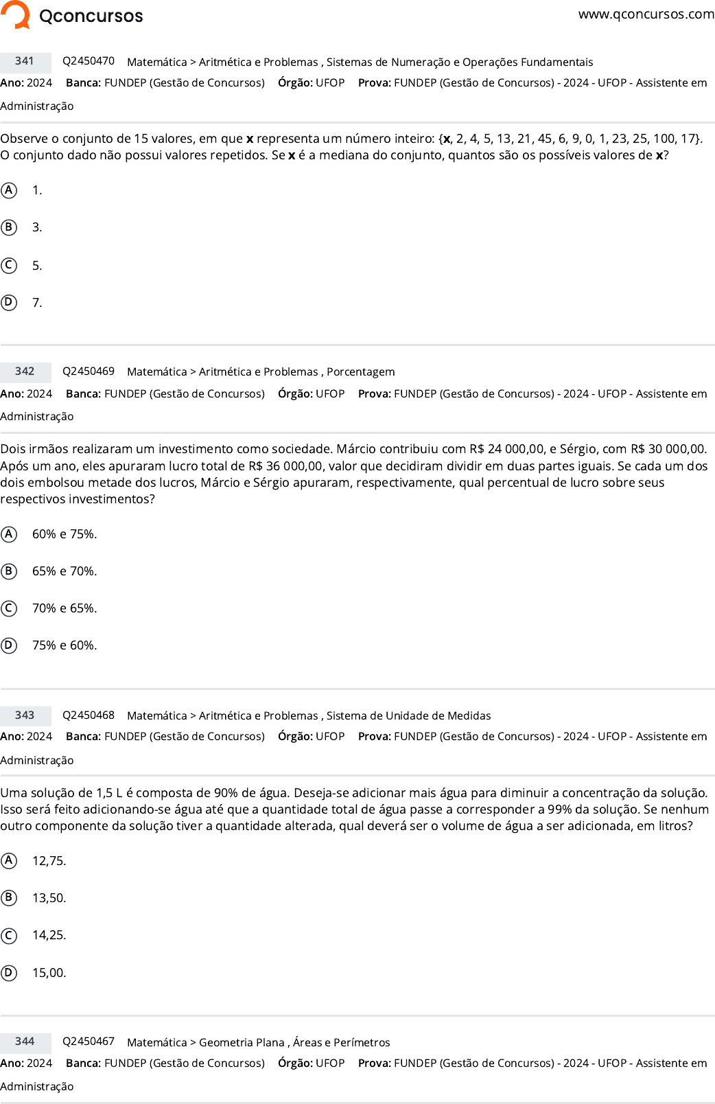 www.qconcursos.com Ano: 2024 Banca: FUNDEP (Gestão de Concursos) Órgão: UFOP Observe o conjunto de 15 valores, em que x representa um número inteiro: {x, 2, 4, 5, 13, 21, 45, 6, 9, 0, 1, 23, 25, 100, 17}. O conjunto dado não possui valores repetidos. Se x é a mediana do conjunto, quantos são os possíveis valores de x? A 1. B 3. C 5. D 7. Ano: 2024 Banca: FUNDEP (Gestão de Concursos) Órgão: UFOP Dois irmãos realizaram um investimento como sociedade. Márcio contribuiu com R$ 24 000,00, e Sérgio, com R$ 30 000,00. Após um ano, eles apuraram lucro total de R$ 36 000,00, valor que decidiram dividir em duas partes iguais. Se cada um dos dois embolsou metade dos lucros, Márcio e Sérgio apuraram, respectivamente, qual percentual de lucro sobre seus respectivos investimentos? A 60% e 75%. B 65% e 70%. C 70% e 65%. D 75% e 60%. Ano: 2024 Banca: FUNDEP (Gestão de Concursos) Órgão: UFOP Uma solução de 1,5 L é composta de 90% de água. Deseja-se adicionar mais água para diminuir a concentração da solução. Isso será feito adicionando-se água até que a quantidade total de água passe a corresponder a 99% da solução. Se nenhum outro componente da solução tiver a quantidade alterada, qual deverá ser o volume de água a ser adicionada, em litros? A 12,75. B 13,50. C 14,25. D 15,00. Ano: 2024 Banca: FUNDEP (Gestão de Concursos) Órgão: UFOP 341 Q2450470 >Matemática Aritmética e Problemas , Sistemas de Numeração e Operações Fundamentais Prova: FUNDEP (Gestão de Concursos) - 2024 - UFOP - Assistente em Administração 342 Q2450469 >Matemática Aritmética e Problemas , Porcentagem Prova: FUNDEP (Gestão de Concursos) - 2024 - UFOP - Assistente em Administração 343 Q2450468 >Matemática Aritmética e Problemas , Sistema de Unidade de Medidas Prova: FUNDEP (Gestão de Concursos) - 2024 - UFOP - Assistente em Administração 344 Q2450467 >Matemática Geometria Plana , Áreas e Perímetros Prova: FUNDEP (Gestão de Concursos) - 2024 - UFOP - Assistente em Administração https://www.qconcursos.com/ https://www.qconcursos.com/questoes-de-concursos/bancas/fundep-gestao-de-concursos https://www.qconcursos.com/questoes-de-concursos/institutos/ufop https://www.qconcursos.com/questoes-de-concursos/bancas/fundep-gestao-de-concursos https://www.qconcursos.com/questoes-de-concursos/institutos/ufop https://www.qconcursos.com/questoes-de-concursos/bancas/fundep-gestao-de-concursos https://www.qconcursos.com/questoes-de-concursos/institutos/ufop https://www.qconcursos.com/questoes-de-concursos/bancas/fundep-gestao-de-concursos https://www.qconcursos.com/questoes-de-concursos/institutos/ufop https://www.qconcursos.com/questoes-de-concursos/questoes/ecc07119-fa https://www.qconcursos.com/questoes-de-concursos/disciplinas/matematica-matematica https://www.qconcursos.com/questoes-de-concursos/disciplinas/matematica-matematica/aritmetica-e-problemas https://www.qconcursos.com/questoes-de-concursos/disciplinas/matematica-matematica/sistemas-de-numeracao-e-operacoes-fundamentais https://www.qconcursos.com/questoes-de-concursos/provas/fundep-gestao-de-concursos-2024-ufop-assistente-em-administracao https://www.qconcursos.com/questoes-de-concursos/provas/fundep-gestao-de-concursos-2024-ufop-assistente-em-administracao https://www.qconcursos.com/questoes-de-concursos/questoes/ecbe1839-fa https://www.qconcursos.com/questoes-de-concursos/disciplinas/matematica-matematica https://www.qconcursos.com/questoes-de-concursos/disciplinas/matematica-matematica/aritmetica-e-problemas https://www.qconcursos.com/questoes-de-concursos/disciplinas/matematica-matematica/porcentagem https://www.qconcursos.com/questoes-de-concursos/provas/fundep-gestao-de-concursos-2024-ufop-assistente-em-administracao https://www.qconcursos.com/questoes-de-concursos/provas/fundep-gestao-de-concursos-2024-ufop-assistente-em-administracao https://www.qconcursos.com/questoes-de-concursos/questoes/ecbbae9a-fa https://www.qconcursos.com/questoes-de-concursos/disciplinas/matematica-matematica https://www.qconcursos.com/questoes-de-concursos/disciplinas/matematica-matematica/aritmetica-e-problemas https://www.qconcursos.com/questoes-de-concursos/disciplinas/matematica-matematica/sistema-de-unidade-de-medidas https://www.qconcursos.com/questoes-de-concursos/provas/fundep-gestao-de-concursos-2024-ufop-assistente-em-administracao https://www.qconcursos.com/questoes-de-concursos/provas/fundep-gestao-de-concursos-2024-ufop-assistente-em-administracao https://www.qconcursos.com/questoes-de-concursos/questoes/ecb8f81a-fa https://www.qconcursos.com/questoes-de-concursos/disciplinas/matematica-matematica https://www.qconcursos.com/questoes-de-concursos/disciplinas/matematica-matematica/geometria-plana https://www.qconcursos.com/questoes-de-concursos/disciplinas/matematica-matematica/areas-e-perimetros https://www.qconcursos.com/questoes-de-concursos/provas/fundep-gestao-de-concursos-2024-ufop-assistente-em-administracao https://www.qconcursos.com/questoes-de-concursos/provas/fundep-gestao-de-concursos-2024-ufop-assistente-em-administracao A bandeira de um país é um retângulo de largura a e comprimento b. Em seu interior, há um triângulo centralizado, de base e altura iguais a b, conforme a �gura a seguir. A razão entre a área total da bandeira e a área do triângulo em seu interior, em função de a e b, é dada por A ab/2. B 2ab. C 2a/b. D 2b/a. Ano: 2024 Banca: FUNDEP (Gestão de Concursos) Órgão: UFOP O número 12A5B, em que A é o algarismo das centenas e B é o algarismo das unidades, é divisível por 2, por 3 e por 5. Adicionalmente, ao se inverterem os algarismos A e B, obtém-se o número 12B5A, que não é divisível por 2 nem por 5. O maior valor de A que satisfaz às condições dadas é A 1. B 4. C 7. D 9. Ano: 2024 Banca: FUNDEP (Gestão de Concursos) Órgão: UFOP A tabela a seguir contém as distâncias em linha reta entre algumas cidades da região central de Minas Gerais, em km, mas está incompleta. 345 Q2