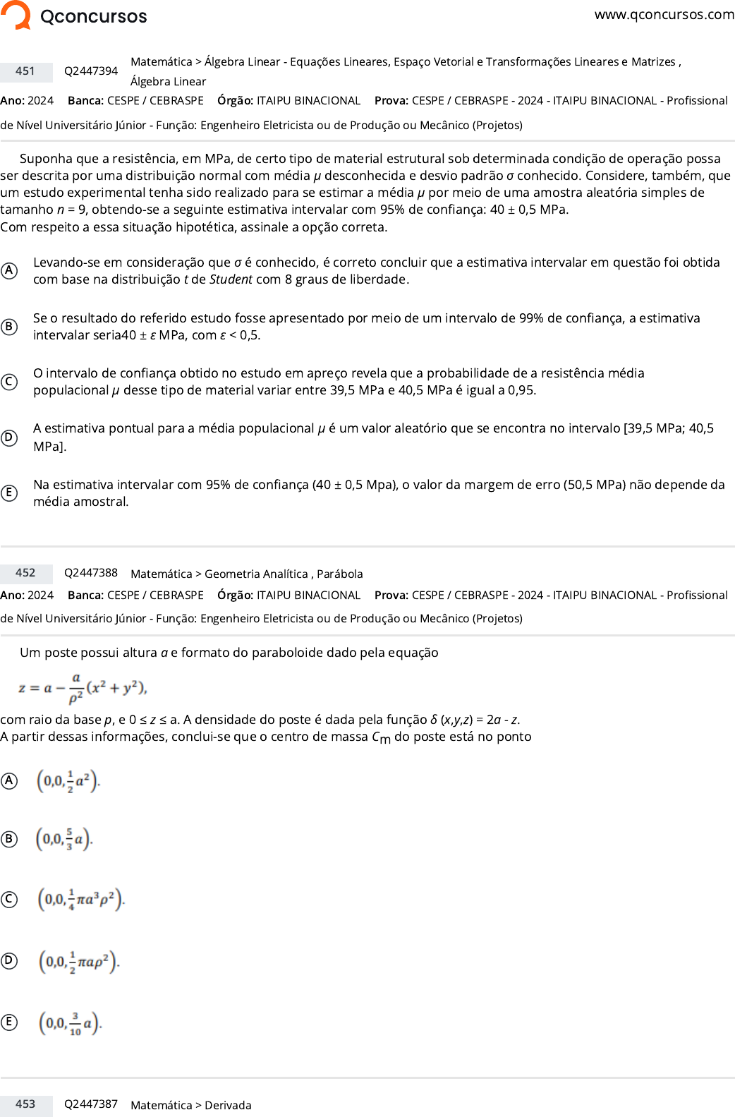 www.qconcursos.com Ano: 2024 Banca: CESPE / CEBRASPE Órgão: ITAIPU BINACIONAL Suponha que a resistência, em MPa, de certo tipo de material estrutural sob determinada condição de operação possa ser descrita por uma distribuição normal com média μ desconhecida e desvio padrão σ conhecido. Considere, também, que um estudo experimental tenha sido realizado para se estimar a média μ por meio de uma amostra aleatória simples de tamanho n = 9, obtendo-se a seguinte estimativa intervalar com 95% de con�ança: 40 ± 0,5 MPa. Com respeito a essa situação hipotética, assinale a opção correta. A Levando-se em consideração que σ é conhecido, é correto concluir que a estimativa intervalar em questão foi obtida com base na distribuição t de Student com 8 graus de liberdade. B Se o resultado do referido estudo fosse apresentado por meio de um intervalo de 99% de con�ança, a estimativa intervalar seria40 ± ε MPa, com ε < 0,5. C O intervalo de con�ança obtido no estudo em apreço revela que a probabilidade de a resistência média populacional μ desse tipo de material variar entre 39,5 MPa e 40,5 MPa é igual a 0,95. D A estimativa pontual para a média populacional μ é um valor aleatório que se encontra no intervalo [39,5 MPa; 40,5 MPa]. E Na estimativa intervalar com 95% de con�ança (40 ± 0,5 Mpa), o valor da margem de erro (50,5 MPa) não depende da média amostral. Ano: 2024 Banca: CESPE / CEBRASPE Órgão: ITAIPU BINACIONAL Um poste possui altura a e formato do paraboloide dado pela equação com raio da base p, e 0 ≤ z ≤ a. A densidade do poste é dada pela função δ (x,y,z) = 2a - z. A partir dessas informações, conclui-se que o centro de massa C do poste está no ponto A B C D E 451 Q2447394 >Matemática Álgebra Linear - Equações Lineares, Espaço Vetorial e Transformações Lineares e Matrizes , Álgebra Linear Prova: CESPE / CEBRASPE - 2024 - ITAIPU BINACIONAL - Pro�ssional de Nível Universitário Júnior - Função: Engenheiro Eletricista ou de Produção ou Mecânico (Projetos) 452 Q2447388 >Matemática Geometria Analítica , Parábola Prova: CESPE / CEBRASPE - 2024 - ITAIPU BINACIONAL - Pro�ssional de Nível Universitário Júnior - Função: Engenheiro Eletricista ou de Produção ou Mecânico (Projetos) m 453 Q2447387 >Matemática Derivada https://www.qconcursos.com/ https://www.qconcursos.com/questoes-de-concursos/bancas/cespe-cebraspe https://www.qconcursos.com/questoes-de-concursos/institutos/itaipu-binacional https://www.qconcursos.com/questoes-de-concursos/bancas/cespe-cebraspe https://www.qconcursos.com/questoes-de-concursos/institutos/itaipu-binacional https://www.qconcursos.com/questoes-de-concursos/questoes/99b734f4-f6 https://www.qconcursos.com/questoes-de-concursos/disciplinas/matematica-matematica https://www.qconcursos.com/questoes-de-concursos/disciplinas/matematica-matematica/algebra-linear-equacoes-lineares-espaco-vetorial-e-transformacoes-lineares-e-matrizes https://www.qconcursos.com/questoes-de-concursos/disciplinas/matematica-matematica/algebra-linear https://www.qconcursos.com/questoes-de-concursos/provas/cespe-cebraspe-2024-itaipu-binacional-profissional-de-nivel-universitario-junior-funcao-engenheiro-eletricista-ou-de-producao-ou-mecanico-projetos https://www.qconcursos.com/questoes-de-concursos/provas/cespe-cebraspe-2024-itaipu-binacional-profissional-de-nivel-universitario-junior-funcao-engenheiro-eletricista-ou-de-producao-ou-mecanico-projetos https://www.qconcursos.com/questoes-de-concursos/questoes/99a7dc82-f6 https://www.qconcursos.com/questoes-de-concursos/disciplinas/matematica-matematica https://www.qconcursos.com/questoes-de-concursos/disciplinas/matematica-matematica/geometria-analitica https://www.qconcursos.com/questoes-de-concursos/disciplinas/matematica-matematica/parabola https://www.qconcursos.com/questoes-de-concursos/provas/cespe-cebraspe-2024-itaipu-binacional-profissional-de-nivel-universitario-junior-funcao-engenheiro-eletricista-ou-de-producao-ou-mecanico-projetos https://www.qconcursos.com/questoes-de-concursos/provas/cespe-cebraspe-2024-itaipu-binacional-profissional-de-nivel-universitario-junior-funcao-engenheiro-eletricista-ou-de-producao-ou-mecanico-projetos https://www.qconcursos.com/questoes-de-concursos/questoes/99a539ed-f6 https://www.qconcursos.com/questoes-de-concursos/disciplinas/matematica-matematica https://www.qconcursos.com/questoes-de-concursos/disciplinas/matematica-matematica/derivada Ano: 2024 Banca: CESPE / CEBRASPE Órgão: ITAIPU BINACIONAL Um cabo �exível de alta tensão, preso entre as extremidades de dois postes de mesma altura e sujeito apenas à força de seu próprio peso, formará uma curva y(x) que é solução da equação diferencial , em que e h são constantes. Nessa situação hipotética, a solução geral da equação diferencial dada é A B C D E Ano: 2024 Banca: Instituto Consulplan Órgão: Prefeitura de Pitangueiras - SP Determinada obra de ampliação de uma praça circular aumentou o diâmetro dessa praça em 10 metros e, com isso, seu perímetro total passou a ser 94,2 metros. Sabendo-se que π = 3,14, pode-se concluir que o diâmetro antigo da praça, antes da obra, media: A 10 metros. B 15 metros. C 20 metros. D 25 metros. Ano: 2024 Banca: Instituto Consulplan Órgão: Prefeitura de Pitangueiras - SP José comprou um álbum de �gurinhas que possui 200 espaços vazios para colá-las. Cada espaço é destinado a uma �gurinha diferente das demais, e essas �gurinhas devem ser compradas em pacotes fechados contendo 4 unidades de �gurinhas aleatórias. José adquiriu 25 pacotes de �gurinhas e 1 / 5 delas não pode ser colada no álbum, pois eram �gurinhas repetidas. Em outro momento José comprou mais 40 pacotes de �gurinhas. Dessa forma, para conseguir completar o álbum, até quantas �gurinhas, dessa última aquisição, podem ser repetidas? A 20. B 40. C 60. D 80. Prova: CESPE / CEBRASPE - 2024 - ITAIPU BINACIONAL - Pro
