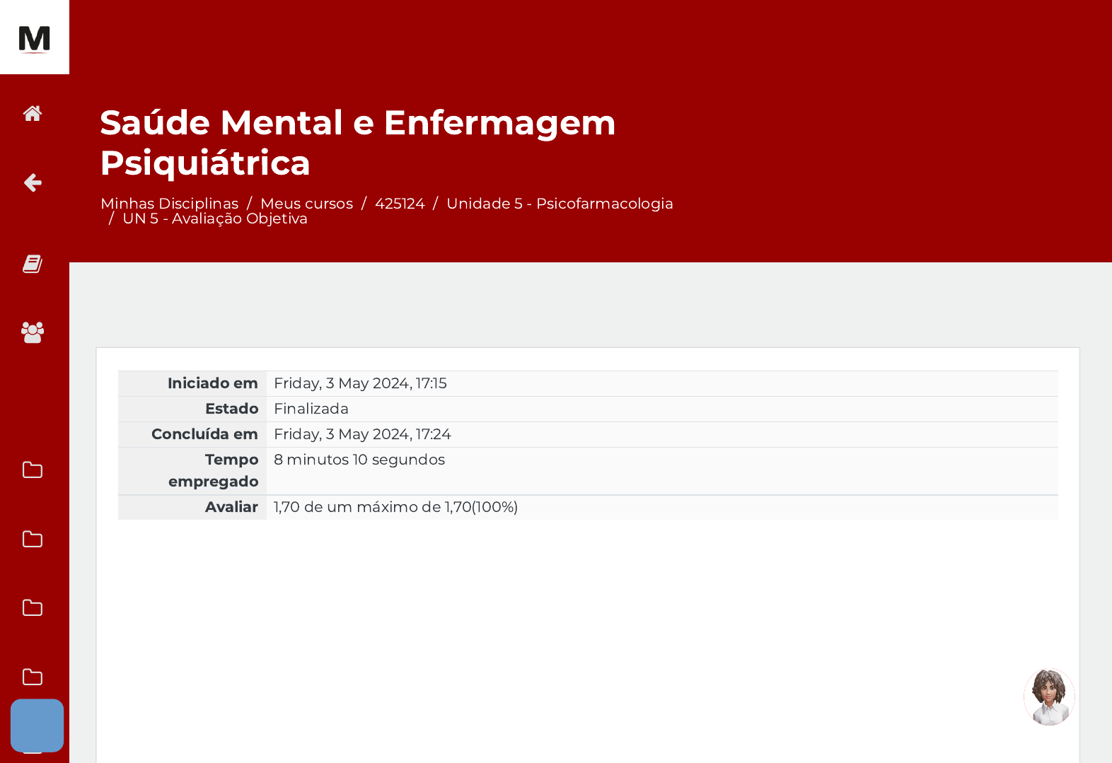 Minhas Disciplinas / Meus cursos / 425124 / Unidade 5 - Psicofarmacologia / UN 5 - Avaliação Objetiva Saúde Mental e Enfermagem Psiquiátrica Iniciado em Friday, 3 May 2024, 17:15 Estado Finalizada Concluída em Friday, 3 May 2024, 17:24 Tempo empregado 8 minutos 10 segundos Avaliar 1,70 de um máximo de 1,70(100%) https://avap.multivix.edu.br/my/ https://avap.multivix.edu.br/course/view.php?id=26623 https://avap.multivix.edu.br/course/view.php?id=26623§ion=6 https://avap.multivix.edu.br/mod/quiz/view.php?id=1646138 https://avap.multivix.edu.br/my/ https://avap.multivix.edu.br/course/view.php?id=26623 https://avap.multivix.edu.br/user/index.php?id=26623 https://avap.multivix.edu.br/course/view.php?id=26623§ion=1 https://avap.multivix.edu.br/course/view.php?id=26623§ion=2 https://avap.multivix.edu.br/course/view.php?id=26623§ion=3 https://avap.multivix.edu.br/course/view.php?id=26623§ion=4 https://avap.multivix.edu.br/course/view.php?id=26623§ion=5 https://avap.multivix.edu.br/ https://avap.multivix.edu.br/ https://avap.multivix.edu.br/ https://avap.multivix.edu.br/ https://avap.multivix.edu.br/ https://avap.multivix.edu.br/ https://avap.multivix.edu.br/ https://avap.multivix.edu.br/ https://avap.multivix.edu.br/ Questão 1 Correto Atingiu 0,34 de 0,34 Como estabilizador do humor, a carbamazepina é indicada para casos de mania aguda e distúrbios afetivos bipolares, e ainda trata epilepsias, neuralgias e síndromes de abstinência alcoólica. A dose usual no tratamento do humor é de 400-1600mg/dia (BRASIL, 2013). Fonte: BRASIL. Ministério da Saúde. Caderno de Atenção Básica nº 34. Saúde Mental. Ministério da Saúde: Brasília, 2013. Acerca dos efeitos indesejados da carbamazepina, classi�que V para as sentenças verdadeiras e F para as falsas: ( ) Prurido não é um efeito indesejado do uso de carbamazepina. ( ) Ataxia é a descoordenação de movimentos de diferentes partes do corpo levando à perda de equilíbrio, movimentos irregulares dos olhos, di�culdade para engolir e escrever, tremores excessivos. ( ) Sonolência e tontura. ( ) Diplopia. Escolha uma opção: a. F, V, V, V. b. F, V, F, V. c. F, F, F, F. d. V, V, F, F. e. V, V, V, V. https://avap.multivix.edu.br/ https://avap.multivix.edu.br/ https://avap.multivix.edu.br/ https://avap.multivix.edu.br/ https://avap.multivix.edu.br/ https://avap.multivix.edu.br/ https://avap.multivix.edu.br/ https://avap.multivix.edu.br/ https://avap.multivix.edu.br/ Questão 2 Correto Atingiu 0,34 de 0,34 Os inibidores seletivos da receptação da serotonina (ISRS), segundo Brasil (2013), são os antidepressivos mais novos, incluindo a �uoxetina. Esses agem sobre poucos sistemas de neurotransmissão, inibindo seletivamente a receptação da serotonina. Fonte: BRASIL. Ministério da Saúde. Caderno de Atenção Básica nº 34. Saúde Mental. Ministério da Saúde: Brasília, 2013. Observe alguns antidepressivos, a seguir, e correlacione-os às suas características: I – Amitriptilina. II – Clomipramina. III – Citalopram. IV – Fluoxetina. ( ) Indicado no tratamento antidepressivo e de transtornos de ansiedade na dosagem de 150-200mg. ( ) Inibidor seletivo da receptação da serotonina com dose de 20 mg. ( ) Antidepressivo tricíclico. Iniciar tratamento com 25 mg e ir aumentando 25 mg a cada 2/3 dias até o alcance do nível terapêutico (150-200 mg). ( ) Inibidor seletivo da receptação da serotonina com dose usual de 20 mg e meia-vida prolongada. Assinale a alternativa que corresponde à ordem de relação correta entre a primeira e a segunda colunas. Escolha uma opção: a. I, II, III, IV. b. IV, I, II, III. https://avap.multivix.edu.br/ https://avap.multivix.edu.br/ https://avap.multivix.edu.br/ https://avap.multivix.edu.br/ https://avap.multivix.edu.br/ https://avap.multivix.edu.br/ https://avap.multivix.edu.br/ https://avap.multivix.edu.br/ https://avap.multivix.edu.br/ c. II, IV, III, I. d. I, III, IV, II. e. II, III, I, IV. https://avap.multivix.edu.br/ https://avap.multivix.edu.br/ https://avap.multivix.edu.br/ https://avap.multivix.edu.br/ https://avap.multivix.edu.br/ https://avap.multivix.edu.br/ https://avap.multivix.edu.br/ https://avap.multivix.edu.br/ https://avap.multivix.edu.br/ Questão 3 Correto Atingiu 0,34 de 0,34 Mencionadas por Pereira (2021), as substâncias psicoativas agem no cérebro causando alterações nas sensações, estados emocionais e nível de consciência. São divididas em lícitas, ou seja, que podem ser comercializadas, e seu consumo é permitido por lei, como o álcool, os medicamentos e os cigarros; e ilícitas, em que o uso e a comercialização não têm regulamentação legal, como é o caso da cocaína, crack, maconha, entre outras. Fonte: PEREIRA, S. G. O uso de substâncias psicoativas. Vamos falar sobre isso? [S. l.]: Instituto Federal do Espírito Santo, 2021. Disponível em: https://prodi.ifes.edu.br/images/stories/agosto-psico.pdf. Acesso em: 11 mar. 2023. Acerca das drogas psicoativas, classi�que V para as verdadeiras e F para as falsas: ( ) As substâncias psicoativas podem ser classi�cadas em depressoras, estimulantes e perturbadoras. ( ) O crack é uma droga perturbadora do sistema nervoso central. ( ) O ecstasy é uma droga depressora do sistema nervoso central. ( ) O álcool e os opiáceos são drogas perturbadoras do sistema nervoso central. Escolha uma opção: a. V, F, F, F. b. V, V, V, V. c. F, V, F, V. d. V, F, V, F. e. F, F, F, F. https://prodi.ifes.edu.br/images/stories/agosto-psico.pdf https://avap.multivix.edu.br/ https://avap.multivix.edu.br/ https://avap.multivix.edu.br/ https://avap.multivix.edu.br/ https://avap.multivix.edu.br/ https://avap.multivix.edu.br/ https://avap.multivix.edu.br/ https://avap.multivix.edu.br/ https://avap.multivix.edu.br/ Questão 4 Correto Atingiu 0,34 de 0,34 Os estabilizadores de humor são aplicados nos seguintes casos: em episódios maníaco-depressivos; para potencializar os efeitos dos antidepressivos, principalme