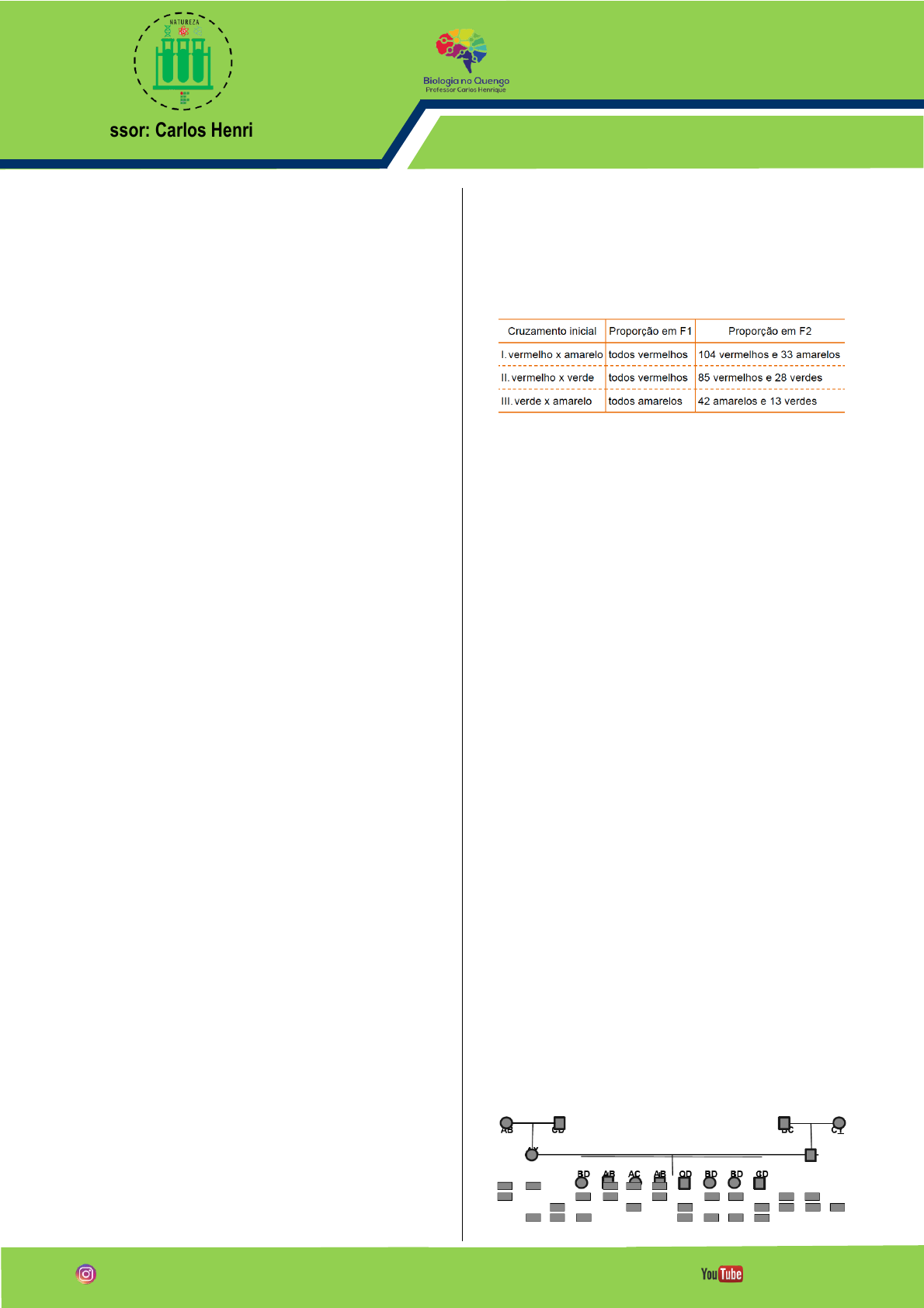 Professor: Carlos Henrique Genética – Polialelia II @ifrnnatureza IFRN Natureza BIOLOGIA Relação entre Genótipo e Fenótipo / Polialelia 01 - (IFMT/2018/Julho) Os coelhos podem apresentar 4 (quatro) fenótipos para cor da pelagem. Tal variação é determinada por quatro alelos diferentes: C, cch, ch e ca. Nesse caso, existe a seguinte relação de dominância: Aguti (C) exerce dominância sobre chinchila, himalaia e albino; chinchila (cch) exerce dominância sobre himalaia e albino; himalaia (ch) exerce dominância sobre albino; albino (ca) é recessivo, ou seja, só se expressa aos pares. Sendo assim, os genótipos para os diferentes tipos de coelho são: • CC, Ccch, Cch, Cca – Aguti ou selvagem • cchcch, cchch, cchca – Chinchila • chch, chca – Himalaia • caca – Albino Dessa forma, em um cruzamento de um macho Himalaia heterozigoto com uma fêmea Chinchila homozigota, a probabilidade de nascer um descendente Chinchila é de: a) 100% b) 75% c) 50% d) 25% e) 0% 02 - (UNIVAG MT/2017/Julho) A cor do fruto em uma espécie de planta é determinada por três alelos de um mesmo loco. Em um estudo, inicialmente, foram conduzidos cruzamentos entre plantas homozigóticas para a cor do fruto. Os indivíduos em cada geração F1 foram intercruzados e originaram a geração F2. As proporções fenotípicas obtidas desse cruzamento constam na tabela. A proporção fenotípica esperada do cruzamento de uma planta F1 descendente do cruzamento II com uma planta F1 descendente do cruzamento III será de a) 50% vermelhos, 25% verdes e 25% amarelos. b) 50% vermelhos e 50% amarelos. c) 75% vermelhos e 25% amarelos. d) 100% vermelhos. e) 75% vermelhos e 25% verdes. 03 - (UCS RS/2015/Janeiro) Analise o heredograma e a análise genética abaixo. Se estiverem presentes quatro alelos em um dado lócus denominados “A”, “B”, “C”, “D”, inicialmente, com os avós, pode-se traçar a herança de cada alelo pelos genitores até os netos. Fonte: Passarge, E. Genética: texto e atlas. 2. ed., Porto Alegre: Artmed, 2004. (Adaptado.) Professor: Carlos Henrique Genética – Polialelia II @ifrnnatureza IFRN Natureza BIOLOGIA Sobre o heredograma, conclui-se que a) os quatro avós são heterozigotos. b) os pais, uma vez que são heterozigotos para alelos diferentes, terão todos os filhos heterozigotos. c) o alelo representado pelo X é o alelo C. d) o alelo representado pelo Y é o alelo D. e) o heredograma representa uma situação de codominância. 04 - (UDESC SC/2009/Julho) A herança da cor da pelagem em coelhos com fenótipo Selvagem (genótipo CC, Ccch, Cch e Cc), Chinchila (Genótipo cchcch, cchch e cchc), Himalaia (Genótipo chch e chc) e albino (cc) é uma condição de monohibridismo relacionado a alelos múltiplos. Assinale a alternativa que corresponde ao percentual de fenótipo resultante do cruzamento de um coelho de pelagem Chinchila (genótipo cch ch) com um coelho de pelagem Himalaia (genótipo chch). a) 25% Chinchila, 50% Himalaia e 25% Selvagem b) 75% Chinchila e 25% Himalaia c) 50% Chinchila e 50% Himalaia d) 75% Chinchila e 25% Selvagem e) 25% Chinchila e 75% Himalaia 05 - (UNESP SP/2009/Julho) Nas populações de organismos diploides, alguns caracteres são determinados por mais de dois tipos de alelos, existindo, portanto, múltiplos alelos para cada lócus gênico. Como exemplo, pode-se citar a pelagem em coelhos, que é determinada por quatro tipos de genes alelos: C, que expressa a cor aguti ou selvagem; Cch, que expressa a cor chinchila; Ch, a cor himalaia; e Ca, a cor albina. Esses genes também apresentam relação de dominância entre si, sendo C > Cch > Ch > Ca. Considerando que a expressão desses genes também obedece à 1.ª Lei de Mendel, explique de que forma mais de dois alelos podem surgir e qual a vantagem da existência dos alelos múltiplos para as espécies? 06 - (UFRN/2009) Para o sucesso do transplante de órgãos, é necessário que haja compatibilidade imunológica entre o doador e o receptor. Isso envolve um conjunto de moléculas, chamadas HLA (Antígeno Leucocitário Humano), que são codificadas por genes com alelos múltiplos (polialelia), expressos de forma co-dominante. Sendo assim, os genes HLA apresentam um fenômeno no qual a) os alelos paternos são expressos em 50% dos descendentes. b) os alelos não são expressos em heterozigose. c) ambos os alelos se manifestam simultaneamente. d) um par de alelos determina mais de dois caracteres simultaneamente. 07 - (UNIOESTE PR/2006) Professor: Carlos Henrique Genética – Polialelia II @ifrnnatureza IFRN Natureza BIOLOGIA O caráter coloração de pêlos (preto, amarelo ou branco) da espécie Hipoteticus hipotetica é condicionado por apenas um gene. Dos seguintes cruzamentos entre animais puros, obteve-se: pretos x amarelos (F1:100% pretos, F2: 75% pretos e 25% amarelos), preto x branco (F1: 100% pretos, F2: 75% pretos e 25% brancos), amarelo x branco (F1: 100% amarelos, F2: 75% amarelos e 25% brancos), branco x branco (F1 e F2: 100% brancos). A partir destes cruzamentos, é correto afirmar que: 01. trata-se de uma herança com epistasia do alelo para coloração preta sobre o alelo para coloração amarela. 02. trata-se de uma herança monogênica com polialelismo. 04. trata-se de uma herança monogênica com dominância completa entre os alelos para coloração preta > coloração amarela > coloração branca. 08. trata-se de uma herança monogênica com co- dominância entre os alelos para coloração preta e branca. 16. trata-se de uma herança monogênica com dominância incompleta entre os alelos para coloração preta e amarela. 32. do cruzamento entre o heterozigoto (F1) de animais puros pretos x puros amarelos com o heterozigoto (F1) de animais puros amarelos x puros brancos, espera-se uma prole de 50% pretos, 25% amarelos e 25% brancos. 64. do cruzamento entre o heterozigoto (F1) de animais puros pretos x puros amarelos com o heterozigoto (F1) de animais puros pretos x puros br