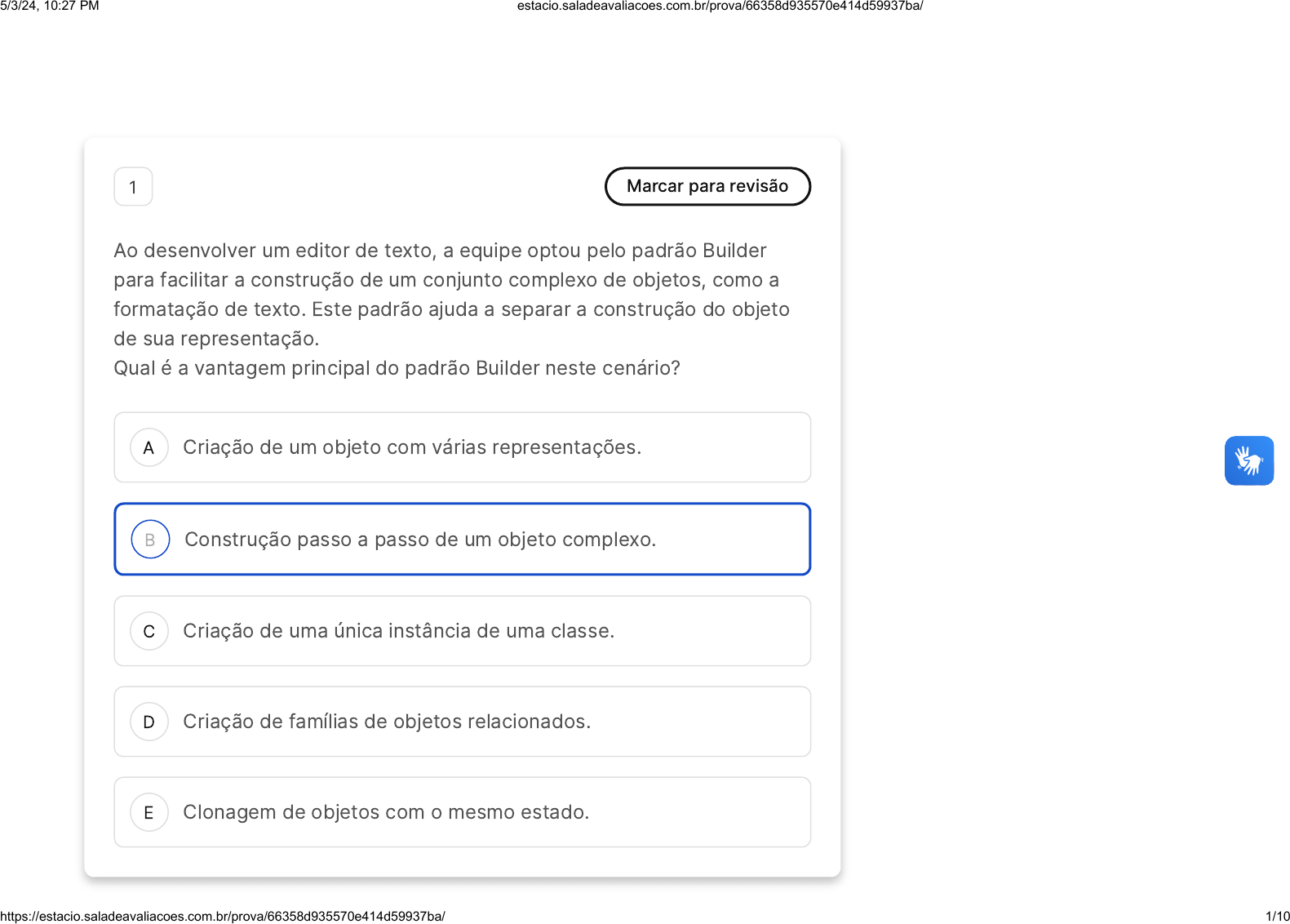 A B C D E 1 Marcar para revisão Ao desenvolver um editor de texto, a equipe optou pelo padrão Builder para facilitar a construção de um conjunto complexo de objetos, como a formatação de texto. Este padrão ajuda a separar a construção do objeto de sua representação. Qual é a vantagem principal do padrão Builder neste cenário? Criação de um objeto com várias representações. Construção passo a passo de um objeto complexo. Criação de uma única instância de uma classe. Criação de famílias de objetos relacionados. Clonagem de objetos com o mesmo estado. 5/3/24, 10:27 PM estacio.saladeavaliacoes.com.br/prova/66358d935570e414d59937ba/ https://estacio.saladeavaliacoes.com.br/prova/66358d935570e414d59937ba/ 1/10 A B C D E 2 Marcar para revisão Para um sistema de automação residencial, o padrão Abstract Factory é usado para criar diferentes tipos de dispositivos inteligentes, como lâmpadas e termostatos, sem depender de implementações específicas. Isso permite a fácil integração de novos dispositivos no sistema. Qual é a principal funcionalidade do padrão Abstract Factory neste sistema de automação? Permite a clonagem de objetos mantendo suas propriedades. Constrói objetos complexos de forma sequencial. Centraliza a gestão de operações de vários objetos. Garante a existência de apenas uma instância de uma classe. Cria famílias de objetos sem especificar suas classes concretas. 5/3/24, 10:27 PM estacio.saladeavaliacoes.com.br/prova/66358d935570e414d59937ba/ https://estacio.saladeavaliacoes.com.br/prova/66358d935570e414d59937ba/ 2/10 A B C D E 3 Marcar para revisão Que padrão pode ser utilizado na implementação de uma estrutura hierárquica de diretório, em que existam pastas que podem conter pastas ou arquivos, sendo que algumas operações com as pastas devem ser aplicadas de forma recursiva aos elementos que fazem parte dela, isto é, outras pastas e arquivos? Composite Adapter Proxy Facade Flyweight 4 Marcar para revisão 5/3/24, 10:27 PM estacio.saladeavaliacoes.com.br/prova/66358d935570e414d59937ba/ https://estacio.saladeavaliacoes.com.br/prova/66358d935570e414d59937ba/ 3/10 A B C D E Sobre o padrão Composite, assinale a alternativa correta: Esse padrão é utilizado na composição de adaptadores para serviços implementados por componentes de terceiros. Esse padrão é orientado para construção e manipulação de grafos cíclicos de objetos. O conceito de polimorfismo não está presente na solução proposta pelo padrão. Esse padrão permite manipular agregados e seus elementos com uma interface uniforme, isto é, com as mesmas operações. Esse padrão é apropriado para situações em que operações sobre o todo não devam ser aplicadas de forma recursiva às suas partes. 5 Marcar para revisão Você está implementando um sistema e quer guardar o histórico de todas as requisições efetuadas pelo usuário via interface gráfica, de forma a 5/3/24, 10:27 PM estacio.saladeavaliacoes.com.br/prova/66358d935570e414d59937ba/ https://estacio.saladeavaliacoes.com.br/prova/66358d935570e414d59937ba/ 4/10 A B C D E poder realizar operações, como desfazer (undo) e refazer (redo) requisições. Assinale a alternativa com o nome do padrão mais indicado para ser aplicado nesse contexto: Chain of Responsibility Strategy Mediator Command State 6 Marcar para revisão Assinale a alternativa que expressa a intenção do padrão de projeto Template Method: 5/3/24, 10:27 PM estacio.saladeavaliacoes.com.br/prova/66358d935570e414d59937ba/ https://estacio.saladeavaliacoes.com.br/prova/66358d935570e414d59937ba/ 5/10 A B C D E Encapsular uma família de algoritmos em objetos, permitindo que os módulos clientes possam utilizar esses algoritmos de forma intercambiável. Implementar a estrutura de um algoritmo genérico em uma superclasse, considerando que os passos comuns são implementados na própria superclasse, enquanto os passos específicos são implementados nas suas subclasses. Definir uma relação de dependência entre objetos, de modo a garantir que modificações no estado do objeto detentor da informação sejam notificadas automaticamente para os objetos inscritos previamente como interessados em receber essas notificações. Permite capturar o estado interno de um objeto, permitindo que o seu estado seja restaurado posteriormente, sem quebrar o encapsulamento desse objeto. Encapsular uma requisição em um objeto, permitindo o registro do histórico de requisições disparadas pelos módulos cliente e a criação de filas de requisições. 5/3/24, 10:27 PM estacio.saladeavaliacoes.com.br/prova/66358d935570e414d59937ba/ https://estacio.saladeavaliacoes.com.br/prova/66358d935570e414d59937ba/ 6/10 A B C D E 7 Marcar para revisão "Ao invés de colocarmos o cálculo do frete de um pedido na classe Pedido, optamos por criar uma hierarquia de classes para encapsular os diferentes algoritmos de cálculo de frete que temos no sistema". Assinale a alternativa com o nome do padrão GRASP que recomenda a criação de classes que não representam diretamente elementos concretos encontrados no domínio no negócio, seguindo uma decomposição de responsabilidades por comportamento e não por representação, como a descrita no cálculo do frete. Invenção Pura. Especialista na Informação. Polimorfismo. Acoplamento Baixo. Indireção. 5/3/24, 10:27 PM estacio.saladeavaliacoes.com.br/prova/66358d935570e414d59937ba/ https://estacio.saladeavaliacoes.com.br/prova/66358d935570e414d59937ba/ 7/10 A B C D E 8 Marcar para revisão Uma mudança essencial no modelo de programação Java, com a evolução do JEE, foi o uso de anotações nas diversas tarefas de configuração dos EJBs do aplicativo. Para que serve a anotação Local no ambiente de criação de EJBs? Definir um Stateless Session Bean. Definir um contexto de persistência local para o Session Bean. Definir a interface de acesso às entidades do JPA. Definir um Stateful Session Bean. Definir a 