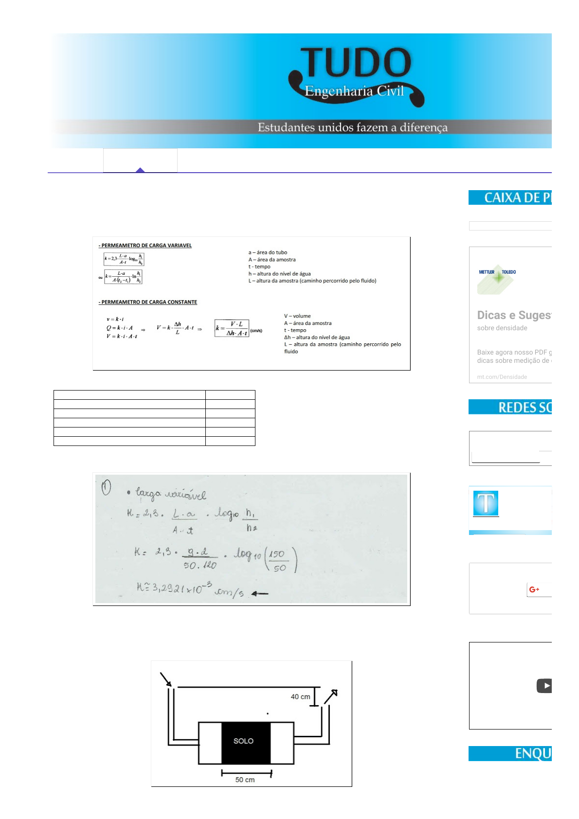 01/12/2016 Tudo Engenharia Civil: Constante de permeabilidade Exercícios resolvidos http://www.tudoengcivil.com.br/2015/06/constantedepermeabilidadeexercicios.html 1/4 Página Inicial Videoaulas e Tutoriais *novidade Variedades Indice Sobre Contato Constante de permeabilidade ‐ Exercícios resolvidos Fórmulas para constante de permeabilidade dos solos (k) 1 ‐ Realizou‐se um ensaio de permeabilidade numa amostra de areia em que obtiveram os seguintes resultados: Altura d’água inicial 150 cm Altura d’água final 50 cm Tempo decorrido 2 min Área da seção transversal do tubo de carga 2 cm² Área da seção transversal do corpo de prova 50 cm² Altura do corpo de prova 9 cm Determine a Constante de Permeabilidade da areia em questão: 2‐ A figura seguinte representa um permeâmetro de carga constante utilizado para determinação do coeficiente de permeabilidade dos solos. Determine o valor do coeficiente de permeabilidade determinado para as condições mostradas na figura, sabendo‐se que a vazão percolada pelo solo vale Q= 0,3 cm³/s, e que a área da amostra é igual a 706 cm². Dicas e Sugestões Grátis sobre densidade Baixe agora nosso PDF gratuito com dicas sobre medição de densidade! mt.com/Densidade Tudo Engenharia Civil 44 vídeos Inscreverse 999+ Tudo Engenhari 3 mil curtidas Tudo Engenharia Civil + 381 Seguir Siga nossa página no Google+ AS OBRAS MAIS INCRÍVEIS D Último video lançado em nosso canal: O TudoEngCivil também está no YouTube e gostaríamos da sua opinião, que tipo de vídeo você prefere? Matérias disponíveis http://www.tudoengcivil.com.br/ http://www.tudoengcivil.com.br/ http://www.tudoengcivil.com.br/search/label/VideoAulas http://www.tudoengcivil.com.br/search/label/Variedades http://www.tudoengcivil.com.br/2014/10/indice-do-blog-tudo-engenharia-civil.html http://www.tudoengcivil.com.br/2014/06/sobre.html http://www.tudoengcivil.com.br/2014/06/contato.html http://1.bp.blogspot.com/-lUY4iwo62yQ/VX4efIqkLYI/AAAAAAAADU8/k3RcDYMXidc/s1600/formulas.jpg http://1.bp.blogspot.com/-X47Ft9BZiIo/VX41y35hjVI/AAAAAAAADVs/LH2KDhPgU_E/s1600/%252C%2B-%2BC%25C3%25B3pia%2B%25282%2529.jpg http://4.bp.blogspot.com/-v5ZmhZnQUM8/VX4liC7LcwI/AAAAAAAADVM/WScKZNpQM0Y/s1600/2.jpg https://www.googleadservices.com/pagead/aclk?sa=L&ai=CeobmSiJAWL_5HcyJxgTc_7DgBeTTnKZHlICb4_MD6IeFngsQASCd8-QlYM341Y_kAqAB3O-Q-wPIAQmpArFCx5cbz7E-qAMByAPDBKoExAFP0DhxzTWs8w4riNxajZcyaQvrcpoEsN4qZQ_3JSjpVSC8DT_sMES5uKn_9QvnUmSBy7YIhi2DnK0RIqaMDrmfUjD0ZuM40qBqeD8IPDc-EigHDaw0oMesQ7iRx_ZMUOOMXNN4ORBOl-RbTwDU9cGuTv8YclUmiad5_cCML9hP3C0Yt2Tx8CiGMIaDs-xCEzeOlflp_sjqZYqKnUoHzrPVoOKzyGTsxZzoDsTSfI_oLcFOyMtwZZ-D4SDriVpvllD4vosRiAYBoAYugAeiwN0kqAemvhvYBwDSCAUIgAEQAQ&num=1&cid=CAASEuRoDiua5I1LDY9f_bN8VB_-Gg&sig=AOD64_17X40VBTXtbGOtetlSwgUv9qSjYw&client=ca-pub-3220654621754852&adurl=http://www.mt.com/global/pt/home/campaigns/product-organizations/lab/div/LAB/dere/density-hints.html%3Fcmp%3Ddp_04250923%26bookedkeyword%3Ddensidade%26matchtype%3D%26adtext%3D153448383063%26placement%3Dwww.tudoengcivil.com.br%26network%3Dd https://www.youtube.com/user/tudoengcivil?feature=sub_widget_1 https://www.facebook.com/tudoengcivil/ https://www.facebook.com/tudoengcivil/ https://www.facebook.com/tudoengcivil/ https://plus.google.com/+TudoengcivilBr?prsrc=5 https://www.youtube.com/watch?v=obFUCSRe5gw 01/12/2016 Tudo Engenharia Civil: Constante de permeabilidade Exercícios resolvidos http://www.tudoengcivil.com.br/2015/06/constantedepermeabilidadeexercicios.html 2/4 3‐ Em um permeâmetro de nível constante, 6x10^‐5 m³ de água percola através de uma amostra cilíndrica de 0,13 m de altura e 0,07 m de diâmetro, durante um período de 1,5 minutos, com um nível efetivo de 0,30 m. Qual é o coeficiente de permeabilidade da amostra, em cm/s , na temperatura do ensaio? 4‐ O permeâmetro da figura possui seção transversal de 530 cm². Determine a permeabilidade do solo cujo peso específico é 18 kN/m³. Em 18 s, o volume de água que passou pelo permeâmetro foi de 100 cm³. *Obs: desenho obviamente fora de escala, porém, as cotas estão indicadas. Não encontrou o que procurava? Talvez isso te ajude: VideoAulas (Estática, Resistencia 1 e 2, Concreto Armado e etc.) Curiosidades e explicações (Sobre o curso e a profissão) Tutoriais (Ftool, AutoCad, Macetes de calculadoras e etc) Novidades (Novos materiais, novas ferramentas e etc) VideoAulas e Tutoriais Curiosidades e Novidades Todas as alternativas possíveis Votos até o momento: 381 Enquete encerrada http://3.bp.blogspot.com/-th6PkG2M2Fw/VX41ygzUjYI/AAAAAAAADVo/ISuamKEPESM/s1600/%252C%2B-%2BC%25C3%25B3pia%2B%25283%2529.jpg http://1.bp.blogspot.com/-a8OXC08kNvI/VX41zCzQGmI/AAAAAAAADVw/utFuG5gcpIE/s1600/%252C%2B-%2BC%25C3%25B3pia.jpg http://4.bp.blogspot.com/-ku0fk9_LceA/VX4z98xDYZI/AAAAAAAADVc/AajvAQpABiI/s1600/4.jpg http://3.bp.blogspot.com/-dylEx0IWPSg/VX41zWW70aI/AAAAAAAADV4/6fGtRp_36Sc/s1600/%252C.jpg http://www.mediafire.com/?83430x3l4660o http://netocortes.com.br/ 01/12/2016 Tudo Engenharia Civil: Constante de permeabilidade Exercícios resolvidos http://www.tudoengcivil.com.br/2015/06/constantedepermeabilidadeexercicios.html 3/4 8 tipos de ensaios de Mecânica dos ... Ensaios de densidade e massa especi... Ensaio suporte californiano CBR Ensaio de compressão triaxial Ensaio de cisalhamento direto Ensaio de limite de liquidez e plas... Marcadores: constante de permeabilidade, Mecânica dos solos, permeabilidade, permeâmetro +1 Recomende isto no Google Sair Notifiqueme Digite seu comentário... Comentar como: DIOGO LUZ (Google) Publicar Visualizar Duvidas, criticas ou sugestões? Deixe seu comentário 6 Comentários: Unknown 27 DE NOVEMBRO DE 2015 10:38 Muito Grato! vlw... Responder Fabricio 13 DE MAIO DE 2016 17:13 Muito bom Responder Unknown 9 DE JUNHO DE 2016 23:27 muitoooooooooooo obrigada! Responder Junior 27 DE SETEMBRO DE 2016 18:01 A área do cilindro no exercício 3 não seria A= 2 * PI * r * (r + h) ? Responder Cléo Valentim 5 DE 