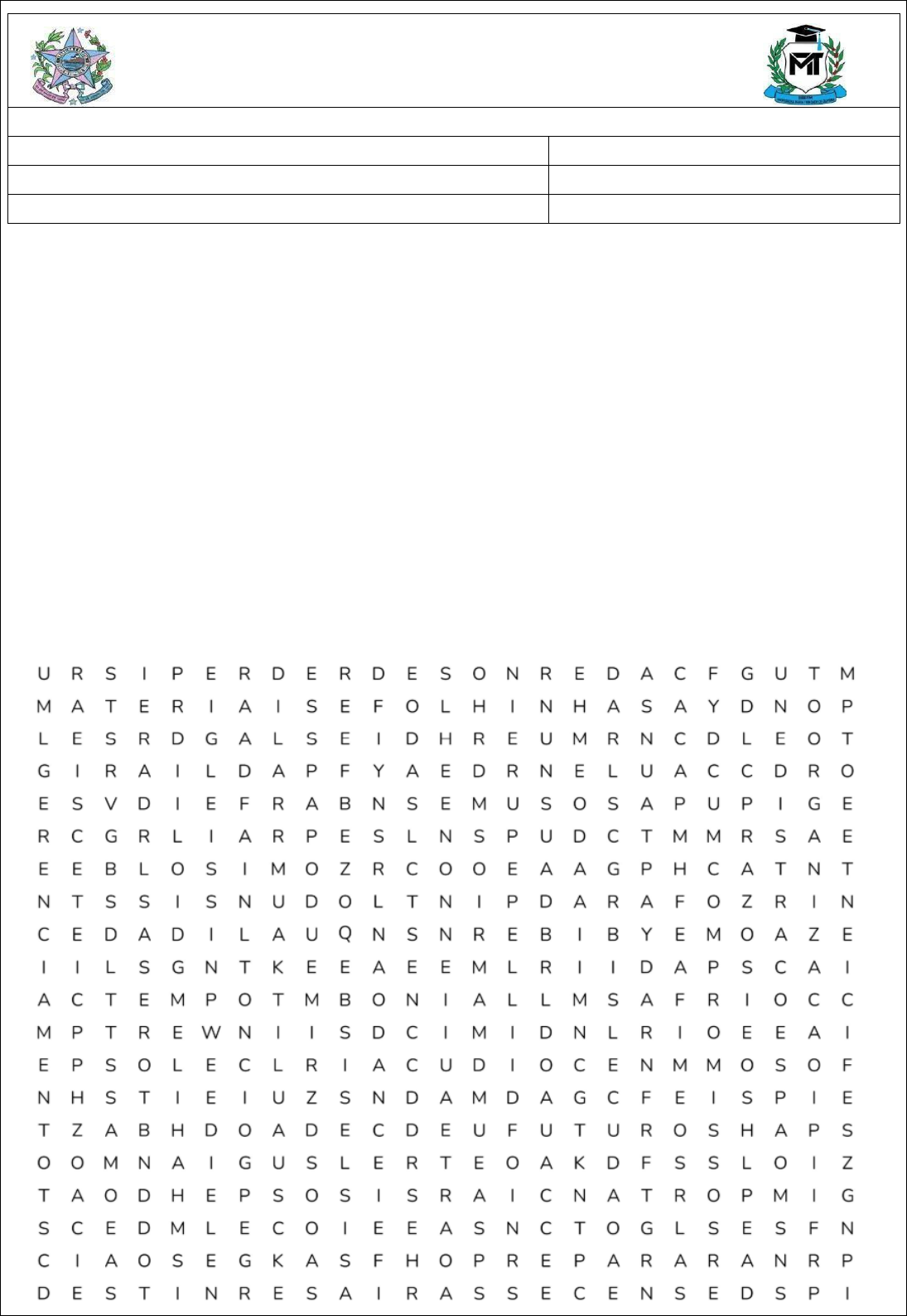A IMPORTÂNCIA DA ORGANIZAÇÃO NOS ESTUDOS Queridos alunos: A sala de aula é o nosso espaço de aprendizado, onde exploramos novos conhecimentos e expandimos nossas habilidades. Para garantir que esse processo seja eficaz e produtivo, é essencial manter nossos materiais escolares organizados. A organização dos materiais não é apenas sobre manter as coisas em ordem, mas sim sobre criar um ambiente propício para o aprendizado. Quando nossos cadernos, livros, “folhinhas” e materiais estão em seus devidos lugares, podemos nos concentrar melhor nas tarefas, aproveitar o tempo de estudo de forma mais eficiente e evitar distrações desnecessárias. Além disso, a organização nos ajuda a cumprir prazos e compromissos. Ao saber onde encontrar nossos recursos rapidamente, podemos iniciar as tarefas sem perder tempo procurando por materiais perdidos. Isso nos permite completar nossas atividades dentro do prazo estabelecido, desenvolvendo assim habilidades importantes de gerenciamento de tempo e responsabilidade. Portanto, lembrem-se sempre da importância da organização em suas vidas acadêmicas. Cultivar o hábito de manter seus materiais escolares organizados não só facilitará seu processo de aprendizagem, mas também os preparará para enfrentar desafios futuros de forma mais eficaz. Vamos juntos trabalhar para uma organização eficiente e um aprendizado de qualidade! Atenciosamente, professora Sandra. Encontre as palavras destacadas no texto, no caça-palavras abaixo: E. E. E. F.M. Professora Maria Trindade de Oliveira Ibatiba - ES Atividades Disciplina: Língua Portuguesa Série: Professora: Sandra Turma: Estudante: Data: