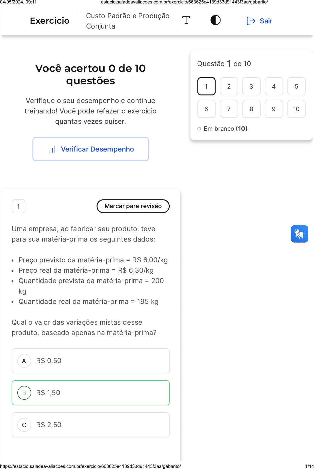 Você acertou 0 de 10 questões Verifique o seu desempenho e continue treinando! Você pode refazer o exercício quantas vezes quiser. Verificar Desempenho A B C 1 Marcar para revisão Uma empresa, ao fabricar seu produto, teve para sua matéria-prima os seguintes dados: Preço previsto da matéria-prima � R$ 6,00/kg Preço real da matéria-prima � R$ 6,30/kg Quantidade prevista da matéria-prima � 200 kg Quantidade real da matéria-prima � 195 kg Qual o valor das variações mistas desse produto, baseado apenas na matéria-prima? R$ 0,50 R$ 1,50 R$ 2,50 Questão 1 de 10 Em branco �10� 1 2 3 4 5 6 7 8 9 10 Exercicio Custo Padrão e Produção Conjunta Sair 04/05/2024, 09:11 estacio.saladeavaliacoes.com.br/exercicio/663625e4139d33d91443f3aa/gabarito/ https://estacio.saladeavaliacoes.com.br/exercicio/663625e4139d33d91443f3aa/gabarito/ 1/14 D E R$ 3,50 R$ 4,50 Questão não respondida Opa! A alternativa correta é a letra B. Confira o gabarito comentado! Gabarito Comentado A variação mista é calculada pela diferença entre o custo real e o custo padrão, levando em consideração tanto o preço quanto a quantidade. Neste caso, o custo real é o preço real da matéria-prima multiplicado pela quantidade real �R$ 6,30/kg * 195 kg � R$ 1228,50�. O custo padrão é o preço previsto da matéria-prima multiplicado pela quantidade real �R$ 6,00/kg * 195 kg � R$ 1170,00�. Portanto, a variação mista é R$ 1228,50 � R$ 1170,00 � R$ 58,50. No entanto, como a questão pede o valor por quilo, dividimos R$ 58,50 por 39 kg (diferença entre a quantidade real e a quantidade prevista), resultando em R$ 1,50/kg. Portanto, a alternativa correta é a B� R$ 1,50. 2 Marcar para revisão Analise os dados da tabela a seguir, que representa dois coprodutos: Produto 1 Produto 2 Valor de Venda R$ 5,00 R$ 3,00 04/05/2024, 09:11 estacio.saladeavaliacoes.com.br/exercicio/663625e4139d33d91443f3aa/gabarito/ https://estacio.saladeavaliacoes.com.br/exercicio/663625e4139d33d91443f3aa/gabarito/ 2/14 A B C D E Quantidade 1500 2000 Ponderação 2 3 Custo Total R$ 10.000,00 Qual é o valor do custo a ser alocado no produto 1 pelo método da igualdade do lucro bruto? R$ 4.250,00 R$ 5.250,00 R$ 5.750,00 R$ 6.750,00 R$ 7.250,00 Questão não respondida Opa! A alternativa correta é a letra C. Confira o gabarito comentado! Gabarito Comentado Para encontrar o valor do custo a ser alocado no produto 1 pelo método da igualdade do lucro bruto, é necessário considerar a ponderação dos produtos e o custo total. Nesse caso, a ponderação do produto 1 é 2 e do produto 2 é 3, totalizando 5. O custo total é de R$ 10.000,00. Portanto, alocando o custo proporcionalmente à ponderação, temos que o custo do produto 1 é de 2/5 do custo 04/05/2024, 09:11 estacio.saladeavaliacoes.com.br/exercicio/663625e4139d33d91443f3aa/gabarito/ https://estacio.saladeavaliacoes.com.br/exercicio/663625e4139d33d91443f3aa/gabarito/ 3/14 A B C D E total, ou seja, R$ 5.750,00. Portanto, a alternativa correta é a C� R$ 5.750,00. 3 Marcar para revisão Analise os dados da tabela a seguir, que representa dois coprodutos: Produto 1 Produto 2 Valor de Venda R$ 5,00 R$ 3,00 Quantidade 1500 2000 Ponderação 2 3 Custo Total R$ 10.000.00 Qual é o valor do custo a ser alocado no produto 2 pelo método do volume produzido? R$ 4.714,29 R$ 5.714,29 R$ 6.714,29 R$ 7.714,29 R$ 8.714,29 04/05/2024, 09:11 estacio.saladeavaliacoes.com.br/exercicio/663625e4139d33d91443f3aa/gabarito/ https://estacio.saladeavaliacoes.com.br/exercicio/663625e4139d33d91443f3aa/gabarito/ 4/14 Questão não respondida Opa! A alternativa correta é a letra B. Confira o gabarito comentado! Gabarito Comentado Para encontrar o valor do custo a ser alocado no produto 2 pelo método do volume produzido, é necessário considerar a proporção de produção de cada produto em relação ao total. No caso, a quantidade de produto 2 é de 2000 unidades, enquanto a quantidade total de produtos (produto 1 � produto 2� é de 3500 unidades. Portanto, a proporção do produto 2 é de 2000/3500, ou seja, aproximadamente 0,57. Multiplicando essa proporção pelo custo total �R$ 10.000,00�, obtemos o valor de R$ 5.714,29, que é o custo a ser alocado no produto 2. Portanto, a alternativa correta é a B� R$ 5.714,29. 4 Marcar para revisão Uma empresa, ao fabricar seu produto, teve para sua matéria-prima os seguintes dados: Preço previsto da matéria-prima � R$ 6,00/kg Preço real da matéria-prima � R$ 6,30/kg Quantidade prevista da matéria-prima � 200 kg Quantidade real da matéria-prima � 195 kg Qual o valor das variações de preço desse produto, baseado apenas na matéria-prima? 04/05/2024, 09:11 estacio.saladeavaliacoes.com.br/exercicio/663625e4139d33d91443f3aa/gabarito/ https://estacio.saladeavaliacoes.com.br/exercicio/663625e4139d33d91443f3aa/gabarito/ 5/14 A B C D E Variação favorável de R$ 28,50. Variação desfavorável de R$ 1,50. Variação favorável de R$ 1,50. Variação desfavorável de R$ 0,30. Variação desfavorável de R$ 28,50. Questão não respondida Opa! A alternativa correta é a letra E. Confira o gabarito comentado! Gabarito Comentado Para encontrar a variação de preço do produto, baseado apenas na matéria- prima, é necessário calcular o custo previsto e o custo real. O custo previsto é calculado multiplicando a quantidade prevista da matéria-prima pelo preço previsto, resultando em R$ 1200,00 �200 kg x R$ 6,00/kg). O custo real é calculado multiplicando a quantidade real da matéria- prima pelo preço real, resultando em R$ 1228,50 �195 kg x R$ 6,30/kg). A variação é então calculada subtraindo o custo previsto do custo real �R$ 1228,50 � R$ 1200,00�, resultando em uma variação desfavorável de R$ 28,50. Isso significa que o custo real foi R$ 28,50 maior do que o custo previsto, indicando uma variação desfavorável para a empresa. 04/05/2024, 09:11 estacio.saladeavaliacoes.com.br/exercicio/663625e