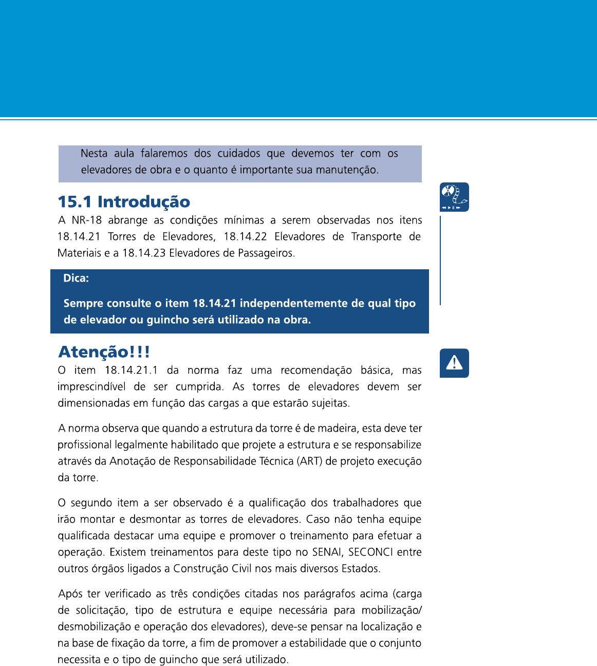 e-Tec Brasil73 Aula 15 - Elevadores de obras Aula 15 - Elevadores de obras Você sabia que o item 18.35 solicita Regulamentos Técnicos de Procedimentos que foram realizados pela Fundacentro. A RTP-05, por exemplo, dá muitas informações sobre Instalações elétricas, a RTP-02 elevadores de Obra. Procure saber mais sobre elas. Indústria da Construção Civile-Tec Brasil 74 O elevador de obra tem muitas minúcias a serem observadas. Para se ter total conhecimento sobre estas minúcias, vale a pena ler a Recomendação técnica de procedimentos - RTP 02, da FUNDACENTRO. e-Tec Brasil75 O posto do operador deve ser isolado, dispor de proteção contra queda de materiais e os assentos devem tender a NR-17. O operador deve ser qualificado de acordo com os requisitos da NR-18. Sistema comum para acionamento (quadro de lâmpadas). Deve ser dotado de chave de partida e bloqueio que impeça o seu acionamento por pessoa não- autorizada. Quando houver irregularidades no elevador de materiais quanto ao seu funcionamento e manutenção do mesmo, estas serão anotadas pelo operador em livro próprio e comunicadas, por escrito, ao responsável da obra. Posto do operador Quando houver transporte de carga o comando deve ser externo. Deve ser fixada uma placa no interior do elevador contendo a indicação de carga máxima e a proibição de transporte simultâneo. Em todos os acessos à torre do elevador deve ser instalada uma barreira (cancela) de, no mínimo, 1,80m. Rampas de acesso. Freio manual situado dentro da cabina, interligado ao interruptor de corrente, que quando acionado desligue o motor. Dispositivo de segurança que impeça a abertura da barreira (cancela) quando o elevador não estiver no nível do pavimento. Os dipositivos de acionamento devem estar presentes em todos os andares. CONDIÇÃO ABAIXO DO PADRÃO - situações presentes no ambiente de trabalho que favorecem a concre- tizaçãodo risco à integridade física e/ou mental do trabalhador. São deficiências técnicas e/ou gerenciais. Dispositivos de segurança para elevador de carga e passageiros Aula 15 - Elevadores de obras Indústria da Construção Civile-Tec Brasil 76 O estaiamento ou fixação das torres à estrutura da edificação devem ser a cada laje ou pavimento. A distância entre a cabine e o topo da torre deve ser de 4m. As torres de elevadores de materiais devem ser revestidas de tela gavalnizada quando a cabine não possuir fechamento completo. A estrutura da torre deve estar aterrada eletricamente. Os elementos estruturais, componentes da torre, devem estar em perfeito estado. Deve possuir sistema de segurança eletromecânico situado a 2m abaixo da viga superior da torre, ou outro sistema que impeça o choque da cabina com a torre. O elevador de passageiros deve ser instalado, ainda a partir da execução da 7ª laje dos edifícios em construção com 8 ou mais pavimentos, ou altura equivalente. Torre de elevadores Anotações ____________________________________________ ____________________________________________ ____________________________________________ ____________________________________________ ____________________________________________ ____________________________________________ ____________________________________________ ____________________________________________ ____________________________________________