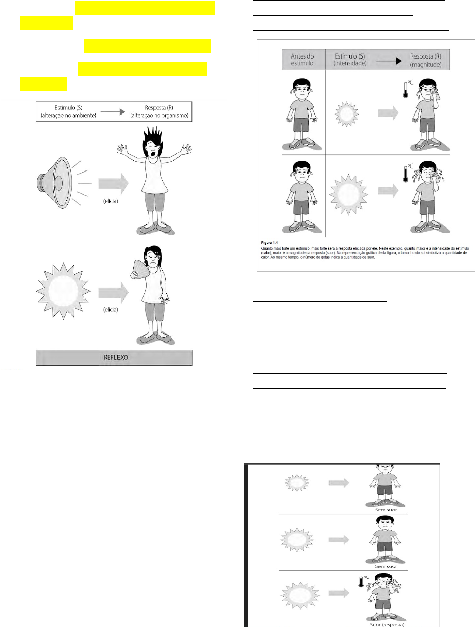 Reflexo inato O reflexo inato é aquilo que nasce com a gente, algo biológico. Obs: inato é um estimulo incondicionado. No reflexo inato temos: Estímulo = é a parte ou mudança no ambiente. Resposta = mudança no organismo. Reflexo = relação entre estimulo e resposta Temos também a intensidade e a magnitude. Intensidade = é a quantidade de estimulo. Magnitude = é a quantidade de resposta. Leis do reflexo 1ª Lei da intensidade e magnitude. A medida em que a intensidade vai aumentando, a magnitude da resposta também aumenta, ou seja, diretamente proporcional. 2ª Lei do limiar Estabelece que para todo reflexo, é necessária uma intensidade mínima do estimulo para que a resposta seja eliciada. Ex: precisa de uma quantidade mínima de corrente elétrica, para causar uma contração muscular. 3ª Lei da latência = Latência ou tempo de reação. No caso, latência é o tempo decorrido entre a apresentação dos estímulos e a ocorrência da resposta. Características do reflexo · Habituação do reflexo = após uma sequencia de estimulo sucessivos com a mesma intensidade, diminuirá a magnitude, ocorrendo a habituação. (diminui a resposta). · Potenciação do reflexo = aumenta a resposta. Ex: queimar a palma da mão, e todo dia receber um estimulo na mão, aquela dor irá se potencializar. Reflexo aprendido É aprender a associar um estímulo É uma forma de aprendizagem em que um estímulo previamente neutro passa, após o emparelhamento com um estímulo incondicionado, a eliciar uma resposta condicionada. Reflexo condicionado é uma relação entre o estimulo condicionado e uma resposta condicionada. Como o cachorro aprende as coisas? · Estimulo neutro (NS). · Estimulo condicionado (CS). · Estimulo incondicionado (US) Condicionamento de respostas emocionais Estudaram as reações emocionais condicionadas em crianças; Demonstraram que os conceitos e os métodos comportamentais podem ser usados para estudar as fobias. Como resolver? Pode-se resolver de duas formas: contracondicionamento e dessensibilização sistemática. O contracondicionamento é uma técnica em que se emparelha, um estimulo que provoca resposta contrarias. contracondicionamento é uma técnica consiste simplesmente do emparelhamento de estimulo que eliciam resposta contrarias. Dessensibilização sistemática Essa é uma técnica utilizada com base na generalização respondente. Ela consiste em dividir o procedimento de extinção em pequenos passos. Na veremos que, quanto mais diferente for o cão em comparação àquele que atacou a pessoa, menor é o medo que ele produz, ou seja, menor é a magnitude da resposta de medo. image4.jpeg image5.png image6.png image7.png image8.png image9.png image10.png image11.png image12.png image1.png image2.png image3.png