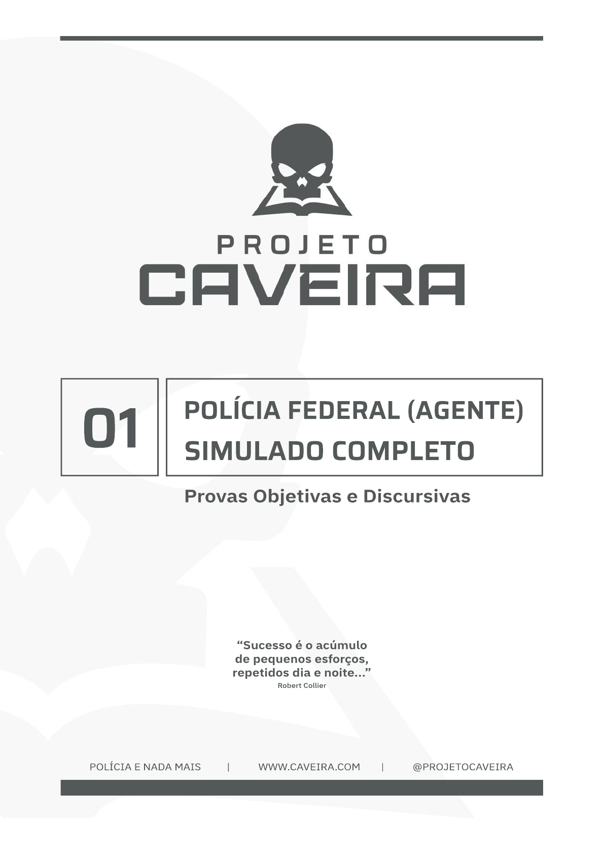 506070.19/08/2023 PROJETO CAVEIRA 01º SIMULADO - PF 2023 1 www.projetocaveira.com.br BLOCO I Língua Portuguesa: Julgue os itens a seguir de acordo com os sentidos do texto. 01. Conforme o texto, uma das principais atribuições da medicina legal, ao apurar as causas de uma morte, é determinar a ordem de acontecimento dos fatos, sem que, para isso, seja necessário precisar o momento de ocorrência de cada um deles. 02. A determinação do momento de ocorrência da morte de uma pessoa tem grande relevância nos casos de mortes criminosas. 03. A não determinação do momento exato da morte de uma pessoa, em caso de morte criminosa, inviabiliza a identificação do autor do crime. 04. Por não serem precisas, as conceituações matemáticas e filosóficas do tempo são inócuas no campo jurídico. Julgue os próximos de acordo com os aspectos linguísticos do texto CG1A01AAA. 05. Seriam mantidos o sentido original e a correção gramatical, caso fosse inserida uma vírgula imediatamente após a palavra “letal” (ℓ.23). 06. A oração “que sua retirada seja feita em condições de aproveitamento útil” (ℓ. 19 e 20) exerce a função de objeto direto. 07. A conjunção “pois” (ℓ.22) introduz, no período em que ocorre, uma ideia de explicação. 08. A partícula “se”, em “a grandeza que se mede em minutos, horas, dias, meses ou anos” (ℓ. 30 e 31), classifica-se como pronome apassivador. As assertivas a seguir tratam sobre a substituição de palavras. Julgue-as de maneira que a correção gramatical e o sentido sejam preservados. 09. êxito (ℓ.7) por prêmio. 10. empírica (ℓ.31) por cientifica. 11. comportam (ℓ.2) por procedem. 12. progressos (ℓ.15) por desenvolvimentos. Texto CG1A01BBB. Eu a peguei de surpresa. Até a questionei “Ana, a nova professora, chegou?”. Levei um tapa. Até entendo, pela minha ignorância. Queria que ela me dissesse um porque dessas atitudes. Minhas, claro. Às vezes, eu não me controlo. Sinto uma ledice que me deixa assim. Claro, pois estou ao lado dela. (Velas soltas. Cristopher, M. Rolan. 2019. Com adaptações). Julgue os itens a seguir de acordo com os sentidos e aspectos linguísticos do texto CG1A01BBB. 13. No oitavo período, o vocábulo ledice pode ser substituído, tendo sua essência contrafeita, por soturnidade. 506070.19/08/2023 PROJETO CAVEIRA 01º SIMULADO - PF 2023 2 www.projetocaveira.com.br 14. As aspas são utilizadas no texto para identificar um discurso indireto. 15. A vírgula após professora, no segundo período do texto, pode ser removida sem prejuízo gramatical. 16. No quinto período há um erro gramatical, o vocábulo deveria ser assinalado como porquê. 17. No penúltimo parágrafo do texto, o vocábulo “que” refere-se a “ledice”. 18. No penúltimo parágrafo do texto, o vocábulo “que” pode ser substituído, sem prejuízos semântico e gramatical, por da qual. No que tange aos aspectos gerais da redação oficial, julgue os próximos itens. 19. Na redação oficial, quem se comunica, além do serviço público, é a população, a qual pode exigir e solicitar diversos direitos expressos na Constituição de 1988. 20. Redação oficial é o jeito pelo qual o Poder Público escreve comunicações oficiais e atos normativos. 21. Por ter que se comunicar com objetividade e máxima clareza, a redação oficial é árida. 22. Entre outros, os atributos da redação oficial são a clareza e a precisão, a destreza, coesão e coerência, impessoalidade e concisão. 23. A necessidade de empregar determinado nível de linguagem nos atos e nos expedientes oficiais decorre, de um lado, do próprio caráter público desses atos e comunicações; de outro, de sua finalidade. 24. A finalidade precípua da redação oficial é a de informar com clareza e objetividade. Direito Administrativo: Com relação aos princípios que regem o Direito Administrativo, julgue o próximo item. 25. O princípio da sindicabilidade prega que o administrador público não esteja restrito apenas às leis em sentido formal, mas também aos demais mandamentos do ordenamento jurídico. Com base nos poderes administrativos, julgue o item subsequente. 26. O poder discricionário confere ao administrador liberdade de atuação, porém sempre dentro dos limites expressamente estabelecidos em lei, ou dela decorrentes. Julgue o item seguinte, acerca do processo licitatório, do controle da administração pública e da responsabilidade civil do Estado. 27. A responsabilidade civil do Estado apoia-se, via de regra, na teoria do risco integral. Direito constitucional: Acerca dos direitos e garantias fundamentais, julgue os próximos itens. 28. O direito de não ser torturado é visto por parcela crescente da doutrina como um direito fundamental absoluto. 29. São gratuitas, além das ações de habeas corpus e habeas data, o mandado de segurança e, na forma da lei, os atos necessários ao exercício da cidadania. Com base no tema segurança pública, analise o próximo item. 30. Às polícias penais, vinculadas ao órgão administrador do sistema penal da unidade federativa a que pertencem, cabem a polícia ostensiva, a preservação da ordem pública e a segurança dos estabelecimentos penais. Direito Penal e Processual Penal: Acerca da aplicação da lei penal, julgue o item que se segue. 31. O instituto da continuidade típico-normativa se perfaz quando há apenas a supressão formal do fato criminoso, de modo que a conduta delituosa continua sendo punida, porém em outro artigo. Acerca do crime e seus elementos, julgue o próximo item. 32. Com relação à punição da tentativa, o código penal adota, como regra, a teoria subjetiva, também denominada de voluntarística ou monista. Com relação à prisão em flagrante e à prisão preventiva, julgue o item subsequente. 33. Considere que um indiciado preso pelo crime de tráfico de drogas tenha sido apresentado para audiência de custódia, ocasião em que o juiz, de o