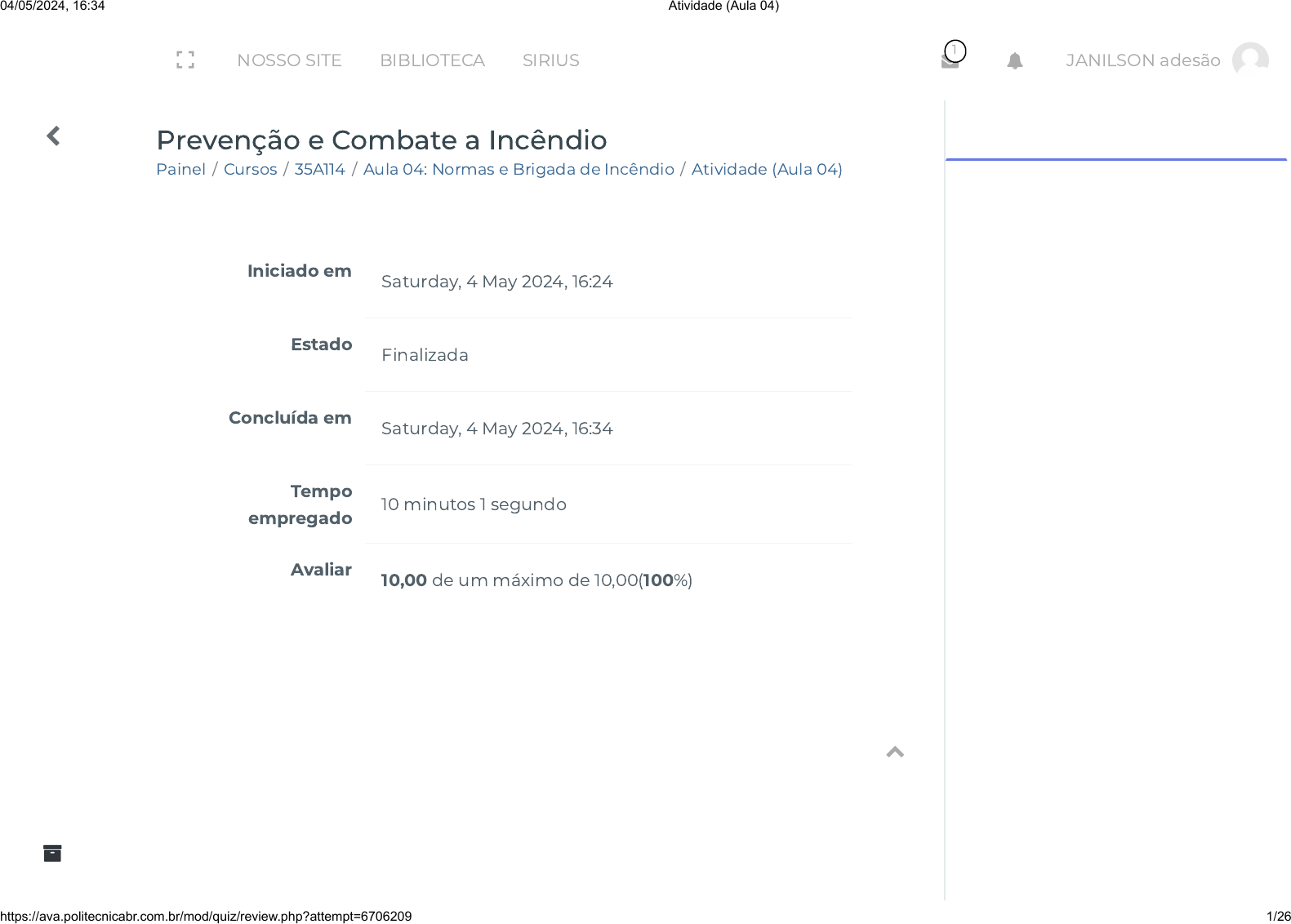 Painel / Cursos / 35A114 / Aula 04: Normas e Brigada de Incêndio / Atividade (Aula 04) Prevenção e Combate a Incêndio Iniciado em Saturday, 4 May 2024, 16:24 Estado Finalizada Concluída em Saturday, 4 May 2024, 16:34 Tempo empregado 10 minutos 1 segundo Avaliar 10,00 de um máximo de 10,00(100%) NOSSO SITE BIBLIOTECA SIRIUS 1 JANILSON adesão 04/05/2024, 16:34 Atividade (Aula 04) https://ava.politecnicabr.com.br/mod/quiz/review.php?attempt=6706209 1/26 https://ava.politecnicabr.com.br/my/ https://ava.politecnicabr.com.br/my/ https://ava.politecnicabr.com.br/course/index.php https://ava.politecnicabr.com.br/course/view.php?id=1120 https://ava.politecnicabr.com.br/course/view.php?id=1120#section-6 https://ava.politecnicabr.com.br/mod/quiz/view.php?id=25779 https://ava.politecnicabr.com.br/course/view.php?id=1120 javascript:void(0) javascript:void(0) javascript:void(0) javascript:void(0) javascript:void(0) javascript:void(0) javascript:void(0) https://ava.politecnicabr.com.br/course/index.php https://ava.politecnicabr.com.br/ https://www.politecnicabr.com.br/ https://biblioteca.politecnicabr.com.br/student http://sirius.politecnicabr.com.br/ javascript:void(0) javascript:void(0) Questão 1 Correto Atingiu 1,00 de 1,00 É a principal característica que um Grupo de Brigadistas deve possuir: Escolha uma opção: a. Componentes unidos. b. Membros que saibam trabalhar isoladamente. c. Todos os membros com porte atlético. d. Componentes com 01 ano ou mais de experiência na Brigada de Incêndio. NOSSO SITE BIBLIOTECA SIRIUS 1 JANILSON adesão 04/05/2024, 16:34 Atividade (Aula 04) https://ava.politecnicabr.com.br/mod/quiz/review.php?attempt=6706209 2/26 https://ava.politecnicabr.com.br/course/view.php?id=1120 javascript:void(0) javascript:void(0) javascript:void(0) javascript:void(0) javascript:void(0) javascript:void(0) javascript:void(0) https://ava.politecnicabr.com.br/course/index.php https://ava.politecnicabr.com.br/ https://www.politecnicabr.com.br/ https://biblioteca.politecnicabr.com.br/student http://sirius.politecnicabr.com.br/ javascript:void(0) javascript:void(0) Questão 2 Correto Atingiu 1,00 de 1,00 Qual a função do Chefe da Brigada? Escolha uma opção: a. Fazer o check-list dos equipamentos de incêndio. b. Comandar a ação de abandono da edi�cação. c. Todas as alternativas estão corretas. d. Ajudar a equipe a combater o fogo. NOSSO SITE BIBLIOTECA SIRIUS 1 JANILSON adesão 04/05/2024, 16:34 Atividade (Aula 04) https://ava.politecnicabr.com.br/mod/quiz/review.php?attempt=6706209 3/26 https://ava.politecnicabr.com.br/course/view.php?id=1120 javascript:void(0) javascript:void(0) javascript:void(0) javascript:void(0) javascript:void(0) javascript:void(0) javascript:void(0) https://ava.politecnicabr.com.br/course/index.php https://ava.politecnicabr.com.br/ https://www.politecnicabr.com.br/ https://biblioteca.politecnicabr.com.br/student http://sirius.politecnicabr.com.br/ javascript:void(0) javascript:void(0) Questão 3 Correto Atingiu 1,00 de 1,00 Quais são as atribuições de emergência da Brigada de Incêndio? Escolha uma opção: a. Todas as a�rmativas estão certas. b. Alarme/abandono de área. c. Acionamento do Corpo de Bombeiros e /ou ajuda externa. d. Combate ao princípio de incêndio. NOSSO SITE BIBLIOTECA SIRIUS 1 JANILSON adesão 04/05/2024, 16:34 Atividade (Aula 04) https://ava.politecnicabr.com.br/mod/quiz/review.php?attempt=6706209 4/26 https://ava.politecnicabr.com.br/course/view.php?id=1120 javascript:void(0) javascript:void(0) javascript:void(0) javascript:void(0) javascript:void(0) javascript:void(0) javascript:void(0) https://ava.politecnicabr.com.br/course/index.php https://ava.politecnicabr.com.br/ https://www.politecnicabr.com.br/ https://biblioteca.politecnicabr.com.br/student http://sirius.politecnicabr.com.br/ javascript:void(0) javascript:void(0) Questão 4 Correto Atingiu 1,00 de 1,00 Qual é a composição básica de uma equipe para a formação da brigada de incêndio ? Escolha uma opção: a. Chefe da Brigada e SubChefe da Brigada. b. Brigadistas, Líder, Chefe da Brigada de Incêndio e coordenador geral. c. Chefe da Brigada, SubChefe, Socorrista, Ajudante e Bombeiro. d. Chefe da Brigada e Diretor Operacional. NOSSO SITE BIBLIOTECA SIRIUS 1 JANILSON adesão 04/05/2024, 16:34 Atividade (Aula 04) https://ava.politecnicabr.com.br/mod/quiz/review.php?attempt=6706209 5/26 https://ava.politecnicabr.com.br/course/view.php?id=1120 javascript:void(0) javascript:void(0) javascript:void(0) javascript:void(0) javascript:void(0) javascript:void(0) javascript:void(0) https://ava.politecnicabr.com.br/course/index.php https://ava.politecnicabr.com.br/ https://www.politecnicabr.com.br/ https://biblioteca.politecnicabr.com.br/student http://sirius.politecnicabr.com.br/ javascript:void(0) javascript:void(0) Questão 5 Correto Atingiu 1,00 de 1,00 Qual o procedimento você deve adotar em caso de simulado ou incêndio? Escolha uma opção: a. Caminhar em ordem sem atropelos. b. Não �car na frente de pessoas em pânico, se não puder acalma-las, evite-as. Se possível avisar um brigadista. c. Todas as alternativas estão certas. d. Nunca utilizar o elevador. NOSSO SITE BIBLIOTECA SIRIUS 1 JANILSON adesão 04/05/2024, 16:34 Atividade (Aula 04) https://ava.politecnicabr.com.br/mod/quiz/review.php?attempt=6706209 6/26 https://ava.politecnicabr.com.br/course/view.php?id=1120 javascript:void(0) javascript:void(0) javascript:void(0) javascript:void(0) javascript:void(0) javascript:void(0) javascript:void(0) https://ava.politecnicabr.com.br/course/index.php https://ava.politecnicabr.com.br/ https://www.politecnicabr.com.br/ https://biblioteca.politecnicabr.com.br/student http://sirius.politecnicabr.com.br/ javascript:void(0) javascript:void(0) Questão 6 Correto Atingiu 1,00 de 1,00 Qual são os critérios básicos para ser selecionado um Brigadista ? Escolha uma opção: a. Todas as alternativas estão corretas. b. Possuir experiência anterior como brigadista
