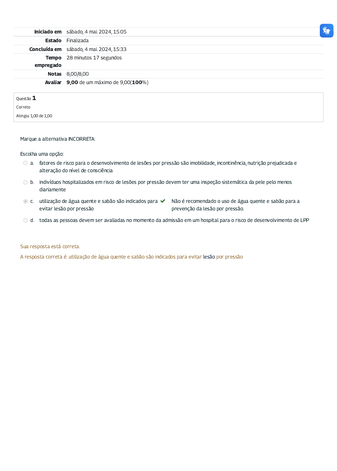 Iniciado em sábado, 4 mai. 2024, 15:05 Estado Finalizada Concluída em sábado, 4 mai. 2024, 15:33 Tempo empregado 28 minutos 17 segundos Notas 8,00/8,00 Avaliar 9,00 de um máximo de 9,00(100%) Questão 1 Correto Atingiu 1,00 de 1,00 Marque a alternativa INCORRETA: Escolha uma opção: a. fatores de risco para o desenvolvimento de lesões por pressão são imobilidade, incontinência, nutrição prejudicada e alteração do nível de consciência b. indivíduos hospitalizados em risco de lesões por pressão devem ter uma inspeção sistemática da pele pelo menos diariamente c. utilização de água quente e sabão são indicados para evitar lesão por pressão Não é recomendado o uso de água quente e sabão para a prevenção da lesão por pressão. d. todas as pessoas devem ser avaliadas no momento da admissão em um hospital para o risco de desenvolvimento de LPP Sua resposta está correta. A resposta correta é: utilização de água quente e sabão são indicados para evitar lesão por pressão Questão 2 Correto Atingiu 1,00 de 1,00 Questão 3 Correto Atingiu 1,00 de 1,00 Marque a alternativa CORRETA: Escolha uma opção: a. para evitar lesão por pressão, é importante massagear as proeminências ósseas b. úlcera lesão por pressão estágio III é uma perda parcial da espessura da pele, envolvendo a epiderme e / ou derme c. o estágio IV de lesão de pressão é uma perda de pele de espessura total com destruição extensa, necrose dos tecidos ou danos aos músculos, ossos ou estrutura de suporte No estágio IV, há perda total da espessura dos tecidos com exposição óssea, dos tendões ou músculos. d. pessoas con�nadas na cama devem ser reposicionadas a cada 3 horas e. luvas com água nos calcanhares ajudam a prevenir lesões por pressão Sua resposta está correta. No estágio IV, há perda total da espessura dos tecidos com exposição óssea, dos tendões ou músculos. A resposta correta é: o estágio IV de lesão de pressão é uma perda de pele de espessura total com destruição extensa, necrose dos tecidos ou danos aos músculos, ossos ou estrutura de suporte Com relação aos procedimentos a serem adotados para pacientes com LPP, julgue V ou F: 1. Uma ingestão adequada de proteínas e calorias deve ser mantida durante a doença. 2. A agenda de reposicionamento deve ser escrita e colocado à beira do leito. 3. Na posição de decúbito lateral, uma pessoa deve estar a um ângulo de 30 graus, exceto quando a condição do paciente ou outras necessidades não permitirem. 4. Pessoas restritas à cadeira devem ser colocadas sobre uma almofada de cadeira. Escolha uma opção: a. Todas as alternativas são verdadeiras Todas as quatro alternativas correspondem a procedimentos que devem ser adotados para evitar lesões por pressão. Sendo assim, todas as alternativas estão corretas. b. A alternativa "Na posição de decúbito lateral..." é falsa c. Todas as alternativas são falsas d. Apenas as alternativas "Na posição de decúbito lateral..." e "Pessoas restritas à cadeira devem...", são falsas e. A alternativa "Pessoas restritas à cadeira devem..." é falsa Sua resposta está correta. Todas as quatro alternativas correspondem a procedimentos que devem ser adotados para evitar lesões por pressão. Sendo assim, todas as alternativas estão corretas. A resposta correta é: Todas as alternativas são verdadeiras Questão 4 Correto Atingiu 1,00 de 1,00 Questão 5 Correto Atingiu 1,00 de 1,00 Com relação a LPP (Lesão por pressão) e sua prevenção, marque a alternativa CORRETA: Escolha uma opção: a. a orientação que deve ser dada a pacientes conscientes sobre reposicionamento para redistribuir o peso e evitar LPP é a mudança de decúbito a cada 30 minutos. b. a epiderme do paciente deve permanecer limpa e seca. Deve-se proteger a pele da exposição à umidade excessiva através do uso de produtos de barreira para diminuir o risco de lesão por pressão, como hidrocolóides e película semipermeável. c. um paciente avaliado com a Escala de Braden que recebe pontuação 13 é de alto risco para LPP. d. a Escala de Braden deve ser utilizada em pacientes com mais de 50 anos. Sua resposta está correta. Deve-se proteger a pele da exposição à umidade excessiva através do uso de produtos de barreira para diminuir o risco de lesão por pressão, como hidrocolóides e película semipermeável. A resposta correta é: a epiderme do paciente deve permanecer limpa e seca. Com relação a LPP e sua prevenção, marque a alternativa INCORRETA: Escolha uma opção: a. a incidência de lesões por pressão é tão grande que existem painéis internacionais para estudar riscos, prevenção e tratamento destas lesões b. para minimizar a exposição da pele à umidade por incontinência deve ser usado material absorvente c. proeminências ósseas não devem ter contato direto uma com a outra d. toda pessoa avaliada como estando em risco de desenvolver lesões por pressão deve ser colocada sobre uma cama de redistribuição de pressão e. uma bolha no calcanhar não é motivo para preocupação A avaliação completa da pele deve ser incluída na política de rastreio de avaliação de risco em todas as instituições de saúde. Uma bolha no calcanhar é motivo de preocupação. Sua resposta está correta. A avaliação completa da pele deve ser incluída na política de rastreio de avaliação de risco em todas as instituições de saúde. Uma bolha no calcanhar é motivo de preocupação. A resposta correta é: uma bolha no calcanhar não é motivo para preocupação Questão 6 Correto Atingiu 1,00 de 1,00 Questão 7 Correto Atingiu 1,00 de 1,00 Marque a alternativa CORRETA: Escolha uma opção: a. a formação de escara é bom para a cicatrização de feridas b. no Estágio III de lesão por pressão, ossos e tendões são visíveis c. a superfície de redistribuição da pressão reduz a pressão de interface com o tecido abaixo da pressão de fechamento capi