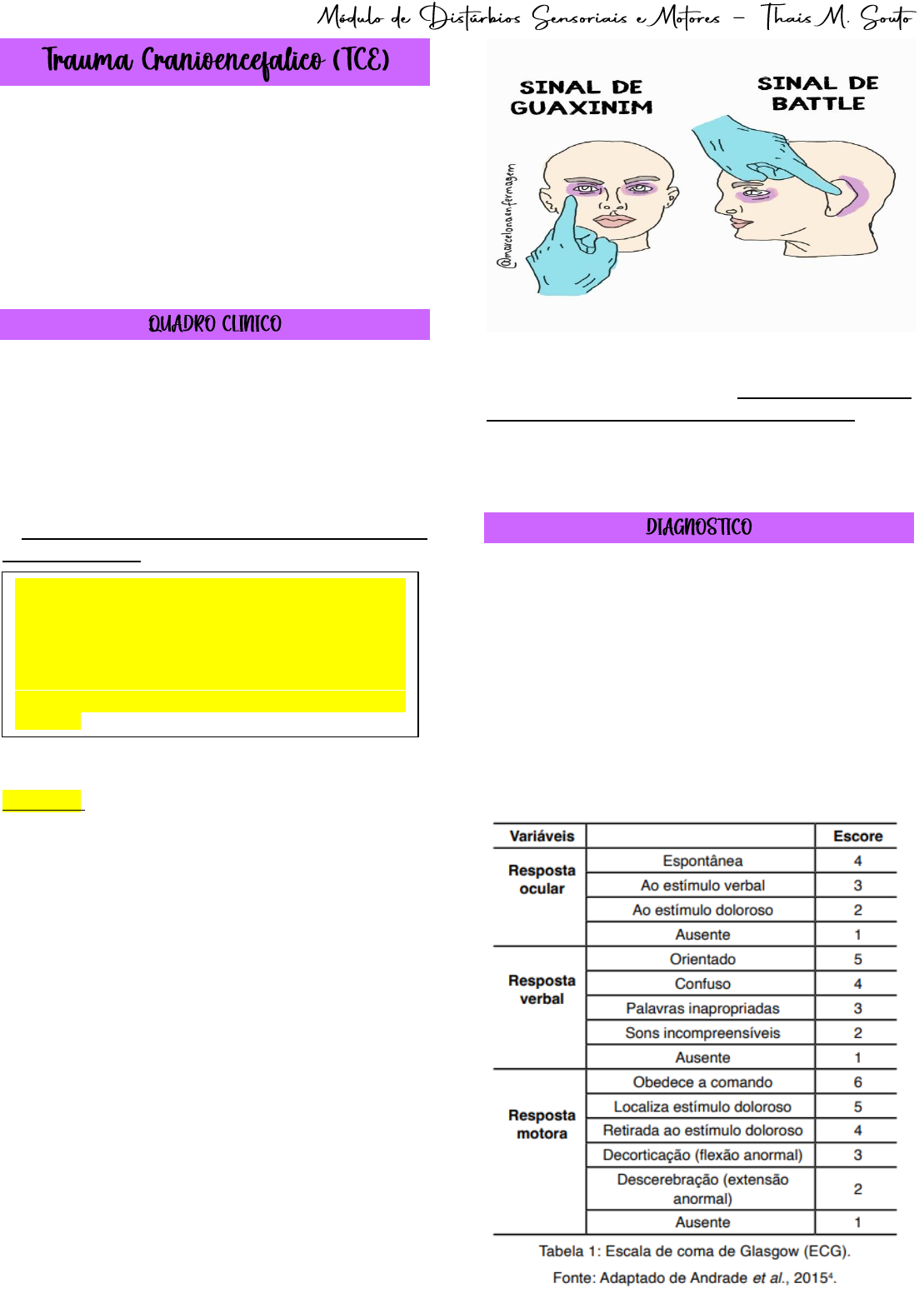 O trauma cranioencefálico (TCE) é uma lesão grave que afeta o crânio e/ou o encéfalo, podendo afetar as estruturas que o contêm como o couro cabeludo e as meninges. É de natureza evitável, principalmente com educação no trânsito e ações de prevenção de acidentes com crianças, idosos e desportistas. Devido ao espectro variado de apresentações, os dados da anamnese, do exame físico e do atendimento pré-hospitalar são fundamentais para definição da conduta a ser adotada. O quadro clínico de um paciente, vítima de TCE, varia desde perda de memória ou breve perda da consciência (que são comuns em concussões cerebrais), até mesmo o coma. São sintomas muito comuns, a cefaleia, náuseas, vômitos, amnésia lacunar, letargia e vertigem. Alterações na visão, fala ou audição. Fraqueza ou dormência em partes do corpo. Alterações no estado de humor ou no comportamento. ➔O nível de consciência é avaliado pela escala de coma de Glasgow (ECG). Além disso, a avaliação da resposta pupilar em busca de alterações extremamente comuns em TCE grave, como a anisocoria, é fundamental. Na grande maioria das vezes, a anisocoria é ipsilateral à lesão, excetuando-se casos em que ocorre o fenômeno de Kernohan, cuja anisocoria é contralateral. A anisocoria decorre, principalmente, da compressão do III nervo craniano (NC), nervo oculomotor, responsável pela miose, ou seja, contração da pupila. Esse quadro é devido principalmente pela herniação do uncus. Lesões de outros NCs podem estar associadas, como o I, se lesão da lâmina crivosa (geralmente nos traumas da região posterior do crânio); III, IV e VI, se lesões de órbita; e VII e VIII NC, se acometimento da mastoide. A lesão de NC mais comum é do nervo olfatório (I), seguido do nervo facial (VII). Outros achados no exame físico podem ser identificados tais como: o sinal do guaxinim (equimose periorbital bilateral, remetendo a uma possível fratura do assoalho anterior do crânio), sinal de Battle (equimose retroauricular, remetendo a uma possível fratura da região mastoidea), fístulas liquóricas (oto e rinoliquorreia) e hemotímpano. Nos casos de hipertensão intracraniana não tratada, pode ser encontrada a tríade de Cushing (em fase tardia), a qual é caracterizada por alteração do padrão respiratório, bradicardia e hipertensão arterial. Crises convulsivas podem se manifestar no decorrer da evolução de lesões que comprometam o córtex cerebral, mas também podem aparecer tardiamente como sequelas de lesões ou de procedimentos neurocirúrgicos. O diagnóstico de TCE é baseado a partir da história de trauma refletindo na diminuição da função cerebral. Na anamnese, deve-se focar na idade do paciente, nos relatos de vômitos ou crises convulsivas, nas alterações de consciência e no mecanismo de trauma. No exame físico, o primeiro ponto a ser abordado, em geral de forma concomitante com a anamnese, é a ECG, que irá fornecer a principal classificação de gravidade para estes pacientes. Cabe salientar que a classificação de gravidade não leva em conta a recente mudança da ECG, que considera a reatividade pupilar em seu escore geral. A Escala de Coma de Glasgow é um instrumento utilizado na avaliação neurológica no TCE para determinar o nível de consciência e detectar precocemente alterações oculares, verbais e motoras. Possibilita a avaliação objetiva da função cerebral, principalmente em avaliações neurológicas seriadas. Com o breve exame clínico e condutas de estabilização do paciente, deve-se seguir para realização de exames complementares, sendo a tomografia computadorizada (TC), sem contraste, o principal deles. Nos pacientes com ECG abaixo de 15, todos devem realizar TC de crânio. Em pacientes com TCE leve e ECG = 15, somente devem fazer TC quando na presença de fatores de risco. Já os pacientes que não apresentarem nenhum desses critérios são considerados com TCE leve de baixo risco, sendo recomendada a TC apenas se os sintomas persistirem ou se o raio-X de crânio sugerir fratura. Prosseguindo para a TC, será feita a classificação tomográfica dos pacientes, baseando-se nas escalas de Marshall e Rotterdam. No Brasil, a escala de Marshall é utilizada principalmente para definição da conduta a ser tomada em caso de lesão difusa. O escore de Rotterdam, entretanto, apresenta melhor associação com o prognóstico. Classificação Tomográfica de Marshall. Classificação Tomográfica de Rotterdam ➔A TC é o exame preferível para avaliação de lesões nos casos de traumatismo cranioencefálico. Dessa forma, é extremamente importante sabermos interpretar de forma correta os achados desse exame. A fim de facilitar essa interpretação, vamos utilizar o mnemônico “ABCDEFG”, adaptado do Advanced Cardiovascular Life Support (ACLS), que permite uma avaliação sistematizada da TC de crânio. • A (ATTENUATION): A princípio, iremos buscar por diferença de atenuação entre a substância branca e cinzenta, que possa sugerir a presença de massas, edemas ou evento isquêmico. • B (BLOOD): Avaliar a presença de sangramento, bem como desvio de linha média, que é uma reação causada pela presença do sangue. A hemorragia na TC é representada por uma imagem hiperdensa (branca). • C (CAVITIES): Avaliar as cavidades cranianas, ou seja, os ventrículos e cisternas. • D (DILATION): Avaliar dilatação dos ventrículos e cisternas. • E (EXTERIOR): Avaliar a parte óssea (hiperdensa), procurando por fraturas, e tecido subcutâneo. • F (FISHER SCALE): Nos casos de hemorragia subaracnóidea, fazer a graduação de Fisher. • G (GHOSTS, DRAINS AND ARTIFACTS): Identificar presença de drenos, cateteres ou artefatos. As lesões no TCE podem ser classificadas em difusas e focais. As lesões difusas são geralmente causadas por mecanismo angular ou rotacional, como exemplo, as lesões axoniais difusas (LAD). Também são considerada