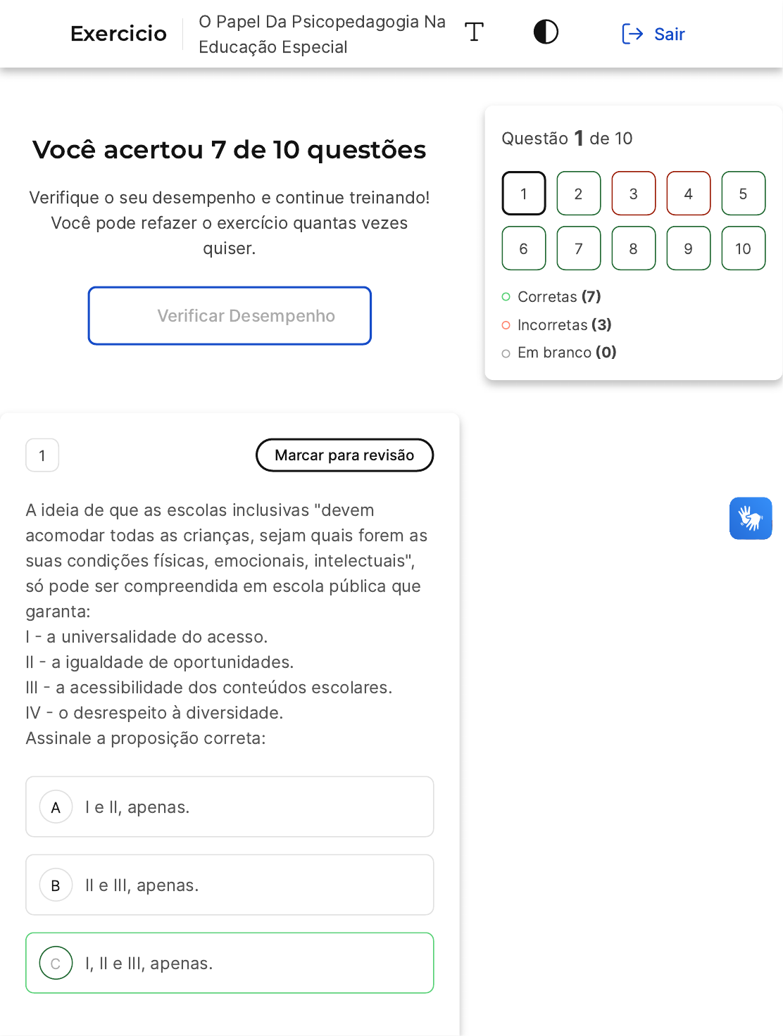 Você acertou 7 de 10 questões Verifique o seu desempenho e continue treinando! Você pode refazer o exercício quantas vezes quiser. Verificar Desempenho A B C 1 Marcar para revisão A ideia de que as escolas inclusivas "devem acomodar todas as crianças, sejam quais forem as suas condições físicas, emocionais, intelectuais", só pode ser compreendida em escola pública que garanta: I � a universalidade do acesso. II � a igualdade de oportunidades. III � a acessibilidade dos conteúdos escolares. IV � o desrespeito à diversidade. Assinale a proposição correta: I e II, apenas. II e III, apenas. I, II e III, apenas. Questão 1 de 10 Corretas �7� Incorretas �3� Em branco �0� 1 2 3 4 5 6 7 8 9 10 Exercicio O Papel Da Psicopedagogia Na Educação Especial Sair D E II, III, IV, apenas. I e IV, apenas. Resposta incorreta Opa! A alternativa correta é a letra C. Confira o gabarito comentado! Gabarito Comentado Para que uma escola seja verdadeiramente inclusiva, ela deve garantir a universalidade do acesso, ou seja, todas as crianças devem ter o direito de frequentar a escola, independentemente de suas condições físicas, emocionais ou intelectuais. Além disso, deve assegurar a igualdade de oportunidades, proporcionando a todos os alunos as mesmas chances de aprendizado e desenvolvimento. Por fim, a escola deve garantir a acessibilidade dos conteúdos escolares, adaptando-os às necessidades de cada aluno. O desrespeito à diversidade, por outro lado, é contraproducente à ideia de inclusão, pois implica em não valorizar as diferenças e singularidades de cada aluno. Portanto, a alternativa correta é a C� I, II e III, apenas. 2 Marcar para revisão �FUNDEP/ 2017 � adaptada) Segundo o Art. 5º da Resolução nº 2, de 11 de setembro de 2001, que instituiu as Diretrizes Nacionais para a Educação Especial na Educação Básica. Com base no A B C D E exposto, pode-se considerar alunos com necessidades educacionais especiais aqueles que apresentam, durante o processo educacional, as seguintes características: I. Qualquer dificuldade de aprendizagem ou limitação no processo de ensino-aprendizagem. II. Dificuldades acentuadas de aprendizagem ou limitações no processo de desenvolvimento não vinculadas a uma causa orgânica específica. III. Dificuldades de comunicação e sinalização diferenciadas dos demais alunos, demandando a utilização de linguagens e códigos aplicáveis. IV. Altas habilidades / superdotação, grande facilidade de aprendizagem que os levem a dominar rapidamente conceitos, procedimentos e atitudes. Assinale a alternativa correta: I e III, apenas. II e III, apenas. II e IV, apenas. I, III e IV, apenas. II, III e IV, apenas. Resposta correta Parabéns, você selecionou a alternativa correta. Confira o gabarito comentado! A B Gabarito Comentado De acordo com o Art. 5º da Resolução nº 2, de 11 de setembro de 2001, que instituiu as Diretrizes Nacionais para a Educação Especial na Educação Básica, são considerados alunos com necessidades educacionais especiais aqueles que apresentam dificuldades acentuadas de aprendizagem ou limitações no processo de desenvolvimento não vinculadas a uma causa orgânica específica �II�, dificuldades de comunicação e sinalização diferenciadas dos demais alunos, demandando a utilização de linguagens e códigos aplicáveis �III�, e altas habilidades/superdotação, ou seja, grande facilidade de aprendizagem que os leva a dominar rapidamente conceitos, procedimentos e atitudes �IV�. Portanto, a alternativa correta é a E� II, III e IV, apenas. 3 Marcar para revisão As habilidades cognitivas que são fundamentais para o desempenho acadêmico da leitura e escrita estão diretamente relacionadas à capacidade da criança em organizar suas ideias e pensamentos. Assinale a alternativa que contém tais habilidades. Memória, atenção e funções executivas. Memória, raciocínio lógico-matemático e previsão afetiva. C D E Pensamento lateral, raciocínio lógico- matemático e socioemocional. Atenção, pensamento lateral e raciocínio lógico-matemático. Pensamento lateral, previsão afetiva e raciocínio lógico-matemático. Resposta incorreta Opa! A alternativa correta é a letra A. Confira o gabarito comentado! Gabarito Comentado As habilidades cognitivas que desempenham um papel crucial no processo de aprendizagem, especialmente na leitura e na escrita, estão relacionadas ao processamento de informações. Isso inclui habilidades como memória, atenção, percepção, linguagem e funções executivas, que englobam planejamento, controle inibitório e flexibilidade cognitiva. Embora outras habilidades, como as socioemocionais, possam estar indiretamente relacionadas, as habilidades mencionadas na alternativa A � memória, atenção e funções executivas - são as mais diretamente ligadas ao desempenho acadêmico em leitura e escrita. 4 Marcar para revisão A B C D E No diagnóstico psicopedagógico, avaliam-se os aspectos orgânico, familiar, emocional, social, psicomotor e pedagógico do sujeito. Quanto ao aspecto pedagógico, no atendimento de crianças com ou sem deficiência, o psicopedagogo, geralmente, é contrário à utilização da seguinte estratégia: Análise do material escolar. Leitura oral, reconto e dramatizações. Jogos de raciocínio lógico-matemático. Avaliação por meio de provas com atribuição de nota. Materiais concretos para facilitar a compreensão de conceitos. Resposta incorreta Opa! A alternativa correta é a letra D. Confira o gabarito comentado! Gabarito Comentado O psicopedagogo, ao realizar o diagnóstico psicopedagógico, utiliza uma variedade de recursos e estratégias para avaliar os diferentes aspectos do sujeito. Entre essas estratégias, estão a análise do material escolar, a leitura oral, o reconto, as dramatizações, os jogos de raciocínio lógico- matemático e o uso de materiais concretos para facilitar a compreensã