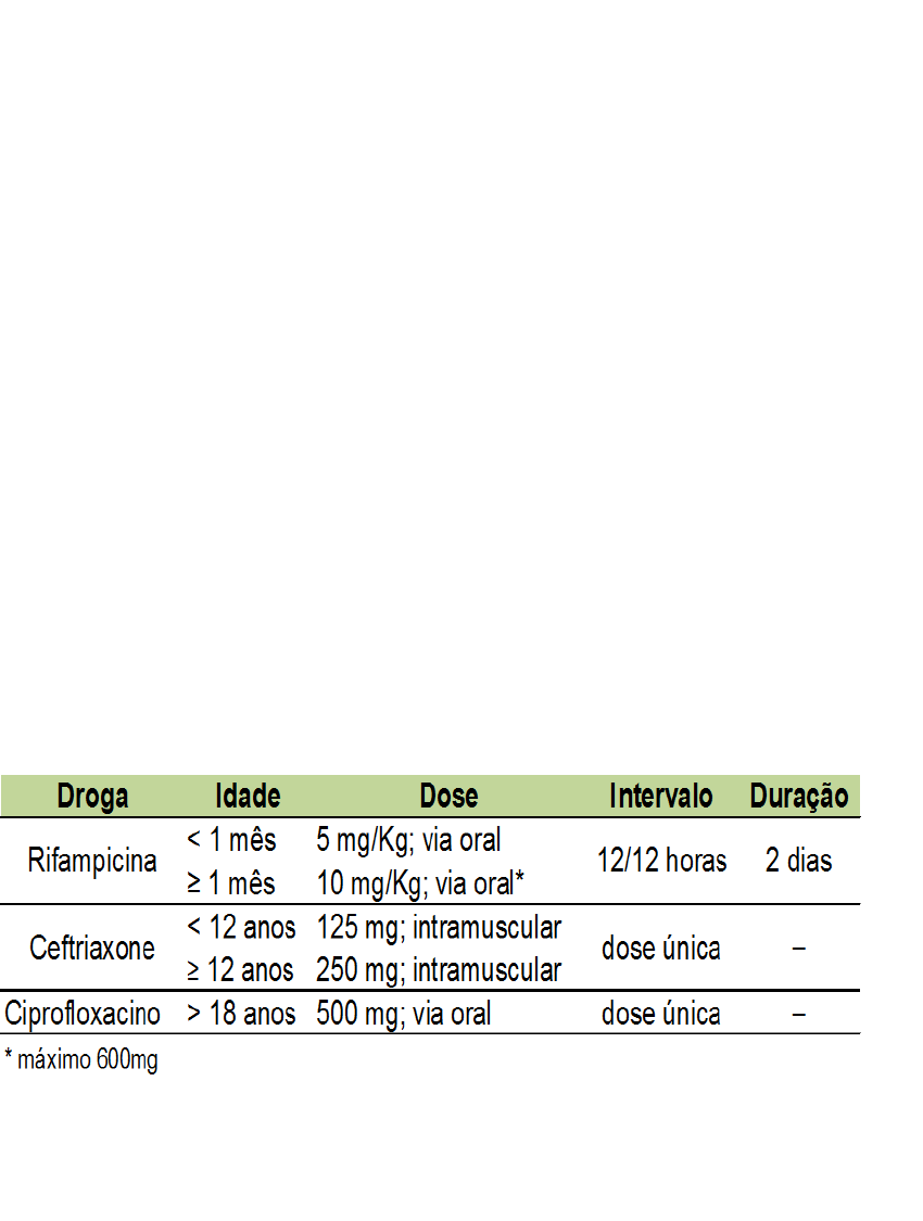 Quais são as indicações para contactantes de meningites bacterianas? Como deve ser realizada? Os contactantes de casos de meningites bacterianas são considerados os moradores do mesmo domicílio, indivíduos que compartilham o mesmo dormitório, comunicantes de creches e pessoas diretamente expostas às secreções do paciente. Vale ressaltar que não há recomendação para profissionais de saúde que atenderam o caso, exceto para aqueles que realizaram procedimento invasivo (intubação orotraqueal e cateter nasogástrico) sem a utilização de equipamento de proteção individual (EPI) (BRASIL, 2020). Diante desse contexto, a quimioprofilaxia é indicada para contactantes de casos, administrada até 48 horas após a exposição, sendo eficaz na prevenção de casos secundários. Os medicamentos utilizados são rifampicina, ceftriaxona ou ciprofloxacino, sendo a rifampicina o antibiótico de escolha para a quimioprofilaxia (CISNEIROS et al., 2022). Vale ressaltar que a quimioprofilaxia só deve ser realizada em contatos de casos suspeitos ou confirmados de meningite por H. influenzae tipo B ou de doença meningocócica (BRASIL, 2020). A quimioprofilaxia varia conforme o medicamento escolhido, sendo que o uso da rifampicina é feito durante 2 dias, enquanto a ceftriaxona e o ciprofloxacino é de dose única conforme ilustrado na tabela abaixo (BRASIL, 2020). Ademais, é importante pontuar que a vacinação de bloqueio deve ser realizada em casos de surto de doença meningocócica (CISNEIROS et al., 2022). Referências CISNEIROS et al. Perfil epidemiológico das internações por doença meningocócica C no Estado de Sergipe. Brazilian Journal of Health Review, Curitiba, v. 5, n. 3, 2022. BRASIL. Medidas de prevenção de infecção relacionadas à assistência à saúde, 1ª edição. Diamantina – SP, 2020 image1.png