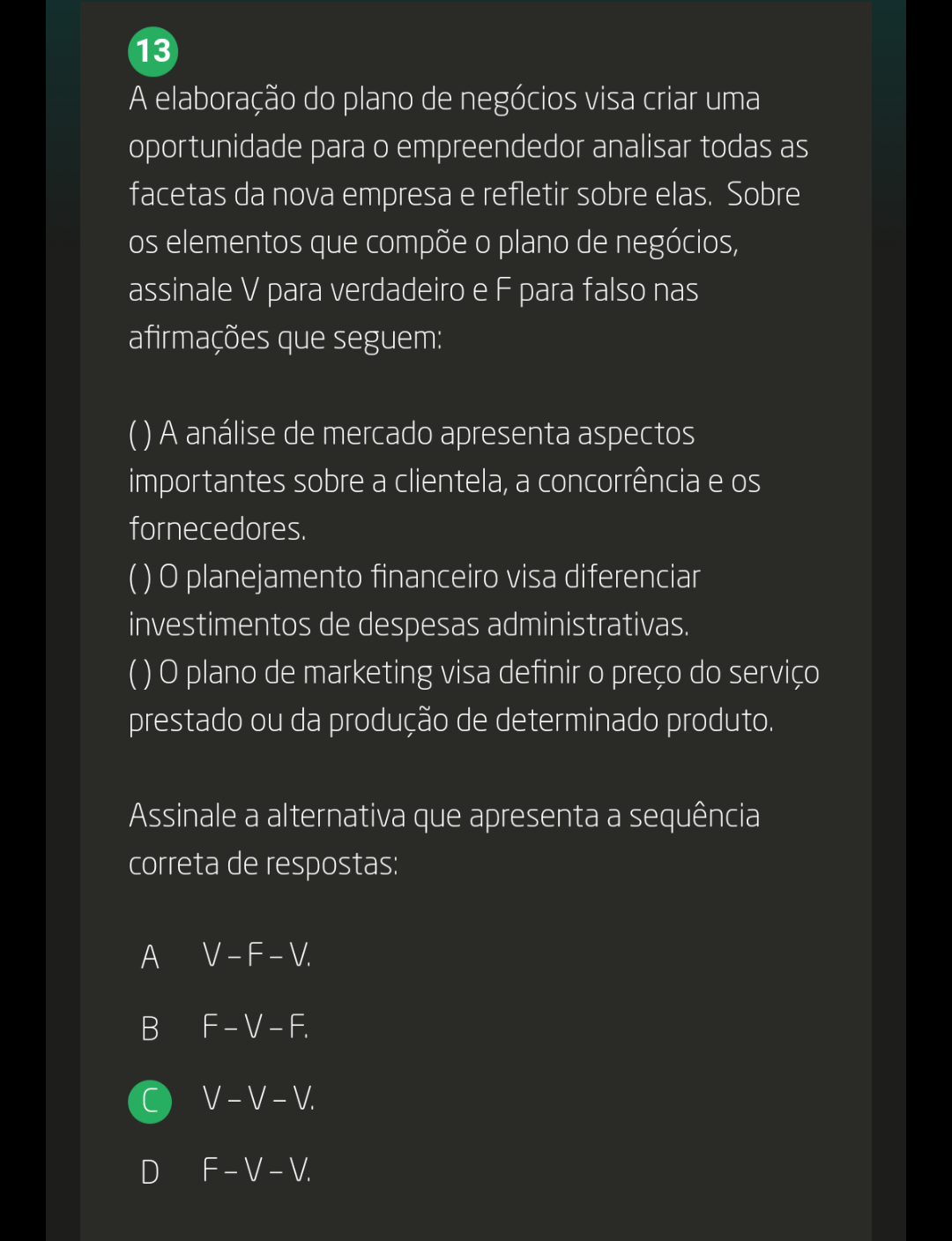 A elaboração do plano de negócios visa criar uma oportunidade para empreendedor analisar todas as facetas da nova empresa e refletir sobre elas. Sobre os elementos que compõe plano de negócios, assinale V para verdadeiro e F para falso nas afirmacoes que seguem: () A análise de mercado apresenta aspectos importantes sobre a clientela, a concorrência e os fornecedores. () planejamento financeiro visa diferenciar investimentos de despesas administrativas. () plano de marketing visa definir preço do serviço prestado ou da produção de determinado produto. Assinale a alternativa que apresenta a correta de respostas: