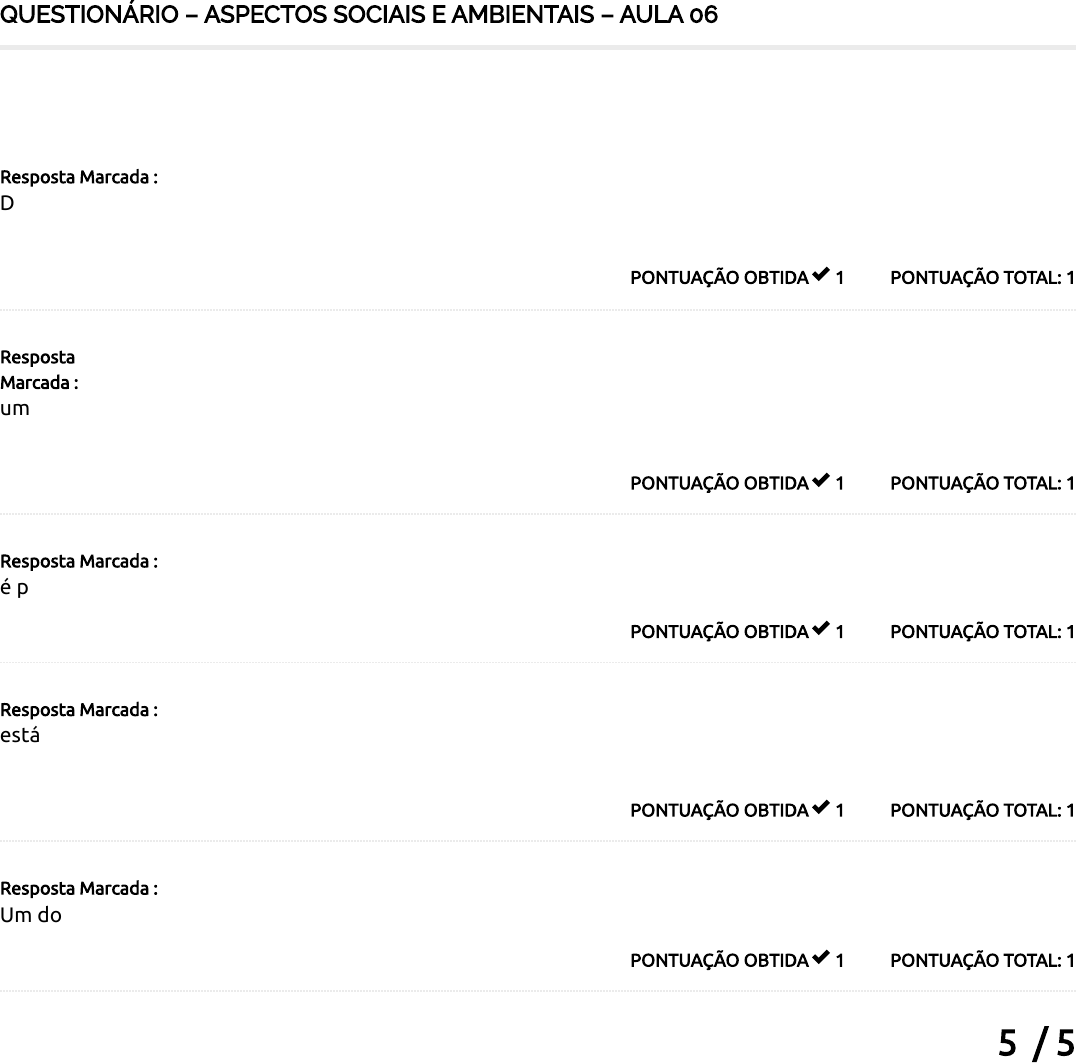 21/08/2023, 20:52 Course Status – AVA Saúde Unifaveni https://ava.saude.unifaveni.com.br/course-status/ 1/1 5 / 5 QUESTIONÁRIO – ASPECTOS SOCIAIS E AMBIENTAIS – AULA 06 O PRINCÍPIO DA ISONOMIA DERIVA DE UM DOS FUNDAMENTOS CONSTITUCIONALMENTE EXPRESSOS DA CONSTITUIÇÃO FEDERAL. QUAL? PONTUAÇÃO TOTAL: 1PONTUAÇÃO OBTIDA 1 Resposta Marcada : Dignidade da pessoa humana, pois a dignidade é o que diferencia o ser humano das outras espécies vivas e, como tal, deve ser tratado sem distinção. A DIGNIDADE DA PESSOA HUMANA, NA CONSTITUIÇÃO BRASILEIRA DE 1988, DEVE SER ENTENDIDA COMO: PONTUAÇÃO TOTAL: 1PONTUAÇÃO OBTIDA 1 Resposta Marcada : um dos fundamentos e um dos princípios fundamentais do Estado Democrático de Direito da República Federativa do Brasil. NO DIREITO BRASILEIRO, A DIGNIDADE DA PESSOA HUMANA: PONTUAÇÃO TOTAL: 1PONTUAÇÃO OBTIDA 1 Resposta Marcada : é princípio central do sistema jurídico brasileiro de signi�cativo vetor interpretativo. NO DIREITO BRASILEIRO, A DIGNIDADE DA PESSOA HUMANA: PONTUAÇÃO TOTAL: 1PONTUAÇÃO OBTIDA 1 Resposta Marcada : está previsto na Constituição Federal como um dos fundamentos da República Federativa e constitui um núcleo essencial de inspiração à proteção dos direitos humanos. A DIGNIDADE DA PESSOA HUMANA NO DIREITO BRASILEIRO CONSTITUI? PONTUAÇÃO TOTAL: 1PONTUAÇÃO OBTIDA 1 Resposta Marcada : Um dos fundamentos da Constituição Federal. Total de Pontos