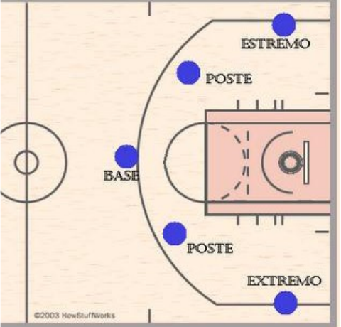 O basquetebol é um esporte coletivo praticado por duas equipes. Cada equipe é constituída por 10 jogadores 5 efetivos e 5 suplentes. O basquetebol pratica-se em 5 contra 5 no campo, tendo cada equipa o direito a efetuar substituições, não havendo limite. O treinador pode decidir da substituição de um ou mais jogadores durante a partida. Qualquer jogador pode ser substituído e mais tarde entrar novamente. Cada jogador conforme a zona do campo e as funções que ocupa, tem uma designação: 1. Base 2. Extremo alto 3. Extremo alto 4. Poste 5. Poste TERRENO DE JOGO O jogo realiza-se num campo retangular, cuja dimensão máxima é de 28 x 15 m e a mínima de 26 x 14 m, limitado por duas linhas laterais e duas linhas de fundo, onde se situam as tabelas com os cestos BOLA, TABELA E CESTO A bola utilizada num jogo de basquetebol é esférica, e revestida de cabedal, borracha, couro ou outro material sintético. O seu peso varia entre 567 g e 650g e o perímetro entre 75cm e 78 cm. Os cestos estão colocados em cada extremidade do campo e cada um, está fixado num painel vertical rígido. Constituem um alvo horizontal situado a 3,05 m do chão, no entanto tanto o tamanho da bola como a altura do cesto e tabela de basquetebol, poderão estar adaptadas à idade e receptivo escalão do praticante. OBJETIVO DO JOGO O objetivo do jogo é introduzir a bola no cesto da outra equipa (marcando pontos) e evitar que a outra equipa se apodere da bola ou marque pontos, respeitando as regras de jogo. DURAÇÃO DO TEMPO DE JOGO O tempo de jogo desenvolve-se em 4 períodos de 10 minutos cada, com um intervalo de 2 minutos entre cada período excetuando entre o 2º e 3º período em que o intervalo tem a duração de 15 minutos. Curiosidade: Quatro períodos de 12 minutos nos jogos da NBA. O cronómetro é acionado quando: Há uma disputa de bola ao alto; Após um lance livre mal sucedido quando a bola continua em jogo; Após uma reposição de bola para dentro da terreno de jogo. cronómetro pára quando: Final de tempo de jogo. Um árbitro apita. O sinal dos 24 segundos é acionado. Um cesto é convertido e a equipa adversária pede desconto de tempo. Regra dos 24 segundos - Quando uma equipa tem a posse de bola, dispõe de 24 segundos para a lançar ao cesto do adversário. PONTUAÇÃO No basquetebol a bola tem de entrar no cesto pela sua parte superior, passando através da rede, sendo os pontos obtidos através de: Lançamento de campo – efetuados de qualquer parte do campo durante o decurso normal do jogo. Se o lançamento convertido foi realizado atrás da linha de 6,25 m marca 3 pontos (jogador B); quando o lançamento é efetuado à frente dessa linha marca 2 pontos (jogador A); lançamento de lance livre – São executados da linha de lançamento livre, após uma falta e com o jogo parado. Este lançamento conta 1 ponto (jogador C) INÍCIO E REINÍCIO DE JOGO O jogo inicia-se ou reinicia-se (após intervalo) com um lançamento de bola ao ar, realizado pelo árbitro, no círculo central, entre dois jogadores adversários que, saltando, tentam tocar a bola para os companheiros de equipa. Nota: - A bola só pode ser tocada depois de atingir o ponto mais alto; - Nenhum dos saltadores pode agarrar a bola; - Os restantes jogadores têm que estar fora do círculo. COMO JOGAR A BOLA A bola é jogada exclusivamente com as mãos, podendo ser passada ou driblada em qualquer direcção, excepto do meio campo ofensivo para o meio campo defensivo. Não é permitido socar a bola. Com a bola segura nas mãos, apenas é permitido realizar dois apoios. Na ação de drible não é permitido: 1. Bater a bola com as duas mãos simultaneamente. 2. Driblar, controlar a bola com as duas mãos e voltar a driblar. 3. Acompanhar a bola com a mão, no momento do drible (transporte). REGRAS DE TEMPO Regra dos 3 segundos Nenhum jogador não pode permanecer mais do que 3 segundos dentro da área restritiva do adversário (garrafão), enquanto a sua equipa está com a posse de bola; Regra dos 5 segundos O atacante não pode ter mais de 5 segundos a bola na mão sem a driblar, senão perde a bola para a equipa adversária. Regra dos 8 segundos Quando uma equipa ganha a posse da bola na zona do seu meio-campo dispõe de 8 segundos para passá-la para o meio-campo do adversário. Regra dos 24 segundos Quando uma equipa tem a posse da bola, dispõe de 24 segundos para lançar a bola ao cesto do adversário. FUNDAMENTOS DO BASQUETE Os principais são: passe, drible, arremesso, lance-livre e rebote: PASSE Passe de peito – Trazendo já bola junto ao peito, com o peso do corpo na perna coordenando movimento dos braços com os pulso, a bola à frente do corpo, lançá-la com as mãos na direção do movimento. Passe picado – É idêntico ao passe de peito, com a diferença de que a bola toque no chão antes de chegar às mãos do jogador que vai recebê-la. Passe por cima da cabeça – Elevando a bola acima da cabeça com ambos os braços, lançá-la com um forte movimento dos pulsos, sem baixar os braços. Passe de gancho – A bola é segura pela mão que vai lançá-la bem junto ao punho, dedos espalhados na bola. Com um passo atrás ou para o lado, dar um solto com um giro no ar simultâneo ao lançamento da bola através de um movimento circundante do braço. Passe de ombro – A bola é segura com ambas as mãos, com os dedos apontados para cima. Os cotovelos devem ser flexionados, a bola se manterá junto ao corpo com o ombro alto e a execução do passe deverá ser feita pela extensão do braço, cotovelo e punho. DRIBLE Corpo abaixado, cabeça elevada, joelhos flexionadas, impulsionar a bola com a flexão do pulso. ARREMESSO Bandeja – É um arremesso em movimento que pode ser feito com passe ou driblando. Em ambos, o jogador tem direito a dois tempos rítmicos, ou seja, ao receber a bola ou interromper o drible o jogador define o pé de apoio (1º tempo rítmico), tendo direito ao segundo tempo rítmico com mais um 