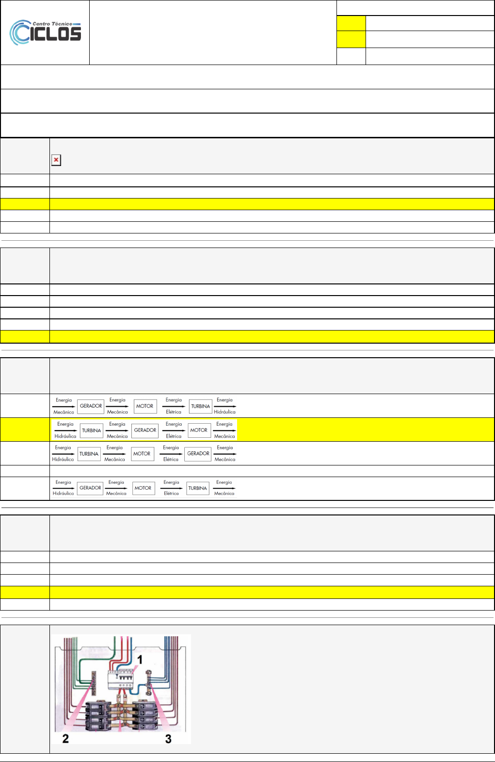Pincel Atômico - 06/05/2024 06:08:52 1/5 Recuperação Online (SALA EAD) - Todos Capitulos/Referencias Atividade finalizada em 27/04/2024 16:59:47 (1964909 / 1) LEGENDA Resposta correta na questão # Resposta correta - Questão Anulada X Resposta selecionada pelo Aluno Disciplina: INSTALAÇÕES ELÉTRICAS PREDIAIS [972983] - Avaliação com 20 questões, com o peso total de 100,00 pontos [capítulos - Todos] Turma: Curso Técnico: Eletrotécnica - Grupo: BOLSA EAD - 2023 - ELETROTÉCNICA - ELE BOLSA EAD NOV 23 [106381] Aluno(a): 91530757 - LUAN PEREIRA FRACALOSSI - Respondeu 7 questões corretas, obtendo um total de 35,00 pontos como nota [350082_1018 6] Questão 001 Que tipo de ligação esta representada no comando da lâmpada na imagem abaixo: X Acionamento de uma lâmpada através de dois interruptores intermediários e um interruptor paralelo. Acionamento de uma lâmpada através de três Three-way . Acionamento de uma lâmpada através de dois interruptores paralelos e um intermediário. Acionamento de uma lâmpada através de dois interruptores Four-way e um Three-way. Acionamento de lâmpada através de três interruptores de três seções. [350082_1016 1] Questão 002 Apesar de um relativo declínio nas últimas décadas, esse recurso natural continua sendo a mais importante fonte de energia da atualidade. Trata-se de uma fonte não renovável e que atua na produção de eletricidade, combustíveis e na constituição de matérias-primas para inúmeros produtos, como a borracha sintética e o plástico. A descrição acima refere-se: Á água Ao carvão mineral Ao gás natural Ao xisto betuminoso X Ao petróleo [350082_1017 7] Questão 003 As etapas de Geração, Transmissão, Distribuição e da utilização da energia elétrica, podem ser assim representadas: X Todas alternativas estão incorretas. [350082_5601 0] Questão 004 Nas instalações elétricas prediais de baixa tensão, quando for prevista a passagem de três ou mais condutores em eletrodutos, a taxa máxima de ocupação do eletroduto é, em %: 31. 25. 60. X 40. 53. [350082_1024 7] Questão 005 A seguir, apresenta-se ao lado, o quadro de distribuição bifásico de uma edificação. Os elementos indicados com os números 2 e 3 são conhecidos, respectivamente, como: Pincel Atômico - 06/05/2024 06:08:52 2/5 Barramento do neutro e barramento de proteção Barramento de proteção e barramento de interligação das fases Barramento de interligação das fases e barramento do neutro X Barramento de proteção e barramento do neutro Barramento de interligação das fases e barramento de proteção [350082_5167] Questão 006 Assinale a alternativa correta que distingue as TUE (Tomadas de Uso Específico) das demais: São tomadas destinadas à ligação de equipamentos fixos estacionários (chuveiro, secadora de roupa, ar condicionado, torneira elétrica, etc.). São aquelas tomadas destinadas ao uso de aparelhos portáteis, como secador de cabelo, ferro de passar, entre outros. São aquelas tomadas onde são ligados apenas aparelhos móveis (aspirador de pó, enceradeira, etc.). São todas as tomadas com demanda menor que 100VA. X São as tomadas que não se destinam à ligação de equipamentos específicos e nelas são sempre ligados aparelhos móveis ou portáteis. [350082_1017 1] Questão 007 Avalie as questões a seguir que tratam das fontes de energia e sua importância: 1. As fontes de energia exercem papel importante nas atividades humanas. Delas se originam eletricidade e combustíveis, que são úteis para a produção e transporte de bens e mercadorias. 2. São as fontes de energia mais utilizadas no Brasil: petróleo, hidrelétrica, carvão mineral e biocombustíveis. 3. A evolução das fontes de obtenção de energia teve impacto direto no trabalho humano. A energia facilitou e agilizou as atividades produtivas. 4. No Brasil, as fontes de energia são prioritariamente as renováveis, como a energia eólica, energia solar e hidrelétrica. Estão INCORRETAS as alternativas: Todas as alternativas. Apenas a alternativa IV. X II e III. Apenas a alternativa III. I e IV. [350081_5370 7] Questão 008 Analise os esquemas multifilar e unifilar apresentados abaixo. O eletroduto X está representado em: X Pincel Atômico - 06/05/2024 06:08:52 3/5 [350083_5605 0] Questão 009 Os eletrodutos utilizados nas instalações elétricas são fabricados de plástico ou metal podendo ser rígidos ou flexíveis tendo, entre outras finalidades, a função de proteger os condutores elétricos da umidade e choque mecânicos. Em relação às características destes eletrodutos assinale a única alternativa correta. O eletroduto plástico flexível é anti-chama; São vendidos em bobinas de no mínimo 10 m; Possui geralmente a cor vermelha. O eletroduto rígido plástico é dobrável; Não apresenta costura longitudinal; Possui rosca externa e é fornecido em vara de 3 metros. O eletroduto rígido metálico é feito de aço ou de ferro; não é dobrável; Fabricado com diferentes diâmetros e espessura; Pintado internamente de cor vermelha O eletroduto flexível metálico, só pode ser instalado embutido e nunca em áreas externas; Não devem ser emendados. X Nenhumas das respostas acima esta correta [350083_2105] Questão 010 Quais são as funções dos disjuntores? Proteção contra curto circuito. Manobra, temporização e energização dos circuitos. X Proteção contra curto circuito e proteção contra sobrecarga. Elevação da corrente elétrica. Manobra, proteção contra curto circuito e proteção contra sobrecarga. [350083_1687 97] Questão 011 Figura a seguir mostra o trecho de uma instalação aparente em que são utilizadas caixas conhecidas como "conduletes" para encaminhamento de condutores, instalação de dispositivos, tais como tomadas e interruptores entre outros. Observa-se que todas as caixas estão com as tampas voltadas para frente. A partir das informações dadas, verifica-se que os tipos das caixas 1, 2