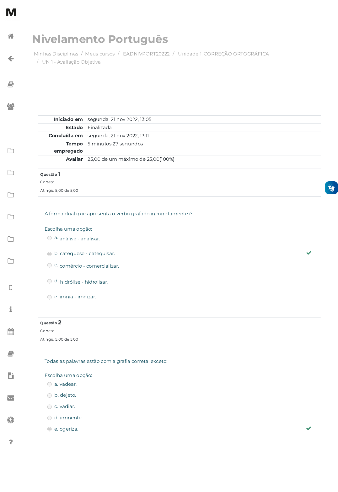 15/12/2022 14:18 UN 1 - Avaliação Objetiva: Revisão da tentativa https://avap.multivix.edu.br/mod/quiz/review.php?attempt=2363063&cmid=1104909 1/2 Minhas Disciplinas / Meus cursos / EADNIVPORT20222 / Unidade 1: CORREÇÃO ORTOGRÁFICA / UN 1 - Avaliação Objetiva Nivelamento Português Iniciado em segunda, 21 nov 2022, 13:05 Estado Finalizada Concluída em segunda, 21 nov 2022, 13:11 Tempo empregado 5 minutos 27 segundos Avaliar 25,00 de um máximo de 25,00(100%) Questão 1 Correto Atingiu 5,00 de 5,00 Questão 2 Correto Atingiu 5,00 de 5,00 A forma dual que apresenta o verbo grafado incorretamente é: Escolha uma opção: a. análise - analisar. b. catequese - catequisar. c. comércio - comercializar. d. hidrólise - hidrolisar. e. ironia - ironizar. Todas as palavras estão com a gra�a correta, exceto: Escolha uma opção: a. vadear. b. dejeto. c. vadiar. d. iminente. e. ogeriza. https://avap.multivix.edu.br/my/ https://avap.multivix.edu.br/course/view.php?id=15581 https://avap.multivix.edu.br/course/view.php?id=15581§ion=2 https://avap.multivix.edu.br/mod/quiz/view.php?id=1104909 https://avap.multivix.edu.br/my/ https://avap.multivix.edu.br/course/view.php?id=15581 https://avap.multivix.edu.br/user/index.php?id=15581 https://avap.multivix.edu.br/course/view.php?id=15581§ion=1 https://avap.multivix.edu.br/course/view.php?id=15581§ion=2 https://avap.multivix.edu.br/course/view.php?id=15581§ion=3 https://avap.multivix.edu.br/course/view.php?id=15581§ion=4 https://avap.multivix.edu.br/course/view.php?id=15581§ion=5 https://avap.multivix.edu.br/course/view.php?id=15581§ion=6 https://avap.multivix.edu.br/hooks/portal/ https://avap.multivix.edu.br/mod/page/view.php?id=1252%2F%22%20target%3D%22_blank https://avap.multivix.edu.br/calendar/view.php/ https://avap.multivix.edu.br/local/staticpage/view.php?page=biblioteca https://portalweb.multivix.edu.br/gabaritos/login.aspx https://multivix.edu.br/office-365/ https://multivix.edu.br/acessibilidade/ https://avap.multivix.edu.br/mod/page/view.php?id=7%2F%22%20target%3D%22_blank https://avap.multivix.edu.br/ https://avap.multivix.edu.br/ 15/12/2022 14:18 UN 1 - Avaliação Objetiva: Revisão da tentativa https://avap.multivix.edu.br/mod/quiz/review.php?attempt=2363063&cmid=1104909 2/2 Questão 3 Correto Atingiu 5,00 de 5,00 Questão 4 Correto Atingiu 5,00 de 5,00 Questão 5 Correto Atingiu 5,00 de 5,00 Assinale a alternativa em que todas as palavras estão grafadas corretamente: Escolha uma opção: a. batizar - sintetizar - sintonisar. b. poleiro - pagem - descrição. c. atrasado - princesa - paralisia. d. criação - disenteria - impecilho. e. enxergar - passeiar - pesquisar. Marque a opção em que todas as palavras estão grafadas corretamente: Escolha uma opção: a. nervoso - desa�o - atravez. b. berinjela - jiló - gipe. c. passos - discussão - arremesso. d. enxotar - trouxa - chícara. e. certeza - empresa - defeza. Assinalar a alternativa que completa as lacunas da frase abaixo, na ordem em que aparecem. "O Brasil de hoje é diferente, _____ os ideais de uma sociedade _____ justa ainda permanecem". Escolha uma opção: a. Nenhuma das alternativas b. mas - mas c. mas - mais d. mais - mas e. mais – mais ◄ Unidade 1 - Vídeo 02 Seguir para... Unidade 2 - Vídeo 01 ► https://avap.multivix.edu.br/mod/page/view.php?id=1104908&forceview=1 https://avap.multivix.edu.br/mod/page/view.php?id=1104910&forceview=1 https://avap.multivix.edu.br/my/ https://avap.multivix.edu.br/course/view.php?id=15581 https://avap.multivix.edu.br/user/index.php?id=15581 https://avap.multivix.edu.br/course/view.php?id=15581§ion=1 https://avap.multivix.edu.br/course/view.php?id=15581§ion=2 https://avap.multivix.edu.br/course/view.php?id=15581§ion=3 https://avap.multivix.edu.br/course/view.php?id=15581§ion=4 https://avap.multivix.edu.br/course/view.php?id=15581§ion=5 https://avap.multivix.edu.br/course/view.php?id=15581§ion=6 https://avap.multivix.edu.br/hooks/portal/ https://avap.multivix.edu.br/mod/page/view.php?id=1252%2F%22%20target%3D%22_blank https://avap.multivix.edu.br/calendar/view.php/ https://avap.multivix.edu.br/local/staticpage/view.php?page=biblioteca https://portalweb.multivix.edu.br/gabaritos/login.aspx https://multivix.edu.br/office-365/ https://multivix.edu.br/acessibilidade/ https://avap.multivix.edu.br/mod/page/view.php?id=7%2F%22%20target%3D%22_blank
