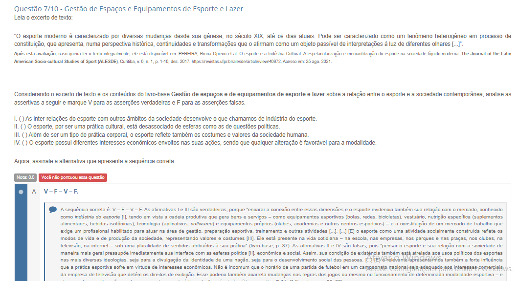 Questão 7/10 - Gestão de Espaços e Equipamentos de Esporte e Lazer Leia 0 excerto de texto: "O esporte moderno é caracterizado por diversas mudanças desde sua gênese, no século XIX, até dias atuais. Pode ser caracterizado como um fenômeno heterogêneo em processo de que apresenta, numa perspectiva continuidades e transformações que 0 afirmam como um objeto passível de interpretações à luz de diferentes olhares Após esta caso queira ler texto ele está disponível em: Bruna Opieco et al. esporte e a Indústria Cultural A espetacularização e mercantilização do esporte na sociedade liquido-moderna The Journal of the Latin American Socio-cultural Studies of Sport 6. n. p. dez Acesso em 25 2021. Considerando 0 excerto de texto e os do livro-base Gestão de espaços e de equipamentos de esporte e lazer sobre a relação entre 0 esporte e a sociedade analise as assertivas a seguir e marque V para as asserções verdadeiras e F para as asserções I. As inter-relações do esporte com outros âmbitos da sociedade desenvolve que chamamos de indústria do esporte. II. o esporte, por ser uma cultural, está desassociado de esferas como as de questões III. Além de ser um tipo de prática corporal, 0 esporte reflete também os costumes e valores da sociedade humana IV. esporte possui diferentes interesses econômicos envoltos nas suas ações, sendo que qualquer alteração é favorável para a Agora, assinale a alternativa que apresenta a sequência correta: Nota: 0.0 Você não pontuou essa questão A A sequência correta é: As afirmativas e III são verdadeiras, porque "encarar a conexão entre essas dimensões e esporte evidencia também sua relação com conhecido como do esporte [I]. tendo em vista a cadeia produtiva que gera bens e serviços como equipamentos esportivos redes, bicicletas). nutrição (suplementos bebidas isotônicas). tecnologia (aplicativos, softwares) e equipamentos próprios (clubes, academias e outros centros esportivos) - e a constituição de um mercado de trabalho que exige um profissional habilitado para atuar na área de preparação treinamento e outras atividades [E] esporte como uma atividade socialmente reflete modos de vida e de produção da representando valores e costumes [III]. Ele está presente na vida cotidiana - na escola, nas nos parques e nas nos na internet sob uma pluralidade de sentidos atribuídos à sua p. 37). As afirmativas II e IV são falsas, pois "pensar esporte e sua relação com a sociedade de maneira mais geral pressupõe imediatamente sua interface com as esferas política econômica e Assim, sua condição de existência também está atrelada aos dos esportes nas mais diversas seja para a divulgação da identidade de uma seja para desenvolvimento social das pessoas. a forte influência que a prática esportiva sofre em virtude de interesses Não é incomum que horário de uma partida de futebol em um napional interesses comerciais da empresa de televisão que detém os direitos de Esse poderio também acarreta mudanças nas regras dos jogos ou mesmo no funcionamento de determinada modalidade esportiva"