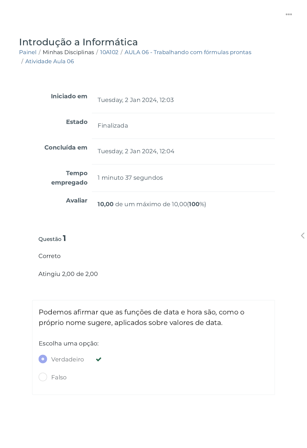 02/01/2024, 12:04 Atividade Aula 06 https://ava.politecnicabr.com.br/mod/quiz/review.php?attempt=6098783 1/5 Painel / Minhas Disciplinas / 10A102 / AULA 06 - Trabalhando com fórmulas prontas / Atividade Aula 06 Introdução a Informática Iniciado em Tuesday, 2 Jan 2024, 12:03 Estado Finalizada Concluída em Tuesday, 2 Jan 2024, 12:04 Tempo empregado 1 minuto 37 segundos Avaliar 10,00 de um máximo de 10,00(100%) Questão 1 Correto Atingiu 2,00 de 2,00 Podemos a�rmar que as funções de data e hora são, como o próprio nome sugere, aplicados sobre valores de data. Escolha uma opção: Verdadeiro Falso https://ava.politecnicabr.com.br/my/ https://ava.politecnicabr.com.br/my/ https://ava.politecnicabr.com.br/course/view.php?id=829 https://ava.politecnicabr.com.br/course/view.php?id=829#section-22 https://ava.politecnicabr.com.br/mod/quiz/view.php?id=38314 https://ava.politecnicabr.com.br/ 02/01/2024, 12:04 Atividade Aula 06 https://ava.politecnicabr.com.br/mod/quiz/review.php?attempt=6098783 2/5 Questão 2 Correto Atingiu 2,00 de 2,00 Tratando-se de Segmentação de textos no Excel podemos a�rmar que é possível capturar partes de um texto de acordo com a necessidade, segmentando o seu início, meio ou �m. Escolha uma opção: Questão 3 Correto Atingiu 2,00 de 2,00 Podemos a�rmar que a �m de solucionar o problema suscitado no exemplo anterior, é possível criar tabelas de valores de referência, e usar funções de pesquisa para localizar e retornar valores. Os Exemplos desse tipo de função são PROCV e PROCH. Escolha uma opção: Verdadeiro Falso Verdadeiro Falso https://ava.politecnicabr.com.br/ 02/01/2024, 12:04 Atividade Aula 06 https://ava.politecnicabr.com.br/mod/quiz/review.php?attempt=6098783 3/5 Questão 4 Correto Atingiu 2,00 de 2,00 Podemos a�rmar que A �m de veri�car todas as fórmulas lógicas existentes no Microsoft Excel, é possível acessar a faixa de opções Fórmulas, e na seção Biblioteca de funções clicar no item Lógicas. Escolha uma opção: Verdadeiro Falso https://ava.politecnicabr.com.br/ 02/01/2024, 12:04 Atividade Aula 06 https://ava.politecnicabr.com.br/mod/quiz/review.php?attempt=6098783 4/5 Questão 5 Correto Atingiu 2,00 de 2,00 Tratando-se de Fórmulas matemáticas no Excel julgue as a�rmativas a seguir. ( ) Pensando que no trato de planilhas eletrônicas os cálculos matemáticos têm grande importância, as fórmulas matemáticas possuem uma categoria exclusiva, denominada matemática e trigonometria. ( ) O que é fundamental aprender, em termos de fórmulas prontas no Microsoft Excel, é o funcionamento global da aplicação de fórmulas. ( ) Para fazer uso de fórmulas prontas, os de referências relativas e absolutas, bem como os conceitos de copiar e arrastar, continuam valendo. Escolha uma opção: a. F, F, V b. V, F, V c. F, V, V d. V, V, V e. V, F, F Entre em Contato Links Úteis Dicas da nossa Diretora Acadêmica https://soundcloud.com/user-501638417/sets/escola-politecnica-brasileira https://soundcloud.com/user-501638417/sets/escola-politecnica-brasileira https://ava.politecnicabr.com.br/ 02/01/2024, 12:04 Atividade Aula 06 https://ava.politecnicabr.com.br/mod/quiz/review.php?attempt=6098783 5/5 © 2022 - Escola Politécnica Brasileira https://www.politecnicabr.com.br 0800 084 2627 0800 084 2627 Planner de Estudos Declaração de Matrícula Orientações do AVA Abertura de Ticket Fale com o Tutor Cronograma de Estudos Manual de Estágio Manual de Competência Siga-nos nas redes sociais https://ava.politecnicabr.com.br/mod/quiz/0 https://ava.politecnicabr.com.br/mod/quiz/0 https://www.politecnicabr.com.br/ https://storage.googleapis.com/sirius-pubstore/semestre_plannerdeestudo%20poli.pdf https://storage.googleapis.com/sirius-pubstore/semestre_plannerdeestudo%20poli.pdf https://storage.googleapis.com/sirius-pubstore/declaracao_matricula.pdf https://storage.googleapis.com/sirius-pubstore/declaracao_matricula.pdf https://storage.googleapis.com/sirius-pubstore/orientacoes_ava.pdf https://storage.googleapis.com/sirius-pubstore/orientacoes_ava.pdf https://storage.googleapis.com/sirius-pubstore/abertura_ticket.pdf https://storage.googleapis.com/sirius-pubstore/abertura_ticket.pdf https://storage.googleapis.com/sirius-pubstore/fale_com_tutor.pdf https://storage.googleapis.com/sirius-pubstore/fale_com_tutor.pdf https://storage.googleapis.com/sirius-pubstore/cronograma_estudos.pdf https://storage.googleapis.com/sirius-pubstore/cronograma_estudos.pdf https://storage.googleapis.com/sirius-pubstore/manual_estagio.pdf https://storage.googleapis.com/sirius-pubstore/manual_estagio.pdf https://storage.googleapis.com/sirius-pubstore/manual_competencia.pdf https://storage.googleapis.com/sirius-pubstore/manual_competencia.pdf https://www.facebook.com/politecnicabr https://www.instagram.com/politecnicabr_oficial https://ava.politecnicabr.com.br/
