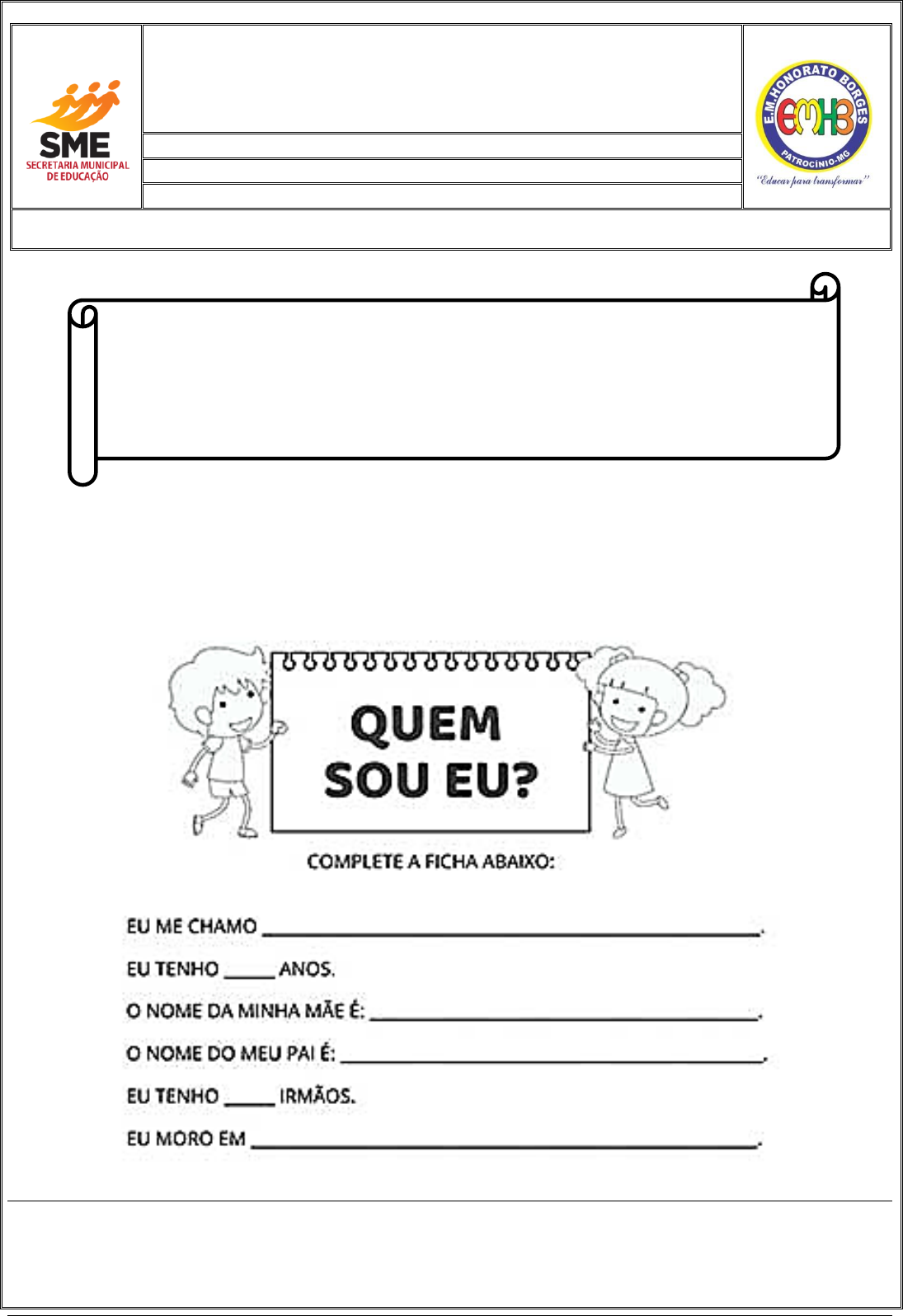 História é a ciência que investiga as ações dos seres humanos no tempo e no espaço, Todos nos fazemos parte da história, por isso, somos sujeitos históricos, cada dia contruímos nossa história com nossas ações. - AGORA É COM VOCÊ! FAÇA SUA AVALIAÇÃO COM ATENÇÃO! QUESTÃO 01 – Como vimos esse bimestre, cada ser humano é único e possui sua história, por isso, preencha a ficha com seus dados: QUESTÃO 02 – Agora faça um lindo desenho das três pessoas mais importantes na sua história e mostre como você é: AVALIAÇÃO BIMESTRAL DE HISTÓRIA 1° BIMESTRE Professor (a): Turma: 3º ano Data: Aluno (a): Nota: QUESTÃO 03 – Atualmente a maior parte da população brasileira vive em cidades. Você mora em uma linda cidade. Leia esse versinho e escreva qual é o nome da cidade em que você mora: Minha cidade se chama _______________________ ____________________________________________________________________ QUESTÃO 04 – Todos moramos em uma casa, ela fica em uma rua e nessa rua pode ter mais coisas além da nossa residência. Pinte os quadros que mostrem o que está presente na rua em que você mora. QUESTÃO 05 – Leia o texto com atenção: - Agora marque um X nas opções verdadeiras: ( ) Os indígenas foram os primeiro habitantes do Brasil. ( ) Só existem indígenas no Brasil. ( ) Os portugueses tentaram fazer os indígenas de escravos. ( ) A FUNAI é uma organização que atualmente defende os direitos da população indígena. ________________________________________________________________________________________ QUESTÃO 06 – Leia o texto e responda: - Os africanos foram trazidos pelos portugueses para o Brasil para: ( ) trabalhar como senhores de terra. ( ) trabalhar como profissionais remunerados. ( ) trabalhar como escravos. ____________________________________________________________________ QUESTÃO 7 – O Dia Internacional da Mulher, foi criado para valorizar os esforços e trabalho de todas as mulheres que por muitos anos não foram valorizados. Qual foi a data escolhida para celebrar este dia? Leia o texto a seguir e marque a opção correta: ( ) 8 de fevereiro ( ) 8 de março ( ) 8 de abril ( ) 8 de maio QUESTÃO 8 – No dia 7 de abril de 1842 a Vila de Nossa Senhora do Patrocínio passa a se chamar oficialmente “CIDADE DE PATROCÍNIO”. Em homenagem a esta data colora o bolo e escreva quantos anos nossa querida Patrocínio completou neste ano de 2024. Parabém Patrocínio pelos seus __________ anos!!!! QUESTÃO 9 – Observe a imagem a seguir: - Este é um local muito importante para a história da nossa cidade, mostre que você é muito esperto(a) e maque o nome do local registrado na imagem: ( ) Museu Professor Hugo Machado da Silveira ( ) Camâra Municipal. ( ) Biblioteca Municipal ( ) Conservatório de Música Abel Ferreira BOA AVALIAÇÃO!
