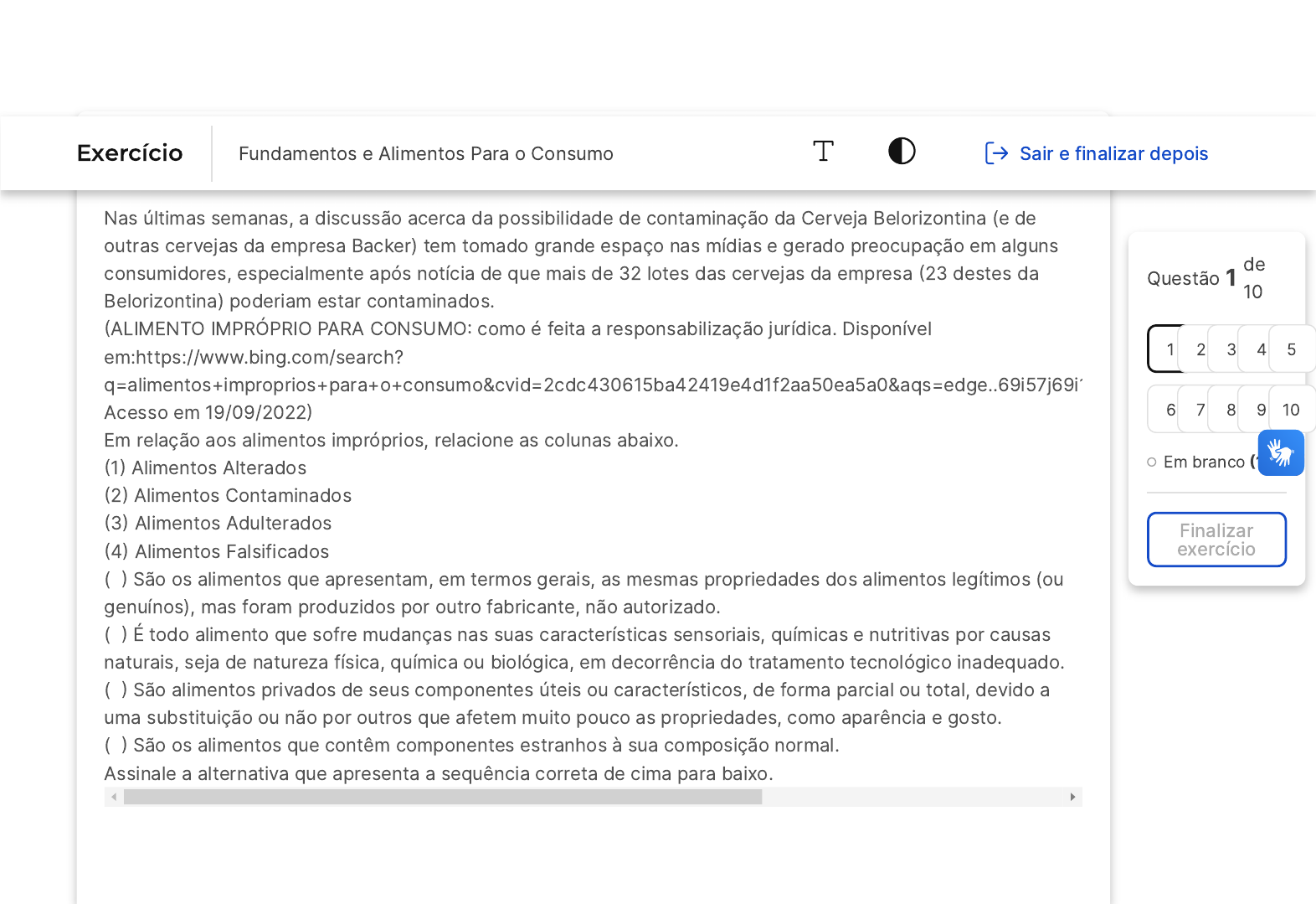 03/04/2024, 14:47 estacio.saladeavaliacoes.com.br/exercicio/660d9549139d33d914b1e952/ https://estacio.saladeavaliacoes.com.br/exercicio/660d9549139d33d914b1e952/ 1/10 1 Marcar para revisão Nas últimas semanas, a discussão acerca da possibilidade de contaminação da Cerveja Belorizontina (e de outras cervejas da empresa Backer) tem tomado grande espaço nas mídias e gerado preocupação em alguns consumidores, especialmente após notícia de que mais de 32 lotes das cervejas da empresa �23 destes da Belorizontina) poderiam estar contaminados. �ALIMENTO IMPRÓPRIO PARA CONSUMO� como é feita a responsabilização jurídica. Disponível em:https://www.bing.com/search? q=alimentos+improprios+para+o+consumo&cvid=2cdc430615ba42419e4d1f2aa50ea5a0&aqs=edge..69i57j69i1 Acesso em 19/09/2022� Em relação aos alimentos impróprios, relacione as colunas abaixo. �1� Alimentos Alterados �2� Alimentos Contaminados �3� Alimentos Adulterados �4� Alimentos Falsificados ( � São os alimentos que apresentam, em termos gerais, as mesmas propriedades dos alimentos legítimos (ou genuínos), mas foram produzidos por outro fabricante, não autorizado. ( � É todo alimento que sofre mudanças nas suas características sensoriais, químicas e nutritivas por causas naturais, seja de natureza física, química ou biológica, em decorrência do tratamento tecnológico inadequado. ( � São alimentos privados de seus componentes úteis ou característicos, de forma parcial ou total, devido a uma substituição ou não por outros que afetem muito pouco as propriedades, como aparência e gosto. ( � São os alimentos que contêm componentes estranhos à sua composição normal. Assinale a alternativa que apresenta a sequência correta de cima para baixo. Questão 1 de 10 Em branco �10� Finalizar exercício 1 2 3 4 5 6 7 8 9 10 Exercício Fundamentos e Alimentos Para o Consumo Sair e finalizar depois 03/04/2024, 14:47 estacio.saladeavaliacoes.com.br/exercicio/660d9549139d33d914b1e952/ https://estacio.saladeavaliacoes.com.br/exercicio/660d9549139d33d914b1e952/ 2/10 A B C D E A B 2 1 4 3. 4 3 1 2. 4 1 3 2. 1 3 2 4. 3 2 1 4. 2 Marcar para revisão Sabendo que lipídios, carboidratos e proteínas fazem parte do grupo dos macronutrientes e que as vitaminas pertencem aos micronutrientes, é possível afirmar que: Lipídios, carboidratos e proteínas são os principais responsáveis pelo fornecimento de energia, e as vitaminas exercem outras funções. Lipídios, carboidratos e proteínas são responsáveis pela regulação dos hormônios no organismo, e as vitaminas exercem outras funções. 03/04/2024, 14:47 estacio.saladeavaliacoes.com.br/exercicio/660d9549139d33d914b1e952/ https://estacio.saladeavaliacoes.com.br/exercicio/660d9549139d33d914b1e952/ 3/10 C D E A B C Lipídios, carboidratos e proteínas são os principais responsáveis pelo fornecimento de energia, assim como as vitaminas. Lipídios, carboidratos e proteínas são responsáveis pelos mecanismos de regulação no organismo, assim como as vitaminas. Lipídios, carboidratos e proteínas são responsáveis pela regulação dos hormônios no organismo, assim como as vitaminas. 3 Marcar para revisão Os alimentos impróprios para o consumo podem ser classificados de acordo com a característica que os define como impróprios. Nesse sentido, qual alternativa define as características dos alimentos falsificados? Possuem as mesmas propriedades gerais dos alimentos genuínos, mas são produzidos por fabricantes autorizados. Possuem algumas das mesmas propriedades dos alimentos genuínos, mas são produzidos por fabricante autorizado. Possuem exatamente as mesmas propriedades dos alimentos genuínos, mas são produzidos por fabricante não autorizado. 03/04/2024, 14:47 estacio.saladeavaliacoes.com.br/exercicio/660d9549139d33d914b1e952/ https://estacio.saladeavaliacoes.com.br/exercicio/660d9549139d33d914b1e952/ 4/10 D E A B Possuem as mesmas propriedades gerais dos alimentos genuínos, mas são produzidos por fabricante não autorizado. Possuem exatamente as mesmas propriedades dos alimentos genuínos, mas são produzidos por fabricante autorizado. 4 Marcar para revisão �UFF 2015 � Banca COSEAC� O alimento é definido como qualquer substância que fornece elementos necessários ao organismo humano para a sua manutenção, formação e seu desenvolvimento. Podem ser classificados, em relação à qualidade para o consumo humano, em aptos e não aptos. Julgue as assertivas que se seguem: I � Alimentos aptos são os que se enquadram nas especificações dos padrões de identidade e qualidade determinados por lei. II � Alimentos alterados são aqueles que têm aparência e características gerais de um produto legítimo e se denomina como este, sem sê-lo. III � Alimentos adulterados são aqueles que têm sido privados, parcial ou totalmente, de seus elementos úteis ou característicos, sendo ou não substituídos por outros inertes ou estranhos. Das assertivas acima: Todas são verdadeiras. Apenas I e II são verdadeiras. 03/04/2024, 14:47 estacio.saladeavaliacoes.com.br/exercicio/660d9549139d33d914b1e952/ https://estacio.saladeavaliacoes.com.br/exercicio/660d9549139d33d914b1e952/ 5/10 C D E A B C Apenas III é verdadeira. Apenas II e III são verdadeiras. Apenas I e III são verdadeiras. 5 Marcar para revisão Em relação à qualidade e segurança, os alimentos podem ser classificados em alimentos próprios/aptos ou alimentos impróprios/não aptos ao consumo. Qual das alternativas a seguir define melhor esses conceitos? Os alimentos impróprios ao consumo são aqueles que não atendem às expectativas do consumidor quanto às características de sabor. Os alimentos próprios ao consumo apresentam adequação quanto ao PIQ, respondendo às especificações da lei em vigor. Os alimentos impróprios ao consumo são aqueles que não atendem às expectativas do consumidor quanto às características de cor. 03/04/2024, 14: