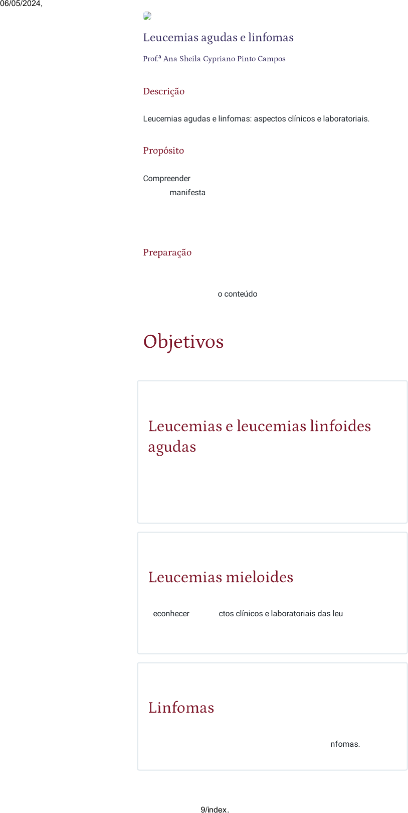 Leucemias agudas e linfomas Prof.ª Ana Sheila Cypriano Pinto Campos Descrição Leucemias agudas e linfomas: aspectos clínicos e laboratoriais. Propósito Compreender os principais transtornos de origem hematológica, sejam eles de manifestação aguda ou crônica, é essencial para a rotina diagnóstica dos laboratórios clínicos e auxilia a conclusão diagnóstica do paciente. Preparação Acesse um dicionário médico on-line para pesquisar as doenças que aparecem ao longo do conteúdo. Objetivos Módulo 1 Leucemias e leucemias linfoides agudas Descrever os aspectos clínicos e laboratoriais das leucemias linfoides agudas. Módulo 2 Leucemias mieloides Reconhecer os aspectos clínicos e laboratoriais das leucemias mieloides agudas. Módulo 3 Linfomas Identificar os aspectos clínicos e laboratoriais dos linfomas. 06/05/2024, 21:46 Leucemias agudas e linfomas https://stecine.azureedge.net/repositorio/00212sa/03909/index.html?brand=estacio# 1/45 Introdução As células sanguíneas são produzidas e renovadas pela medula óssea durante um processo altamente regulado e controlado conhecido como hematopoese. Em algumas condições patológicas, pode haver modificações do funcionamento normal da medula, cujas alterações na produção das células levam à proliferação de um tipo celular em detrimento de outro. Você certamente já ouviu falar em leucemia linfoide aguda (LLA), uma neoplasia hematológica com o predomínio de linfoblastos (células imaturas precursoras das células brancas), algo comum em crianças. Normalmente, o aumento do número de blastos circulantes é acompanhado pela diminuição da quantidade de plaquetas e de hemácias. Entretanto, isso corresponde a um tipo de transtorno hematológico entre vários outros tipos e subtipos já descritos, cada um com diferentes manifestações clínicas, tratamento e, principalmente, prognósticos, os quais, aliás, podem ser bons, como na LLA infantil, ou não tão promissores. Ao longo deste conteúdo, conheceremos as alterações que ocorrem nas células brancas (nossas células de defesa), abordando os aspectos clínicos e laboratoriais das leucemias agudas e dos linfomas. 1 - Leucemias e leucemias linfoides agudas 06/05/2024, 21:46 Leucemias agudas e linfomas https://stecine.azureedge.net/repositorio/00212sa/03909/index.html?brand=estacio# 2/45 Ao �nal deste módulo, você será capaz de descrever os aspectos clínicos e laboratoriais das leucemias linfoides agudas. Leucemias Características gerais da leucemia O termo leucemia refere-se a um grupo de doenças complexas e diferentes que ocorre pela proliferação desordenada de células hematológicas malignas. Todo esse processo acontece na medula óssea, mas pode acometer gânglios linfáticos e outros órgãos do corpo, como baço, testículos, fígado e sistema nervoso central (SNC). As células encontradas em uma pessoa saudável e em outra com leucemia. E você lembra o que é a medula óssea? Ela é um tecido esponjoso que ocupa a cavidade central dos ossos. A partir de um pequeno grupo de células (denominadas células-tronco hematopoéticas), todo o processo de formação das células sanguíneas se desencadeia, conforme demonstramos a seguir: Esquema clássico representativo da hematopoese a partir de uma célula multipotente. A hematopoese normal nós já conhecemos; entretanto, quando há falhas na regulação da proliferação e da diferenciação, provavelmente se está diante de um caso de leucemia. Mas como acontecem essas falhas? Basicamente, ocorre uma ativação de genes, os quais, por sua vez, levam à proliferação celular descontrolada com os seguintes processos: Inibição da apoptose e dos genes relacionados à diferenciação celular. Diminuição da produção de células normais pela medula óssea. Migração de células neoplásicas para outros órgãos. Imunodeficiência. De modo geral, essas alterações genéticas estão correlacionadas aos fatores de risco extrínsecos, como exposição à radiação, aos agentes químicos, às radioterapias e quimioterapias prévias, assim como infecções virais e síndromes genéticas. Além disso, elas envolvem fatores relacionados ao hospedeiro, como predisposição genética, doenças hematológicas prévias e hereditariedade. Manifestações clínicas da leucemia 06/05/2024, 21:46 Leucemias agudas e linfomas https://stecine.azureedge.net/repositorio/00212sa/03909/index.html?brand=estacio# 3/45 A leucemia provoca manifestações clínicas inespecíficas, conforme ilustra a imagem a seguir: Sintomas comuns da leucemia. Essas manifestações clínicas, muitas vezes, são similares às de muitas outras patologias, como a artrite reumatoide juvenil, a febre reumática, o lúpus eritematoso sistêmico, a púrpura trombocitopênica idiopática, a aplasia medular e a mononucleose infecciosa. Por isso, o diagnóstico diferencial é necessário. Uma das principais ferramentas de diagnóstico é o mielograma, um exame que avalia a medula óssea do paciente. Mielograma O mielograma é realizado por punção óssea (normalmente, a partir dos ossos do ilíaco, do esterno e da tíbia), seguida de aspiração, o que requer uma anestesia local. Para entender isso melhor, imagine um paciente que apresente predomínio de células imaturas (blastos) durante a análise de uma distensão sanguínea em um exame de rotina. Esse paciente será encaminhado ao médico com a suspeita de uma leucemia aguda, mas, para o diagnóstico ser confirmado, terá de fazer um mielograma. Desse modo, a confirmação diagnóstica da leucemia aguda ocorrerá somente após a análise das células presentes na medula óssea e a constatação da presença de mais de 20% de blastos. Procedimento de punção para obtenção de amostras da medula óssea. O diagnóstico da leucemia, no entanto, pode ser feito das seguintes maneiras: Microscopia óptica com coloração especial (análise citoquímica). Citometria de fluxo (imunofenotipagem). T