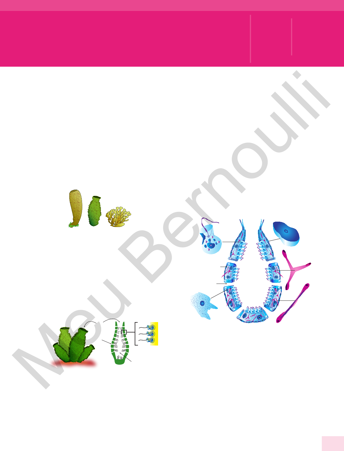 PORÍFEROS (ESPONGIÁRIOS, ESPONJAS) São metazoários (animais pluricelulares), eucariontes, heterótrofos, assimétricos ou com simetria radial, exclusivamente aquáticos. A maioria das 10 mil espécies é constituída por animais marinhos; cerca de 50 espécies vivem na água-doce. Não possuem uma verdadeira organização histológica, isto é, não possuem tecidos bem definidos e, por isso, formam o sub-reino Parazoa (parazoários). Ar qu iv o Be rn ou lli Morfologia dos poríferos. Quando adultos, são animais sésseis (fixos) que vivem afixados sobre diferentes substratos (rochas, conchas de moluscos, solo marinho) e apresentam morfologia variada (forma de vaso tubular, ramificada, globular), com tamanho variando de alguns poucos milímetros até cerca de 2 metros. Podem ter diferentes colorações (cinzenta, vermelha, amarela), embora também existam espécies quase transparentes (de aspecto vítreo). Possuem o corpo todo perfurado por poros, vindo daí o nome do grupo: poríferos (do latim poris, poro; phoros, possuir). Os poros são de dois tipos, óstios e ósculo, e comunicam a superfície externa do corpo com uma cavidade central, denominada átrio ou espongiocele (espongiocela). Esponjas adultas Espongiocele Óstios Ósculos Coanócitos Poríferos. Os óstios são poros menores que se distribuem por toda a superfície externa do corpo do animal e é por onde, constantemente, entra água proveniente do meio ambiente. Por isso, os óstios são também chamados de poros inalantes. O ósculo é um poro maior, localizado no ápice do corpo do animal, por onde permanentemente sai água. É, portanto, um poro exalante. Ar qu iv o Be rn ou lli A água circula permanentemente pelo corpo dos poríferos, entrando pelos óstios, passando pela espongiocele e saindo pelo ósculo. Partículas de alimento (algas e protozoários planctônicos) que entram junto da água são apanhadas e digeridas por células especiais, os coanócitos, existentes nas paredes da espongiocele. Os poríferos, portanto, são animais filtradores que retiram seus alimentos da corrente de água que circula pelo interior de seu corpo. A água que penetra pelos óstios traz nutrientes e oxigênio, e a água que sai pelo ósculo se encarrega de levar os resíduos da digestão e o gás carbônico produzido pelas células. A figura a seguir representa uma esponja simples, em corte longitudinal, mostrando os diferentes tipos de células encontradas no corpo desses animais. Ósculo Pinacócito Espícula Espícula Coanócito Meso-hilo Átrio ou espongiocele Óstio Amebócito Esquema de uma esponja. Conforme mostra a figura anterior, encontramos nos poríferos os seguintes tipos de células: • Pinacócitos – Células achatadas que formam o revestimento externo do corpo do animal. • Coanócitos – Células flageladas que formam a parede interna, isto é, a parede que delimita a cavidade central (átrio ou espongiocele). São responsáveis pela captura e digestão das partículas de alimento que penetram pelos óstios junto da água. Os nutrientes resultantes dessa digestão difundem-se às outras células do corpo, e os resíduos não digeridos são lançados no átrio e eliminados através do ósculo, juntamente à água que sai. Os batimentos dos flagelos impelem a água, garantindo, assim, uma contínua circulação interna desta. MÓDULO 06 FRENTE B 57Bernoulli Sistema de Ensino BIOLOGIA Poríferos e cnidários (celenterados) Meu Bern ou lli • Amebócitos (arqueócitos) – Células móveis que se deslocam à custa de pseudópodos (movimentos ameboides). São encontradas no meso-hilo (anteriormente chamado de mesênquima), uma camada gelatinosa localizada entre as paredes externa e interna do corpo do animal. Além de realizar a distribuição de nutrientes, os amebócitos também podem dar origem às outras células. • Porócitos – Células que formam os poros da superfície do corpo, isto é, os óstios. Cada poro é, na realidade, um pequeno canal que passa no interior de uma dessas células. • Escleroblastos – Células produtoras de espículas, estruturas pontiagudas constituídas de carbonato de cálcio (CaCO3) ou de dióxido de silício (SiO2). As espículas, juntamente com fibras proteicas de espongina, formam a estrutura de sustentação do corpo, isto é, o esqueleto do porífero. Essas células e as espículas que produzem também são encontradas no meso-hilo. • Gametas – São os espermatozoides e os óvulos, originários da diferenciação de amebócitos que ficam dispersos pelo meso-hilo. Coanócitos Amebócitos Escleroblastos Espícula Coanócitos, amebócitos e escleroblastos (células produtoras das espículas). Nos poríferos, não existe tipo de sistema, isto é, nesses animais, os sistemas digestório, respiratório, circulatório, excretor, nervoso, endócrino e reprodutor são inexistentes. A digestão é apenas intracelu lar, ocorrendo, particularmente, nos coanócitos. A respiração é feita por difusão direta dos gases (O2 e CO2) através da membrana plasmática das células que se encontram em contato com a água circulante. Não há sangue nem sistema circulatório. A distribuição de substâncias pelo corpo do animal é feita por difusão ou pelos amebócitos. A excreção também se faz por difusão direta, através da membrana plasmática das células. Não há sistema nervoso nem órgãos sensoriais. De acordo com o grau de complexidade, as esponjas são classificadas em três tipos: Ascon, Sycon e Leucon. A B C Ar qu iv o Be rn ou lli A. Ascon – É o tipo mais simples e de paredes mais finas. Nas esponjas desse tipo, os poros formam canais inalantes não ramificados, que desembocam diretamente no átrio ou espongiocele. Os coanócitos não se situam nas paredes desses canais, e sim na parede que delimita a espongiocele. B. Sycon – Os canais inalantes desembocam em canais radiais, os quais, por sua vez, desembocam no átrio (espongiocele). Nesse tipo de esponja, a