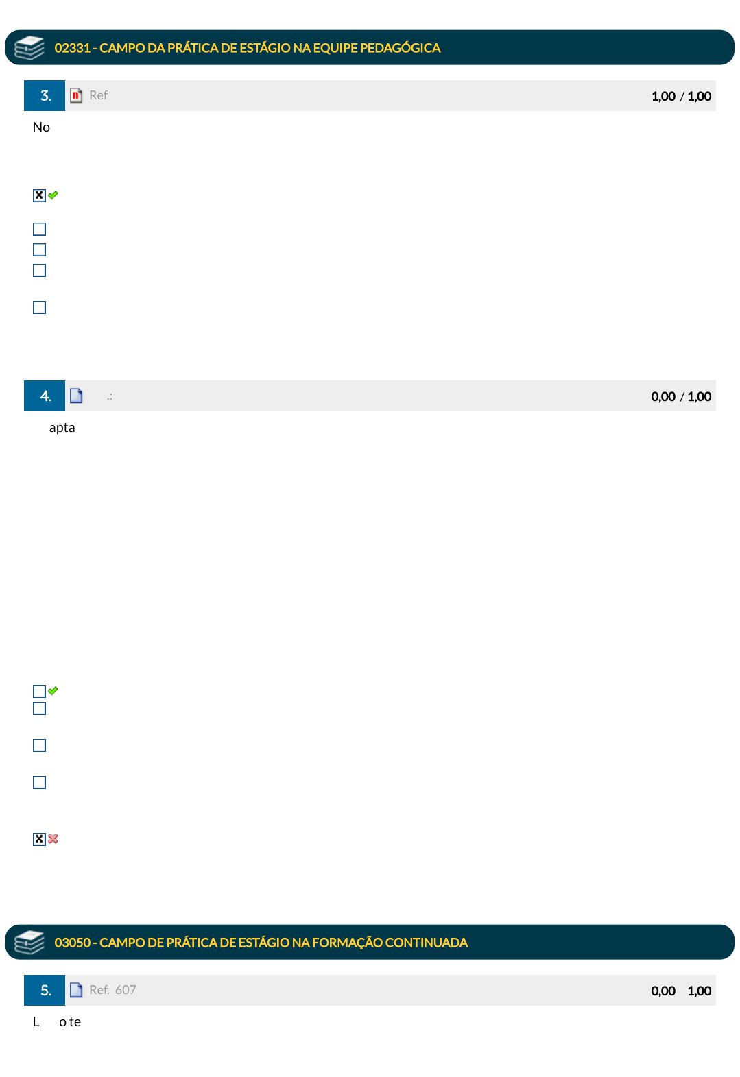 02331 - CAMPO DA PRÁTICA DE ESTÁGIO NA EQUIPE PEDAGÓGICA 3. Ref.: 6076205 Pontos: 1,00 / 1,00 No âmbito da gestão democrática do ensino, o acolhimento e valorização de todos esses saberes e vivências coletivas, são condutas indispensáveis a que a escola possa ser considerada como um espaço efetivamente democrático. No tocante à gestão democrática, pode-se a�rmar que se trata de: decisões coletivas que implicam na participação da comunidade escolar na gestão da escola e o respeito aos princípios e às �nalidades da educação. uma imposição do Conselho Educacional da América do Sul, e limitado pelo governo brasileiro. um mecanismo concentração das ações e decisões a respeito do projeto político pedagógico. a escola estar sempre apta e aberta para receber indivíduos portadores de de�ciência, sem levar em conta o tipo e o grau da situação especí�ca. um projeto que prioriza as decisões dos diretores, uma vez que estes são os únicos atores do processo de gestão democrática. 4. Ref.: 6084576 Pontos: 0,00 / 1,00 Adaptado de VUNESP - 2012 Leia o texto, a seguir: Os líderes escolares e�cazes, avaliados em pesquisas feitas com alunos e apontados por dirigentes educacionais, são capazes de empregar uma série de habilidades de liderança. Para começar são propensos para de�nir objetivos claros que servem como fonte contínua de motivação. LÜCK, Heloísa. Ação integrada: administração, supervisão e orientação educacional. Petrópolis: Vozes, 2002.Estão presentes na ação de diretores e�cazes, as seguintes características: Condução e liderança dos processos escolares de tal forma que a instituição possa funcionar de forma e�caz. Participação na construção do Projeto Pedagógico da escola, relacionamento unilateral com professores e criação de regras disciplinares. Prestar assistência aos professores acerca das estratégias pedagógicas que venham a desempenhar no seu cotidiano com os alunos. Prática de gestão participativa, organização regrada da rotina escolar e o estabelecimento do planejamento de curso. Presta ajuda em fazeres administrativos, pedagógicos, burocráticos e de articulação e atendimento à comunidade. 03050 - CAMPO DE PRÁTICA DE ESTÁGIO NA FORMAÇÃO CONTINUADA 5. Ref.: 6076363 Pontos: 0,00 / 1,00 Leia o texto abaixo: É certo que eu era ingênua ao imaginar, durante o ensino médio, que recebia orientação espiritual e intelectual da parte de escritores, pensadores e acadêmicos no contexto universitário. Encontrar uma tal coisa seria o mesmo que javascript:alert('C%C3%B3digo da quest%C3%A3o: 6076205.'); javascript:alert('C%C3%B3digo da quest%C3%A3o: 6076205.'); javascript:alert('C%C3%B3digo da quest%C3%A3o: 6084576.'); javascript:alert('C%C3%B3digo da quest%C3%A3o: 6084576.'); javascript:alert('C%C3%B3digo da quest%C3%A3o: 6076363.'); javascript:alert('C%C3%B3digo da quest%C3%A3o: 6076363.'); descobrir um tesouro precioso. Aprendi, junto com os outros alunos, a me dar por contente que se encontrasse um professor interessante capaz de falar de maneira envolvente. A maioria dos meus professores não estavam nem um pouco interessados em nos esclarecer. Mais que qualquer outra coisa, pareciam fascinados pelo exercício do poder da autoridade dentro do seu reininho - a sala de aula. HOOKS, Bell. Ensinando a transgredir: a educação como prática da liberdade. São Paulo Martins Fontes, 2013. Podemos dizer que o texto acima trata: Do estagiário como uma �gura que deverá ser considerada incompleta. Dos limites presentes numa educação que não dialoga com o campo. Do papel centralizador do conteúdo. Dos caminhos corretos de ignorar os outros e focar apenas no exercício clássico da docência. Do reforço do intelectual conceitual na docência. 6. Ref.: 6076365 Pontos: 1,00 / 1,00 A formação continuada é a formulação de um caminho constante de reconhecimento intelectual e pro�ssional. Com relação à formação continuada, é correto a�rmar: I. Podem ser geradas por demandas individuais e/ou coletivas. II. A BNCC deve orientar todas as formações. III. Precisam dialogar com as demandas identi�cadas no campo de observação. IV. Podem ignorar as vozes dos professores em formação. Podemos dizer que as opções corretas são: II e IV. I e II. II e III. I e IV. I e III. 03096 - CAMPO DE PRÁTICA DE ESTÁGIO EM GESTÃO EDUCACIONAL 7. Ref.: 6086401 Pontos: 1,00 / 1,00 Adaptado de Prefeitura de Fortaleza - CE - 2021 Leia o texto: A gestão escolar também é engendrada como um sistema que agrega pessoas, considerando o caráter intencional de suas ações e as interações sociais que estabelecem entre si e com o contexto sociopolítico, nas formas democráticas de tomada de decisões. LIBÂNEO, José Carlos. A organização e a gestão da escola: teoria e prática. Goiânia: Alternativa, 2007. Sobre o assunto, preencha as lacunas: javascript:alert('C%C3%B3digo da quest%C3%A3o: 6076365.'); javascript:alert('C%C3%B3digo da quest%C3%A3o: 6076365.'); javascript:alert('C%C3%B3digo da quest%C3%A3o: 6086401.'); javascript:alert('C%C3%B3digo da quest%C3%A3o: 6086401.'); A atuação da gestão escolar, sob a liderança do __________, deve funcionar como um __________, propondo a adoção de uma linha __________ de ação, pela qual se pode promover o __________ da escola como um todo, e não apenas a __________ de problemas imediatos, de acordo com o seu __________. Qual a opção que contém a sequência correta? administrativo, setor, corporativa, ambiente, distribuição, clima escolar. professor, colegiado, conceitual, objetivo, indicação, rendimento. professor, canal, rígida, desenvolvimento, lista, per�l. diretor, secretaria, burocrática, controle, gestão, princípio. diretor, sistema, integrada, desenvolvimento, resolução, surgimento. 8. Ref.: 7945623 Pontos: 0,00 / 1,00 A legislação brasileira e a própria Constituição Federal trazem orientações normativas de extr