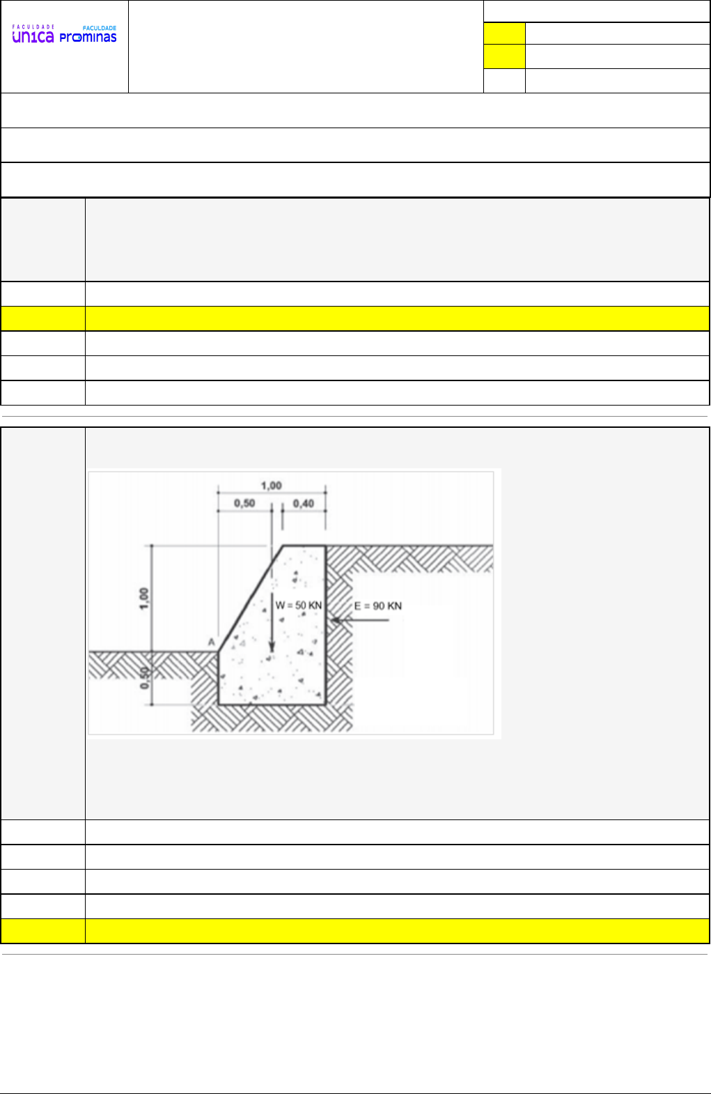 Pincel Atômico - 06/05/2024 23:33:01 1/2 JOSÉ CARLOS PEREIRA DE JESUS Avaliação Online (SALA EAD) Atividade finalizada em 22/02/2024 10:31:40 (1525073 / 1) LEGENDA Resposta correta na questão # Resposta correta - Questão Anulada X Resposta selecionada pelo Aluno Disciplina: MECÂNICA DOS SOLOS II [240460] - Avaliação com 5 questões, com o peso total de 15,00 pontos [capítulos - 1,2,3] Turma: Graduação: Engenharia Civil - Grupo: AGOSTO/2021 - EC/AGO/21 [24493] Aluno(a): 91375929 - JOSÉ CARLOS PEREIRA DE JESUS - Respondeu 5 questões corretas, obtendo um total de 15,00 pontos como nota [360743_170591] Questão 001 Um muro apresenta uma contenção vertical e retroaterro inclinado de 13,5°. Para uma altura de 2,7 m, cujo peso específico do solo é de 18 kN.m-3, coesão do solo igual a zero e o ângulo de atrito interno apresentou o valor de 37°, o valor do empuxo passivo, segundo a Teoria de Rankine, vale: 171,49 kN.m-1 X 233,24 kN.m-1 83,25 kN.m-1 433,52 kN.m-1 369,38 kN.m-1 [360743_170613] Questão 002 (ENADE/2011 – Adaptada) O muro de arrimo que se apresenta na figura abaixo teve sua seção transversal pré-dimensionada conforme indicado no desenho. Suponha que o empuxo de terra ativo de magnitude 90 kN atua perpendicularmente ao parâmetro do muro e que este muro de concreto ciclópico pesa 50 kN. Se o momento de tombamento (Mt) é aquele provado apenas pelo empuxo de terra e o momento resistente (Mr) é proveniente apenas do peso do muro, então: Mt = 50 kN.m e Mr = 90 kN.m Mt = 40 kN.m e Mr = 70 kN.m Mt = 90 kN.m e Mr = 50 kN.m Mt = 45 kN.m e Mr = 85 kN.m X Mt = 45 kN.m e Mr = 50 kN.m Pincel Atômico - 06/05/2024 23:33:01 2/2 [360743_170572] Questão 003 (ELETROSUL/2010) Sobre a resistência ao cisalhamento do solo, faz-se as seguintes afirmações: I.A resistência ao cisalhamento do solo depende da trajetória de tensões. II.A resistência ao cisalhamento das areias fofas e argilas moles é obtida por meio de ensaios de campo. III.Os solos argilosos apresentam comportamento dependente das condições do solo na fase de adensamento e na fase de cisalhamento. Assinale a alternativa correta: I, II e III estão incorretas. X I, II e III estão corretas. Apenas I está correta. Apenas I e III estão corretas. Apenas II e III estão corretas. [360744_168727] Questão 004 Antes de atingir a ruptura, quando se submete uma amostra de solo arenoso ao ensaio de cisalhamento, constata-se que, influenciado pelo seu grau de compacidade, a areia sofre: aumento da resistência. diminuição da resistência. X alteração em seu volume. perda de coesão. forças de atrito. [360745_168733] Questão 005 O corpo de prova saturado é submetido primeiramente a uma pressão de confinamento em todo o seu entorno e, com isso, toda a pressão neutra se dissipa, tornando-se desprezível. Em seguida, a pressão axial é aumentada lentamente, a fim de que a água sob pressão possa sair. Durante o ensaio, a pressão neutra é quase nula, e as tensões totais inseridas estabelecem as tensões efetivas que estavam processando-se. O trecho anterior se refere ao ensaio de: cisalhamento direto. ensaio oedométrico. X ensaio triaxial adensado drenado ou ensaio drenado. ensaio não adensado não drenado ou ensaio não drenado. ensaio triaxial ensaio adensado não drenado.