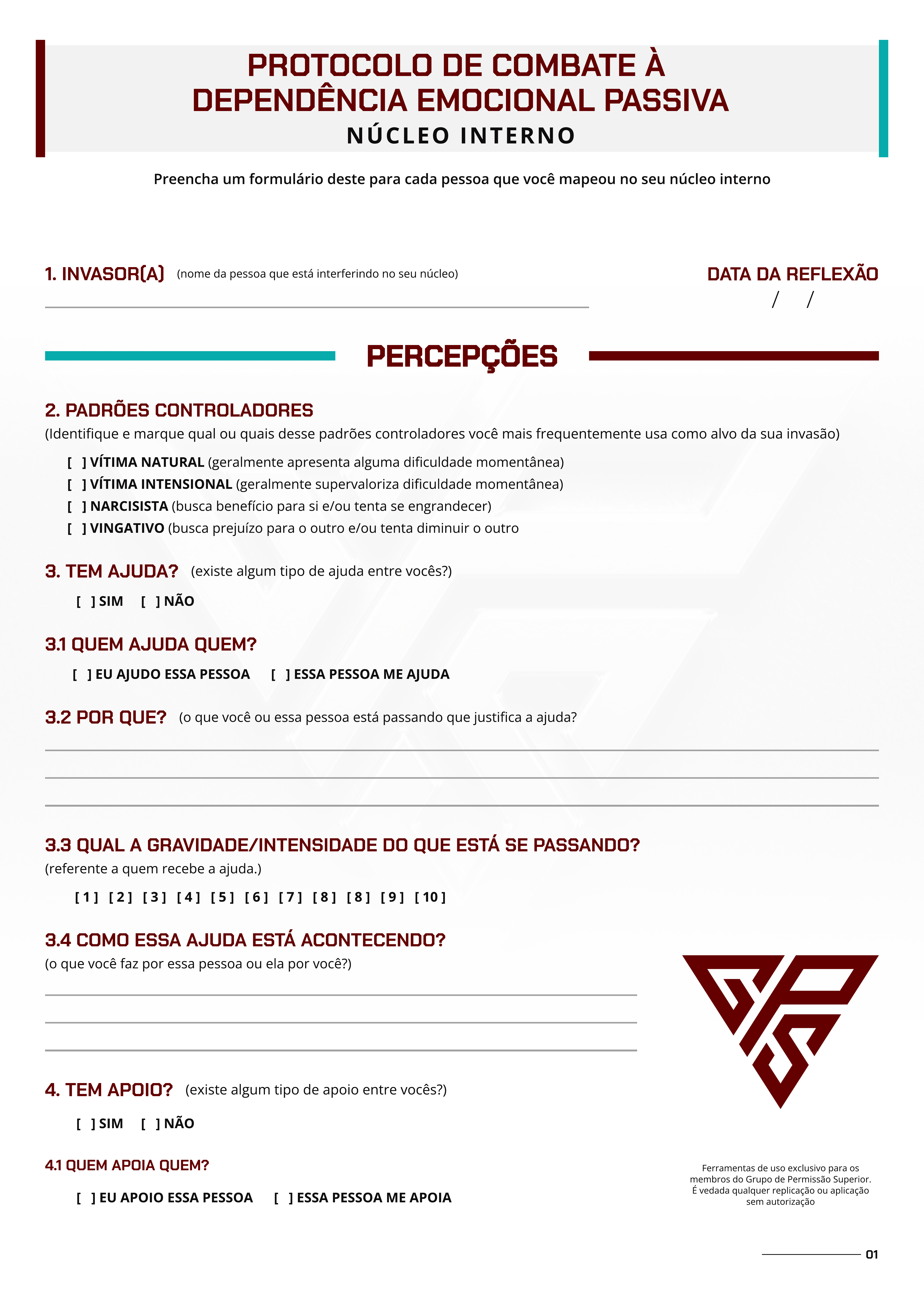 01 Ferramentas de uso exclusivo para os membros do Grupo de Permissão Superior. É vedada qualquer replicação ou aplicação sem autorização[ ] EU APOIO ESSA PESSOA [ ] ESSA PESSOA ME APOIA 4.1 QUEM APOIA QUEM? [ ] SIM [ ] NÃO 4. TEM APOIO? (existe algum tipo de apoio entre vocês?) 3.4 Como essa ajuda está acontecendo? (o que você faz por essa pessoa ou ela por você?) [ 1 ] [ 2 ] [ 3 ] [ 4 ] [ 5 ] [ 6 ] [ 7 ] [ 8 ] [ 8 ] [ 9 ] [ 10 ] 3.3 QUAL A GRAVIDADE/INTENSIDADE DO QUE ESTÁ SE PASSANDO? (referente a quem recebe a ajuda.) 3.2 POR QUE? (o que você ou essa pessoa está passando que justifica a ajuda? [ ] EU AJUDO ESSA PESSOA [ ] ESSA PESSOA ME AJUDA 3.1 QUEM AJUDA QUEM? [ ] SIM [ ] NÃO 3. TEM AJUDA? (existe algum tipo de ajuda entre vocês?) [ ] VÍTIMA NATURAL (geralmente apresenta alguma dificuldade momentânea) [ ] VÍTIMA INTENSIONAL (geralmente supervaloriza dificuldade momentânea) [ ] NARCISISTA (busca benefício para si e/ou tenta se engrandecer) [ ] VINGATIVO (busca prejuízo para o outro e/ou tenta diminuir o outro 2. Padrões Controladores (Identifique e marque qual ou quais desse padrões controladores você mais frequentemente usa como alvo da sua invasão) PERCEPÇÕES 1. INVASOR(A) (nome da pessoa que está interferindo no seu núcleo) DATA DA REFLEXÃO / / Preencha um formulário deste para cada pessoa que você mapeou no seu núcleo interno Protocolo de Combate à Dependência Emocional PASSIVA NÚCLEO INTERNO 02 4.2. POR QUE? (o que você ou essa pessoa está tentando fazer?) [ 1 ] [ 2 ] [ 3 ] [ 4 ] [ 5 ] [ 6 ] [ 7 ] [ 8 ] [ 8 ] [ 9 ] [ 10 ] 4.3. QUAL A INTENSIDADE DO ESFORÇO QUE ESTÁ SENDO APLICADO NESSA TENTATIVA? (referente a quem recebe o apoio.) 4.4. COMO ESSE APOIO ESTÁ ACONTECENDO? (que suporte você oferece para essa pessoa ou ela para você?) 5. revelando as intenções e expectativas do(a) invasor(a) 5.1. qual a intenção do(a) invasor(a) com essa interferência? (o que essa pessoa espera que aconteça?) PROJETADA OU REVELADA? Isso é o que: [ ] VOCÊ ACHA [ ] O(A) INVASOR(A) REVELOU 5.2. POR QUE O(A) INVASOR(A) QUER QUE ISSO ACONTEÇA? PROJETADA OU REVELADA? Isso é o que: [ ] VOCÊ ACHA [ ] O(A) INVASOR(A) REVELOU 5.3. QUE EXPECTATIVAS O(A) INVASOR(A) TEM COM ESSA INTERFERÊNCIA? PROJETADA OU REVELADA? Isso é o que: [ ] VOCÊ ACHA [ ] O(A) INVASOR(A) REVELOU 5.4. POR QUE ESSA PESSOA FAZ QUESTÃO QUE AS COISAS ACONTEÇAM DESSA FORMA? PROJETADA OU REVELADA? Isso é o que: [ ] VOCÊ ACHA [ ] O(A) INVASOR(A) REVELOU Ferramentas de uso exclusivo para os membros do Grupo de Permissão Superior. É vedada qualquer replicação ou aplicação sem autorização 03 Ferramentas de uso exclusivo para os membros do Grupo de Permissão Superior. É vedada qualquer replicação ou aplicação sem autorização 6. danos (Quais prejuízos essa interferência já causou ou está causando:) 6.1. na sua vida 6.2. na vida do(a) invasor(a) DECISÕES 7. CONSTRUINDO O NÃO 7.1. LIMITE: Qual limite de interferência você irá estabelecer nesta relação com o invasor(a) com o objetivo de diminuir a interferência e preservar, valorizar e melhorar a relação entre vocês? 7.2. ACORDO: Qual é o combinado que você vai fazer com essa pessoa para que o limite definido para a interferência dela seja mantido? 7.3. retratação 7.3.1. retratação: Existe alguma coisa que precisa/pode ser feita e que você faz questão que seja feita para reparar o dano causado por essa invasão? Comente! 7.3.2. O que você pode fazer para seguir em frente (manter o limite estabelecido) caso essa pessoa não tenha disposição ou capacidade de se retratar? 04 Ferramentas de uso exclusivo para os membros do Grupo de Permissão Superior. É vedada qualquer replicação ou aplicação sem autorização 7.3.3. Existe alguma coisa que você precisa fazer para se retratar com essa pessoa? Comente! 7.4. reparação 7.4.1. reparação: Existe algo que voê espera que o(a) invasor(a) faça para reparar ou minimizar o dano causado por essa interferência? 7.4.2. O que você mesmo(a) pode fazer para reparar ou minimizar o dano causado por essa interferência caso o(a) invasor(a) não faça nada? 7.5. atualizando a sua intenção (o que você espera com essa sua nova posição na relação?) 7.6. atualizando a sua expectativa (como você espera que o outro reaja com essa sua nova proposta para a relação de vocês? Lembrando que essa pessoa provavelmente não está preparada para essa nova percepção que você está levando.) AÇÕES 7.7. O QUE VOCÊ VAI FAZER COM TUDO ISSO QUE VOCÊ PERCEBEU E DECIDIU? 7.8. QUANDO VOCÊ FARÁ? / / 7.9. O QUE VOCÊ PODE E VAI FAZER EM NO MÁXIMO 24 HORAS EM RELAÇÃO A TUDO ISSO? 7.10. QUEM SERÁ O GUARDIÃO DESSA DECISÃO? (uma pessoa escolhida por você - de preferência do seu GPS - que te incentivará a concluir a ação dentro do prazo e que irá comemorar o resultado dela contigo?) 05 Ferramentas de uso exclusivo para os membros do Grupo de Permissão Superior. É vedada qualquer replicação ou aplicação sem autorização PERCEPÇÕES PÓS AÇÃO 8. FECHANDO O CICLO 8.1. QUANDO VOCÊ FEZ O QUE HAVIA SE COMPROMETIDO EM FAZER? / / 8.2. COMO VOCÊ SE SENTIU NO MOMENTO DA CONVERSA? 8.3. COMO VOCÊ ESTÁ SE SENTINDO POR TER ESTABELECIDO LIMITES NESTA INTERFERÊNCIA? 8.4. ACONTECEU ALGUMA COISA FORA DO PROGRAMADO OU DO ESPERADO? sE SIM, O QUE? 8.5. O QUE VOCÊ ENTENDEU E/OU DESCOBRIU AO COLOCAR ESSE NOVO LIMITE EM PRÁTICA? 8.6. O QUE DE MAIS IMPORTANTE VOCÊ APRENDEU COM TUDO ISSO? RESUMA ESSA EXPERIÊNCIA EM UMA ÚNICA FRASE.