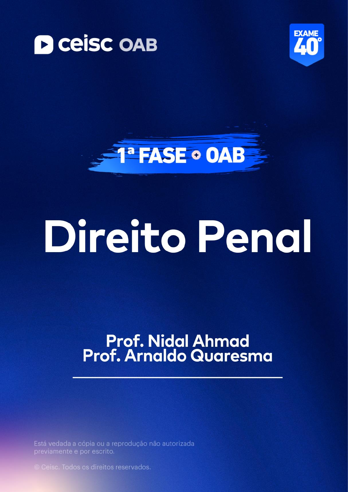 1ª Fase | 40° Exame da OAB Direito Penal 1 DIREITO PENAL 1ª Fase | 40° Exame da OAB Direito Penal 2 Olá! Boas-Vindas! Cada material foi preparado com muito carinho para que você possa absorver da melhor forma possível, conteúdos de qua- lidade. Lembre-se: o seu sonho também é o nosso. Bons estudos! Estamos com você até a sua aprovação! Com carinho, Equipe Ceisc. ♥ 1ª Fase | 40° Exame da OAB Direito Penal 3 1ª FASE OAB | 40° EXAME Direito Penal Prof. Nidal Ahmad Prof. Arnaldo Quaresma Sumário 1. Aplicação da Lei Penal ............................................................................................................. 4 2. Do crime ................................................................................................................................. 10 3. Da Imputabilidade Penal ........................................................................................................ 29 4. Concurso de Pessoas (arts. 29, 30 e 31 do CP) .................................................................... 30 5. Aplicação da Pena ................................................................................................................. 33 6. Da Suspensão Condicional da Pena ..................................................................................... 46 7. Do Livramento Condicional .................................................................................................... 50 8. Efeitos da Condenação .......................................................................................................... 54 9. Extinção da Punibilidade ........................................................................................................ 58 10. Crimes contra a vida ............................................................................................................ 70 11. Lesão Corporal (art. 129 do CP) .......................................................................................... 77 12. Crimes contra a honra.......................................................................................................... 80 13. Crimes Contra o Patrimônio ................................................................................................. 83 14. Crimes contra a Dignidade Sexual ....................................................................................... 97 15. Crimes contra a Fé Pública ................................................................................................ 101 16. Crimes contra a Administração Pública ............................................................................. 103 17. Dos crimes contra a Administração da Justiça .................................................................. 113 Olá, aluno(a). Este material de apoio foi organizado com base nas aulas do curso preparatório para a 1ª Fase OAB e deve ser utilizado como um roteiro para as respectivas aulas. Além disso, reco- menda-se que o aluno assista as aulas acompanhado da legislação pertinente. Bons estudos, Equipe Ceisc. Atualizado em novembro de 2023. 1ª Fase | 40° Exame da OAB Direito Penal 4 1. Aplicação da Lei Penal Prof. Nidal Ahmad @prof.nidal 1.1. Da lei penal no tempo (art. 2o do CP) Pelo princípio tempus regit actum (“o tempo rege o ato”), a lei penal não alcança os fatos ocorridos antes ou depois de sua vigência, de forma que, em regra, a lei aplicável a um crime é aquela vigente ao tempo da execução deste crime. A regra, pois, é que a atividade da lei penal se dê no período de sua vigência; a extra- atividade, representada pela retroatividade da lei mais benéfica e pela ultratividade, configura exceção a esta regra. Ultratividade quer dizer que se a lei antiga for mais favorável, prevalecerá ao tempo da vigência da lei nova, mesmo estando revogada. A retroatividade da lei mais benéfica significa que a lei mais benigna prevalece sobre a mais severa, prolongando-se além do instante de sua revogação ou retroagindo ao tempo em que não tinha vigência. 1.1.1 Abolitio criminis (art. 2o, caput, do CP) Ocorre a chamada abolitio criminis quando a lei nova deixa de considerar crime fato que anteriormente era considerado ilícito penal. A nova lei, demonstrando não haver mais, por parte do Estado, interesse na punição do autor de determinado fato, retroage para alcançá-lo. A abolitio criminis, além de conduzir à extinção da punibilidade, apaga todos os efeitos penais da sentença condenatória, permanecendo, no entanto, íntegros seus efeitos na esfera extrapenal. É o que se extrai do art. 2o, caput, do CP. 1.1.2. Novatio legis in mellius (art. 2o, par. ún., do CP) Além da abolitio criminis, a lei nova pode favorecer o agente de várias maneiras. A lei posterior, que de qualquer modo favorecer o agente, aplica-se aos fatos anteriores, ainda que decididos por sentença condenatória transitada em julgado (art. 2o, par. ún., do CP). Assim, se uma lei posterior deixar de prever uma circunstância de aumento de pena em relação a determinado crime, retroagirá para beneficiar o réu. O mesmo se pode dizer se a lei posterior passar a prever uma causa de diminuição da pena, por exemplo. Essa lei retroagirá para alcançar fatos praticados antes da sua vigência. 1ª Fase | 40° Exame da OAB Direito Penal 5 1.1.3. Novatio legis incriminadora A novatio legis incriminadora, ao contrário da abolitio criminis, considera crime fato anteriormente não incriminado, e somente gerará efeitos para fatos praticados após a sua vigência. Por conferir tratamento severo, a novatio legis incriminadora, por evidente, não retroage para al- cançar fatos praticados antes da sua vigência, tendo eficácia, portanto, somente em relação aos fatos pra- ticados a partir da sua vigência. 1.1.4. Novatio legis in pejus A quarta hipótese refere-se à nova lei mais severa que a anterior (exemplo: a nova lei de drogas, Lei n. 11.343/2006, no art. 33, aumentou 