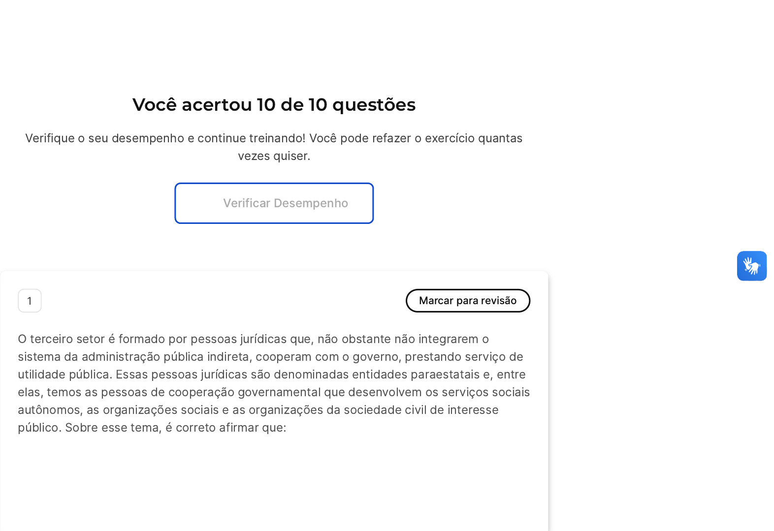 02/05/2024, 14:42 estacio.saladeavaliacoes.com.br/exercicio/6633cf06257ea9c0265394af/gabarito/ https://estacio.saladeavaliacoes.com.br/exercicio/6633cf06257ea9c0265394af/gabarito/ 1/16 Você acertou 10 de 10 questões Verifique o seu desempenho e continue treinando! Você pode refazer o exercício quantas vezes quiser. Verificar Desempenho 1 Marcar para revisão O terceiro setor é formado por pessoas jurídicas que, não obstante não integrarem o sistema da administração pública indireta, cooperam com o governo, prestando serviço de utilidade pública. Essas pessoas jurídicas são denominadas entidades paraestatais e, entre elas, temos as pessoas de cooperação governamental que desenvolvem os serviços sociais autônomos, as organizações sociais e as organizações da sociedade civil de interesse público. Sobre esse tema, é correto afirmar que: 02/05/2024, 14:42 estacio.saladeavaliacoes.com.br/exercicio/6633cf06257ea9c0265394af/gabarito/ https://estacio.saladeavaliacoes.com.br/exercicio/6633cf06257ea9c0265394af/gabarito/ 2/16 A B C D E As pessoas jurídicas que desenvolvem serviços sociais autônomos, por terem natureza jurídica de direito privado, não prestam contas ao Tribunal de Contas. As pessoas de cooperação governamental que desenvolvem os serviços sociais autônomos independem de lei autorizadora para sua criação. A qualificação jurídica como organização social de uma pessoa jurídica de direito privado que desenvolve atividades sem fins lucrativos, uma vez preenchidos os requisitos legais, é uma discricionariedade da Administração Pública e se dá por meio do contrato de gestão. As pessoas de cooperação governamental não gozam de imunidade tributária, na medida em que possuem natureza jurídica de direito privado, não obstante desenvolverem atividades sem fins econômicos e lucrativos. A organização da sociedade civil de interesse público é a qualificação jurídica dada a uma pessoa jurídica de direito privado ou público, sem fins lucrativos, que recebe delegação do Poder Público para desenvolver serviço público social, por meio do termo de parceria, que é um ato vinculado da Administração Pública. Resposta correta Parabéns, você selecionou a alternativa correta. Confira o gabarito comentado! Gabarito Comentado 02/05/2024, 14:42 estacio.saladeavaliacoes.com.br/exercicio/6633cf06257ea9c0265394af/gabarito/ https://estacio.saladeavaliacoes.com.br/exercicio/6633cf06257ea9c0265394af/gabarito/ 3/16 A B C A alternativa correta é a letra C. A qualificação jurídica como organização social de uma pessoa jurídica de direito privado que desenvolve atividades sem fins lucrativos é uma discricionariedade da Administração Pública. Isso significa que a Administração Pública tem a liberdade de escolha para qualificar uma entidade como organização social, desde que sejam preenchidos os requisitos legais. Essa qualificação se dá por meio do contrato de gestão, que é um instrumento utilizado para formalizar a parceria entre a Administração Pública e a entidade qualificada como organização social. 2 Marcar para revisão Assinale a alternativa correta a respeito da ética na função pública: A moral influencia e direciona os aspectos sociais mais do que é influenciada por eles. Virtude é a abertura de espírito que torna possível aprender com as próprias falhas. Princípios éticos são a consequência de um agir moral reiterado, que se torne hábito. 02/05/2024, 14:42 estacio.saladeavaliacoes.com.br/exercicio/6633cf06257ea9c0265394af/gabarito/ https://estacio.saladeavaliacoes.com.br/exercicio/6633cf06257ea9c0265394af/gabarito/ 4/16 D E No sentido de ser universal, a ética é pautada por um absolutismo, transcendendo espaços e tempo. A consciência moral diferencia-se do senso moral porque este diz respeito ao desejo individual de se estabelecer um julgamento sobre as próprias escolhas, enquanto aquela diz respeito à maneira como são avaliadas as próprias atitudes e as dos outros ao redor. Resposta correta Parabéns, você selecionou a alternativa correta. Confira o gabarito comentado! Gabarito Comentado A alternativa correta é a letra D, que afirma que a ética, em seu sentido universal, é pautada por um absolutismo, transcendendo espaços e tempo. Isso significa que os princípios éticos são universais e não são alterados por fatores como localização geográfica ou período histórico. Eles são absolutos e aplicáveis em todas as situações, independentemente das circunstâncias. Portanto, na função pública, a ética deve ser mantida como um padrão inalterável de conduta, independentemente do contexto. 3 Marcar para revisão 02/05/2024, 14:42 estacio.saladeavaliacoes.com.br/exercicio/6633cf06257ea9c0265394af/gabarito/ https://estacio.saladeavaliacoes.com.br/exercicio/6633cf06257ea9c0265394af/gabarito/ 5/16 A B C D E Tício é funcionário público municipal e recebeu para si, diretamente, em razão de sua função, vantagem indevida, consistente em dinheiro em espécie no valor de R$ 5.000,00 (cinco mil reais), para que concedesse, com rapidez, um alvará para um empreendimento irregular no município. Nesse caso, pode-se dizer que Tício praticou o crime: Enriquecimento ilícito. Corrupção. Condescendência criminosa. Peculato. Roubo. Resposta correta Parabéns, você selecionou a alternativa correta. Confira o gabarito comentado! Gabarito Comentado O crime praticado por Tício é de corrupção, pois ele recebeu uma vantagem indevida em razão de sua função pública. A corrupção ocorre quando um funcionário público aceita, solicita ou recebe, para si ou para outrem, direta ou indiretamente, ainda que 02/05/2024, 14:42 estacio.saladeavaliacoes.com.br/exercicio/6633cf06257ea9c0265394af/gabarito/ https://estacio.saladeavaliacoes.com.br/exercicio/6633cf06257ea9c0265394af/gabarito/ 6/16 A B C fora da função ou antes de assumi-la, mas em razão dela, vantagem indevida, ou aceita promess