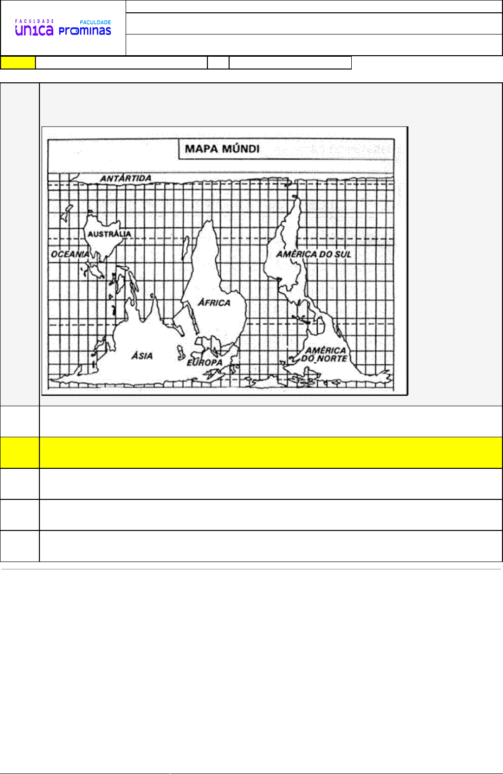 07/05/2024 16:02:57 1/4 REVISÃO DE SIMULADO Nome: ANTONIO FERNANDO DA SILVA SOUTO Disciplina: Cartografia Básica Respostas corretas são marcadas em amarelo X Respostas marcardas por você. Questão 001 Na ilustração abaixo, o Mapa Mundi é representado de cabeça para baixo, o que causa estranheza em um grande número de estudantes que nunca viram esse tipo de projeção na escola e em atlas geográficos. Sobre a projeção representada pode se afirmar que A) é uma projeção equivalente, pois preserva as formas dos continentes, apesar de estarem representados de cabeça para baixo. B) está correta, pois no espaço não existe em cima e em baixo e a referência norte e sul estão relacionadas ao campo magnético terrestre. C) continua sendo uma projeção eurocêntrica, uma vez que a Europa continua estando representada no centro do mapa. D) é uma projeção desenvolvida no século XVI pelo historiador e cartógrafo francês Arno Peters. X E) Seu principal defeito é estar invertida, pois o planeta não pode ser representado de cabeça para baixo. 07/05/2024 16:02:57 2/4 Questão 002 Observe a imagem a seguir: A representação cartográfica demonstra: A) uma anamorfose que é uma projeção do tipo cilíndrica, deformando grande parte das áreas mais centrais dos países. B) um mapa topográfico devido a priorização de elementos de isolinhas de altitude que configuram o mapa. C) uma anamorfose visto que o tamanho dos estados não equivale ao seu tamanho real e sim a algum indicador. D) uma anamorfose, onde a disposição dos estados no mapa é mantida e os tamanhos são alterados de acordo com uma escala cartográfica numérica. X E) uma projeção azimutal, visto que os estados que compõem a porção sul do Brasil apresentam-se mais deformados. 07/05/2024 16:02:57 3/4 Questão 003 Considerado um dos maiores do mundo, o mapa de Urbano Monte, elaborado no século XVI, apresenta como particularidade a A) ausência de deformações. B) exatidão das distâncias. C) conservação das formas continentais. D) precisão da região Antártida. X E) projeção polar. Questão 004 Um mapa é uma projeção de dados, normalmente da Terra real, de corpos celestes ou de um mundo imaginário, para uma representação plana sobre um pedaço de papel ou num display digital como uma tela de computador. Normalmente, os mapas são criados por meio de transformação de dados do mundo real para uma superfície esférica ou elipsoidal (o denominado globo gerador) e então para um plano. Miljenko Lapaine, Croácia and E. Lynn Usery, EUA. Projeções Cartográficas e Sistemas de Referência. FONTE: https://icaci.org/files/documents/wom/09_IMY_WoM_pt.pdf. Fonte: http://dan-scientia.blogspot.com.br/2013/04/o-sistema-de-coordenadas-utm.html. A representação do espaço geográfico é fonte de inúmeras pesquisas no campo da Cartografia e da Geodesia sendo, a superfície terrestre o maior desafio, visto que A) são tantas faces e formas que ainda não é possível realizar o processamento em computadores. B) os satélites, únicos imageadores possíveis para tais dimensões são escassos e muito imprecisos. http://dan-scientia.blogspot.com.br/2013/04/o-sistema-de-coordenadas-utm.html 07/05/2024 16:02:57 4/4 C) os assoalhos oceânicos ficariam sem representação já que é impossível realizar medições em profundidade. D) a sua representação sempre está passível de distorção. X E) a isostasia dificulta o trabalho dos topógrafos já que eles não conseguem prever quando uma unidade geológica vai soerguer ou rebaixar.