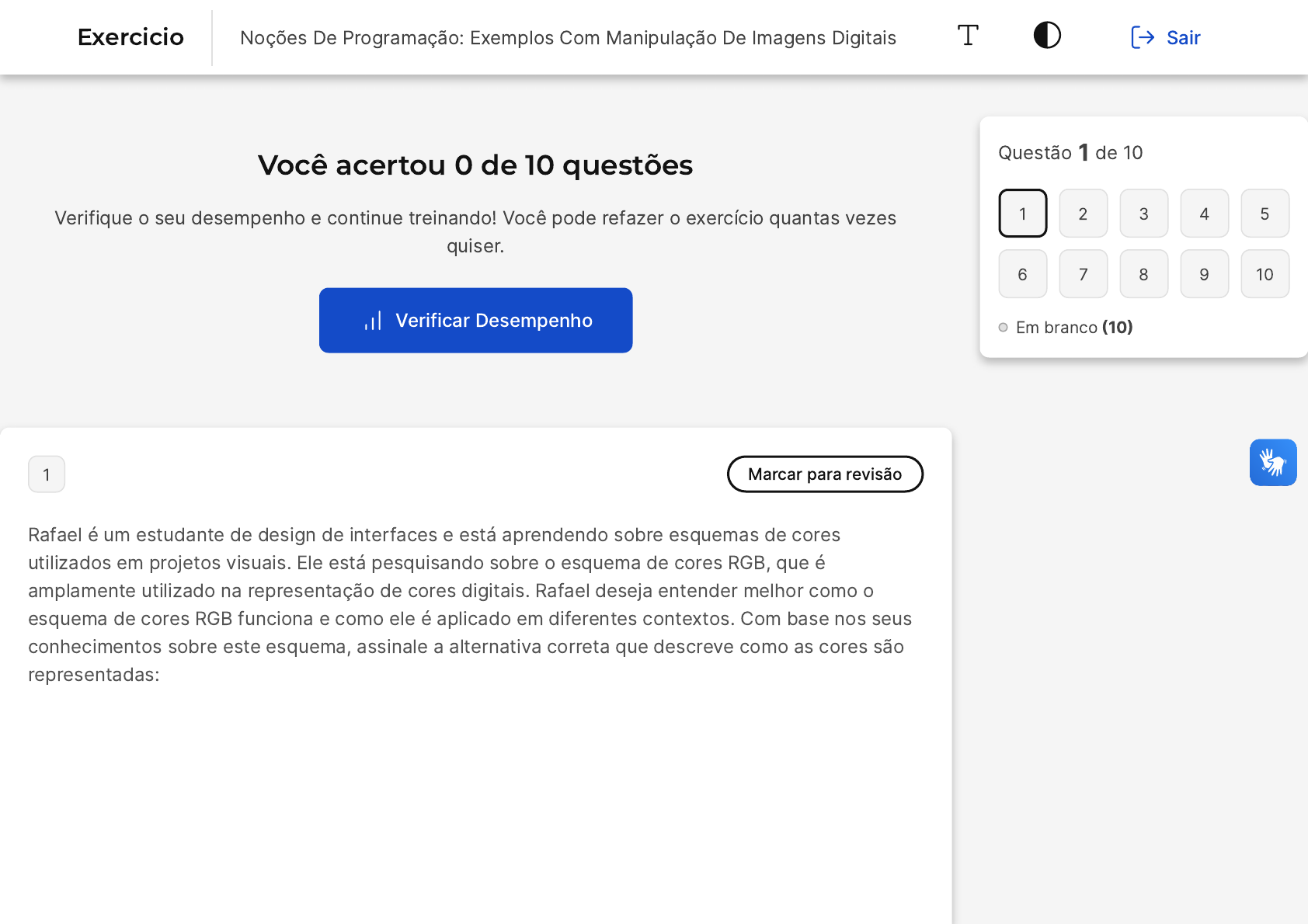 Você acertou 0 de 10 questões Verifique o seu desempenho e continue treinando! Você pode refazer o exercício quantas vezes quiser. Verificar Desempenho 1 Marcar para revisão Rafael é um estudante de design de interfaces e está aprendendo sobre esquemas de cores utilizados em projetos visuais. Ele está pesquisando sobre o esquema de cores RGB, que é amplamente utilizado na representação de cores digitais. Rafael deseja entender melhor como o esquema de cores RGB funciona e como ele é aplicado em diferentes contextos. Com base nos seus conhecimentos sobre este esquema, assinale a alternativa correta que descreve como as cores são representadas: Questão 1 de 10 Em branco �10� 1 2 3 4 5 6 7 8 9 10 Exercicio Noções De Programação: Exemplos Com Manipulação De Imagens Digitais Sair A B C D E As cores são representadas por meio de matrizes numéricas que combinam tons de vermelho, verde e azul, resultando em uma vasta gama de cores. As cores são representadas por meio de matrizes numéricas que combinam tons de amarelo, ciano e magenta, resultando em uma vasta gama de cores. As cores são representadas por meio de matrizes alfabéticas que combinam tons de vermelho, verde e azul, resultando em uma vasta gama de cores. As cores são representadas por meio de matrizes alfabéticas que combinam tons de amarelo, ciano e magenta, resultando em uma vasta gama de cores. As cores são representadas por meio de vetores gráficos que combinam tons de vermelho, verde, azul e violeta resultando em uma vasta gama de cores. Questão não respondida Opa! A alternativa correta é a letra A. Confira o gabarito comentado! Gabarito Comentado O esquema de cores RGB �Red, Green, Blue) é um modelo aditivo de representação de cores utilizado em dispositivos eletrônicos, como monitores, telas de televisão, câmeras digitais e sistemas de iluminação. Nesse esquema, as cores são formadas pela combinação de três componentes básicos: vermelho (Red), verde �Green) e azul �Blue). Cada componente de cor (vermelho, verde e azul) é representado por um valor numérico que varia de 0 a 255, indicando a intensidade da cor. Quando os três componentes são combinados em diferentes intensidades, é A B C D E possível criar uma ampla gama de cores. 2 Marcar para revisão Carolina é uma desenvolvedora web e está trabalhando em um projeto que envolve a exibição de imagens em um site. Ela recebeu uma solicitação do cliente para implementar uma funcionalidade que permita aumentar o zoom de uma imagem quando o usuário interagir com ela. Carolina está revisando o código fonte e percebeu que existem diferentes parâmetros e propriedades que podem ser manipulados para alcançar esse objetivo. No entanto, ela não tem certeza qual é o parâmetro correto a ser utilizado. Com base na necessidade de aumentar o zoom de uma imagem no código fonte, assinale a alternativa que indica o parâmetro mais apropriado a ser manipulado: setResolution. setEscale. setZoom. setOpacity. setSize. A B C Questão não respondida Opa! A alternativa correta é a letra C. Confira o gabarito comentado! Gabarito Comentado Ao mencionar a necessidade de aumentar o zoom da imagem, a resposta correta é o parâmetro "setZoom". Ao manipular esse parâmetro, é possível ajustar o nível de zoom da imagem para atender às necessidades do usuário. As demais alternativas não estão diretamente relacionadas à funcionalidade de zoom, tornando a opção "setZoom" a resposta correta para essa situação hipotética. 3 Marcar para revisão Entre as técnicas de programação para manipulação de imagens digitais, há uma que permite instruir que o computador repita uma sequência de instruções, como, por exemplo, para todos os pixels de uma imagem. Assinale a alternativa cuja instrução reflete essa ideia: if( pixel.getRed() � 130 � pixel=img.getPixel(10,10� for(pixel: img) D E A B pixel.setRed(0) pixel.setZoom(20) Questão não respondida Opa! A alternativa correta é a letra C. Confira o gabarito comentado! Gabarito Comentado A resposta correta é: for(pixel: img) O laço de repetição for pode ser usado para automatizar o processo desejado e, portanto facilitar a codificação. 4 Marcar para revisão No pensamento computacional, qual é o conceito fundamental que envolve a capacidade de simplificar um problema complexo por meio da identificação de características essenciais e ignorando detalhes irrelevantes? Decomposição. Algoritmo. C D E Iteração. Abstração. Padrões. Questão não respondida Opa! A alternativa correta é a letra D. Confira o gabarito comentado! Gabarito Comentado A questão aborda um dos principais conceitos do pensamento computacional, que é a abstração. A resposta correta, destaca a capacidade de simplificar problemas complexos, identificando características essenciais e ignorando detalhes irrelevantes. A abstração é essencial para lidar com problemas computacionais, permitindo uma compreensão mais clara e a busca por soluções eficientes. 5 Marcar para revisão Observe o código a seguir, que está manipulando uma imagem totalmente branca: A B C D E Se o computador executar as linhas de código da parte 1 e, segundos depois, as linhas de código da parte 2, qual será o efeito observado nas imagens apresentadas na tela? Um pixel preto se deslocando para a esquerda. Um pixel preto se deslocando para baixo. Um pixel preto se deslocando para a direita. Um pixel cinza se deslocando para a esquerda. Um pixel cinza se deslocando para baixo. Questão não respondida A B C Opa! A alternativa correta é a letra B. Confira o gabarito comentado! Gabarito Comentado A execução sequencial do código revelará um pixel preto, código RGB �0,0,0�, se deslocando para baixo. 6 Marcar para revisão Carolina é uma desenvolvedora web e está trabalhando em um projeto que envolve a exibição de imagens em um site. Ela recebeu uma solicitação do cliente para implementar uma funciona