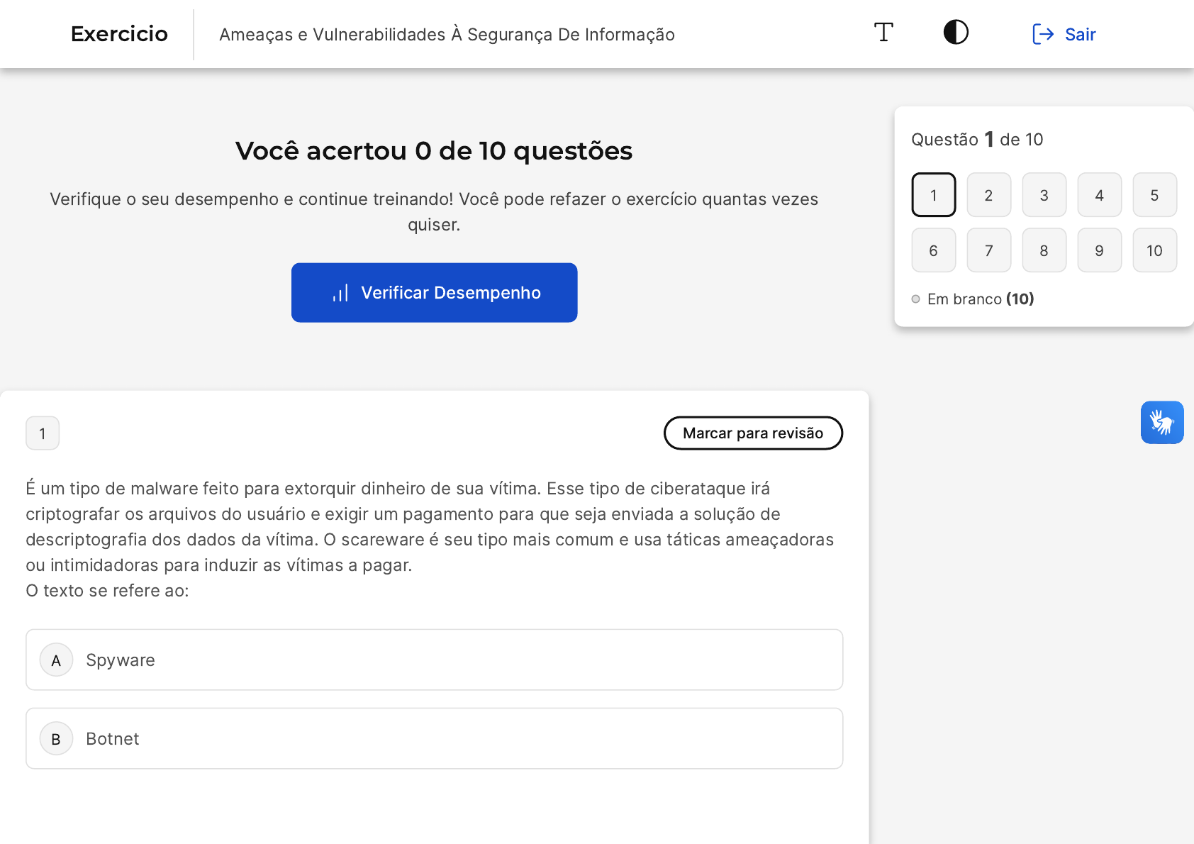 Você acertou 0 de 10 questões Verifique o seu desempenho e continue treinando! Você pode refazer o exercício quantas vezes quiser. Verificar Desempenho A B 1 Marcar para revisão É um tipo de malware feito para extorquir dinheiro de sua vítima. Esse tipo de ciberataque irá criptografar os arquivos do usuário e exigir um pagamento para que seja enviada a solução de descriptografia dos dados da vítima. O scareware é seu tipo mais comum e usa táticas ameaçadoras ou intimidadoras para induzir as vítimas a pagar. O texto se refere ao: Spyware Botnet Questão 1 de 10 Em branco �10� 1 2 3 4 5 6 7 8 9 10 Exercicio Ameaças e Vulnerabilidades À Segurança De Informação Sair C D E Spam DDoS Ransomware Questão não respondida Opa! A alternativa correta é a letra E. Confira o gabarito comentado! Gabarito Comentado O enunciado descreve um tipo de malware que criptografa os arquivos do usuário e exige um pagamento para descriptografá-los. Este é o comportamento característico do Ransomware. O Ransomware é um tipo de software malicioso que restringe o acesso ao sistema infectado e cobra um resgate para que o acesso possa ser restabelecido. Portanto, a alternativa correta é o Ransomware. 2 Marcar para revisão O link de acesso à internet de uma instituição encontra-se muito instável porque o seu provedor não cumpre o SLA. Do ponto de vista de segurança e análise de risco, isso deve ser considerado como evidência de: A B C D E BYOD. Ameaça. Resiliência. Negação de serviço. Vulnerabilidade. Questão não respondida Opa! A alternativa correta é a letra E. Confira o gabarito comentado! Gabarito Comentado Na situação descrita no enunciado, a instabilidade do link de acesso à internet, devido ao não cumprimento do SLA pelo provedor, é uma evidência de vulnerabilidade. Vulnerabilidade, no contexto de segurança da informação, refere-se a uma fraqueza que pode ser explorada por ameaças para causar danos a um ativo. Neste caso, a vulnerabilidade é a instabilidade do link de acesso à internet, que pode ser explorada para interromper ou degradar o serviço, afetando a disponibilidade da informação. A B C D E 3 Marcar para revisão �FCC/2010� Sobre segurança da informação, considere: I. Ameaça: algo que possa provocar danos à segurança da informação, prejudicar as ações da empresa e sua sustentação no negócio, mediante a exploração de uma determinada vulnerabilidade. II. Vulnerabilidade: é medida pela probabilidade de uma ameaça acontecer e o dano potencial à empresa. III. Risco: ponto pelo qual alguém pode ser atacado, molestado ou ter suas informações corrompidas. Está correto o que consta APENAS em II e III I e II I e III I III Questão não respondida Opa! A alternativa correta é a letra D. Confira o gabarito comentado! Gabarito Comentado A B C Os itens II e III apresentam os conceitos invertidos, sendo correto afirmar: Vulnerabilidade: ponto pelo qual alguém pode ser atacado, molestado ou ter suas informações corrompidas; Risco: é medido pela probabilidade de uma ameaça acontecer e o dano potencial à empresa. 4 Marcar para revisão Sobre os conceitos de segurança da informação, analise as afirmativas a seguir: I. Uma ameaça tem o poder de comprometer ativos vulneráveis. II. Risco é a combinação das consequências de um incidente de segurança com a sua probabilidade de ocorrência. III. Vulnerabilidades técnicas são mais críticas do que vulnerabilidades criadas por comportamento humano. Está correto somente o que se afirma em: I II III D E I e II I e III Questão não respondida Opa! A alternativa correta é a letra D. Confira o gabarito comentado! Gabarito Comentado As afirmativas I e II estão corretas. A primeira afirmação é verdadeira porque uma ameaça, de fato, tem o poder de comprometer ativos que são vulneráveis. A segunda afirmação também é verdadeira, pois o risco é a combinação das consequências de um incidente de segurança com a sua probabilidade de ocorrência. No entanto, a terceira afirmação é falsa, pois não se pode afirmar categoricamente que vulnerabilidades técnicas são mais críticas do que as vulnerabilidades criadas por comportamento humano. Ambas podem ter impactos significativos na segurança da informação e dependem do contexto específico. 5 Marcar para revisão �FCC/2012 � Adaptada) Códigos maliciosos (malwares) são programas que objetivam executar ações danosas e atividades maliciosas em um computador. Neste contexto encontram-se bots e botnets, sobre os quais é correto afirmar: A B C D E Botnet é um software malicioso de monitoramento de rede que tem a função de furtar dados que transitam pela rede e, normalmente, tornar a rede indisponível disparando uma grande carga de dados direcionados ao servidor da rede. Bot é um programa que dispõe de mecanismos de comunicação com o invasor e possui um processo de infecção e propagação igual ao do vírus, ou seja, não é capaz de se propagar automaticamente. Um computador infectado por um bot costuma ser chamado de attack base, pois serve de base para o atacante estabelecer suas ações maliciosas. Também pode ser chamado de spam host, pois o bot instalado tem o objetivo de enviar infinitamente spams para a caixa de e-mail de quem é vítima do ataque. A comunicação entre o invasor e o computador infectado pelo bot pode ocorrer exclusivamente via redes do tipo P2P. Ao se comunicar, o invasor pode enviar instruções para que ações maliciosas sejam executadas, como desferir ataques, furtar dados do computador infectado e enviar spam. Algumas das ações maliciosas que costumam ser executadas por intermédio de botnets são: ataques de negação de serviço, propagação de códigos maliciosos, coleta de informações de um grande número de computadores, envio de spam e camuflagem da identidade do atacante. Questão não respondida Opa! A alternativa correta é a letra E. Confira o gabarito com