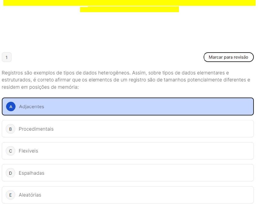 SIMULADO ALGORITMOS E COMPLEXIDADE – ESTÁCIO 2024 [Todas as respostas estão corretas. Coloquei o início da questão digitado no word para facilitar a pesquisa através de buscadores 😊 Gabarito ao final. Se te ajudou, deixa um like!] Registros são exemplos de tipos de dados heterogêneos. Assim, sobre tipos de dados elementares e estruturados, é correto afirmar que os elementos de um registro são de tamanhos potencialmente diferentes e residem em posições de memória: Considere os algoritmos a seguir e as suas correspondentes complexidades indicadas: O código abaixo é uma implementação: Um algoritmo recursivo de busca em árvore binária verifica se um elemento está presente na árvore. O algoritmo de ordenação Shell Sort, ou simplesmente Shell Sort, é uma generalização do algoritmo de inserção que permite a troca de itens distantes. Uma aplicação de gerenciamento de inventário precisa ordenar itens com base em seus códigos alfanuméricos. O algoritmo escolhido deve ser eficiente em lidar com uma variedade de padrões de dados. Qual algoritmo de ordenação atende melhor a esta necessidade? Em um sistema de gerenciamento de dados, uma árvore AVL foi implementada para otimizar as buscas. Devido ao grande volume de dados, a eficiência na inserção e remoção é crucial. Na otimização de rotas de entrega, é vital determinar o caminho mais eficiente entre múltiplos pontos. Ao desenvolver um jogo de computador, um programador utiliza ponteiros para otimizar o gerenciamento de memória, especialmente para objetos que são frequentemente criados e destruídos durante o jogo. Ano: 2014 Banca: FUNCAB Órgão: MDA Prova: FUNCAB - 2014 - MDA - Analista de Negócios Observe o algoritmo a seguir, que utiliza o conceito de função recursiva. image7.png image8.png image9.png image10.png image11.png image12.png image1.png image2.png image3.png image4.png image5.png image6.png