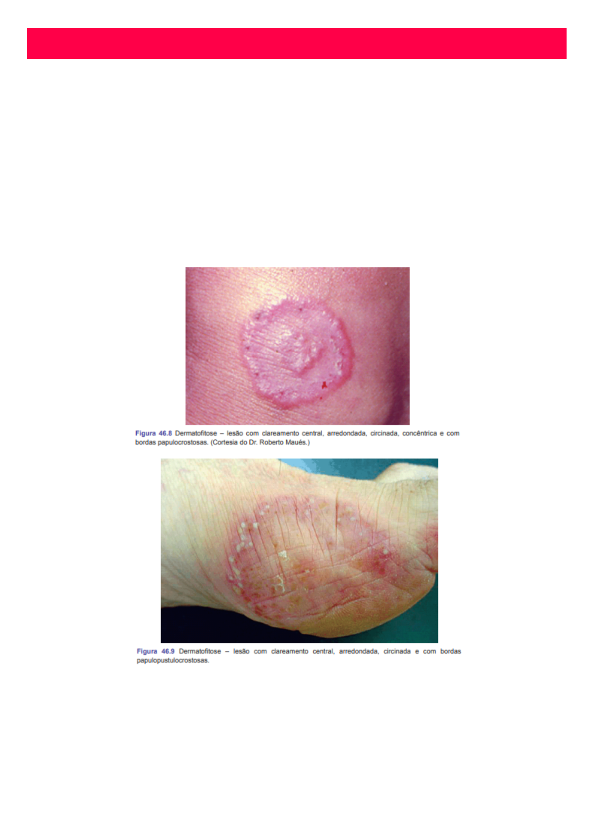 Der����fito��� ● tinhas/tineas ● prurido muito intenso = suspeitar tineas ● infecções fúngicas da pele, cabelo ou unhas causadas por fungos dermatófitos ● fungos que vivem à custa da queratina da pele, dos pelos e das unhas ● atualmente descritas 40 espécies de dermatófitos - destas, 30 patogênicas ● mais comuns Trichophyton rubrum, Microsporum canis e Epidermophyton flocosum DERMATOFITOSE DO CORPO/TINEA CORPORIS ● lesões eritematoescamosas, anelares, isoladas ou confluentes ● uma ou várias - crescimento centrífugo ● prurido sempre presente ● pode haver vesícula ou pústula - lesão em placa eritematoescamosa de evolução lenta ● crescimento centrífugo e bordas elevadas circinadas DERMATOFITOSE MARGINADA/TINEA CRURIS ● lesão eritematoescamosa a partir da prega inguinal ● avançando sobre a coxa com borda nítida ● lesão pode invadir períneo e se propagar para nádegas, região pubiana e baixo-ventre ● muito pruriginosa - liquenificação frequente ● candida placa vermelha brilhosa = tinea circinado cor menos eritematosa DERMATOFITOSE DOS PÉS/TINEA PEDIS ● T. mentagrophytes ● aguda eczematoide: vesículas plantar e digitais bastante pruriginosa ● intertriginosa: localizada predominantemente em pregas interpododáctilas - fissuras e maceração ● forma crônica: lesões descamativas pouco pruriginosas princip em região plantar DERMATOFITOSE IMBRICADA/TINEA IMBRICATA ● lesões escamosas em círculos concêntricos ou que formam arabescos ● atingem grandes áreas do corpo ● muito pruriginosas ● T. concentrium DERMATOFITOSE UNGUEAL/TINEA UNGUIUM OU ONICOMICOSE ● lesões destrutivas e esfarinhentas das unhas ● borda livre ● cor branco-amarelada ● ceratose do leito ungueal ● compromete uma ou várias unhas dos pés - princip hálux ● pode acometer unhas das mãos DERMATOFITOSE DA FACE ● aspecto peculiar e de difícil diagnóstico ● lesões eritematoescamosas de crescimento centrífugo ● às vezes com disposição em asa de borboleta DERMATOFITOSE DO COURO CABELUDO/TINEA CAPITIS ● mais comum em crianças ● comprometimento dos cabelos - invadidos ou lesados + lesões eritematoescamosas de couro cabeludo ● cabelos fraturas próximo a pele - áreas de tonsura - pequenos cotos de cabelo ainda implantados ● tinea tricofítica - áreas pequenas — microspóricas - área única e grande — cabelos voltam com tratamento ou involução espontânea na puberdade ● pode ser classificada pelo local de comprometimento do pelo ○ ectothrix - superfície externa da bainha do pelo ■ grandes - Trichophyton ■ pequenos - Microsporum sp. ○ endothrix - interior da bainha do pelo ● pelos afetados frágeis e quebradiços - sofrem fraturas ● black-dots - pontos enegrecidos que surgem no local de fratura dos pelos - sinal do ponto de exclamação DERMATOFITOSE INFLAMATÓRIA ● kerion - couro cabeludo ou barba ○ placa de foliculite aguda/subaguda hiperérgica com intensa supuração e cura espontânea ○ às vezes com alopecia cicatricial ● sicose tricofítica/tinea barbae/tinha da barba - pústulas centralizadas por pelos em região de barba e bigode ○ isoladas ou conglomerados ● folliculitis capitis abscedens et suffodiens - lesões de foliculite com túneis intercomunicado abscessos no couro cabeludo DERMATOFITOSE GRANULOMATOSA ● manifestações variadas - características comuns — dermatófito na derme com reação granulomatosa com/sem hipersensibilidade à tricofitina ● localizadas ○ tipo Majocchi - correm naturalmente em oclusão ou por uso indiscriminado de corticosteroide - quebra barreira cutânea ■ nódulos com tendência à fistulização ■ queixo ou punhos ○ tipo Wilson-Cremer - nódulos eritematosos com tendência à ulceração MMII - princip mulheres em decorrência da raspagem de pelos ● generalizadas ○ tipo Azulay - erupção generalizada eritematoescamosa com pápulas, tubérculos e comprometimento ungueal ○ tipo Artom - quadro eritrodérmico com lesões tumorais e adenopatia generalizada ○ tipo Pelevine-Tchermogouboff - erupção generalizada com lesões eritematoescamosas, placas de infiltrações, nódulos (com/sem ulceração), adenopatia e comprometimento ósseo