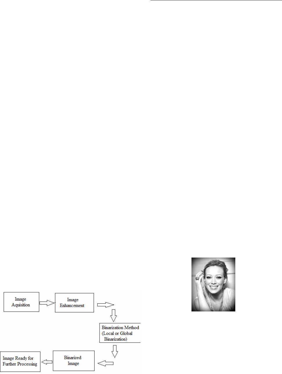 International Journal of Computer Applications (0975 – 8887) Volume 71– No.1, June 2013 8 Binarization Techniques used for Grey Scale Images Puneet GRDIET,BATHINDA Department of Computer Science & Engineering Naresh Kumar Garg GZSPTU Campus,BATHINDA Department of Computer Science & Engineering ABSTARCT Image binarization is important step in the OCR (Optical Character Recognition). There are several methods used for image binarization recently, but there is no way to select single or best method which is used for all images. The main objective of this paper is to present the study on various existing binarization algorithms and compared their measurements. This paper will act as guide for fresher’s to start their work on binarization. Keywords: Binarization, Threshold value, SNR, OCR 1. INTRODUCTION The Binarization Method converts the grey scale image (0 up to 256 gray levels) in to black and white image (0 or 1). The result of OCR highly depends upon the binarization. The high quality binarized image can give more accuracy in character recognition as compared original image because noise is present in the original image [1]. In fact problem is that which binarization algorithm is appropriate for all images. The selection of most optimal binarization algorithm is difficult, because different binarization algorithm gives different performance on different data sets. This is especially true in the case of historical documents images with variation in contrast and illumination. The algorithms divide into two categories a) Global Binarization b) Local Binarization. The global binarization methods used single threshold value for whole image and the local binarization method where the threshold value calculated locally pixel by pixel or region by region. The figure (a) show the basic block diagram of binarization Fig.(a) Block Diagram of Binarization This paper is organized in following sections: Section 2 describes the different binarization methods. Section 3 describes the work done by different researcher. Section 4 presents the conclusion. 2. BINARIZATION METHODS This section classifies the some important local and global binarization methods that are currently used for binarization. For global binarization we choose: 1) Fixed Thresholding Method 2) Otsu Method 3) Kittler Method For local binarization we choose: 1) Niblack Method 2) Adaptive Method 3) Sauvola Method 4) Bernsen Method 2.1 Global Methods 2.1.1 Fixed Thresholding Method In Fixed Thresholding binarization method [2][3][4] fixed threshold value is used to assign 0’s and 1’s for all pixel positions in a given image. The basic idea for fixed binarization method is described as under. 𝑔 𝑥, 𝑦 = 1 𝑖𝑓 𝑓 𝑥, 𝑦 >= 𝑇 0 𝑜𝑡𝑒𝑟𝑤𝑖𝑠𝑒 T shows global threshold value. For various threshold values in fixed binarization methods the results are illustrated below. Original image International Journal of Computer Applications (0975 – 8887) Volume 71– No.1, June 2013 9 THRESHOLD VALUE OUTPUT T=108 T=128 T=148 T=160 TABLE-2.1 As shown in table 2.1, outputs vary as given an input threshold value. From the above table it can be noticed that output at threshold T=160 is better for this image. But T=160 is not optimal threshold value for all the images. So it is very difficult to decide an optimal threshold value for a current input image. To overcome this difficulty we will discuss further more binarization techniques in which optimal threshold value is computed according to input image. 2.1.2 Otsu Binarization Method In image processing, Otsu’s thresholding method is used for automatic binarization level decision, based on the shape of the histogram [5]. Otsu's thresholding method involves iterating through all the possible threshold values and calculating a measure of spread for the pixel levels each side of the threshold, i.e. the pixels that either falls in foreground or background. The aim is to find the threshold value where the sum of foreground and background spreads is at its minimum. STEPS for Otsu Method 1. Separate the pixels into two clusters according to the threshold. 𝑞1 𝑡 = 𝑝(𝑖)𝑡 𝑖=1 𝑎𝑛𝑑 𝑞2 𝑡 = 𝑝(𝑖)𝐼 𝑖=𝑡+1 P represents the image histogram. 2. Find the mean of each cluster. µ1 𝑡 = 𝑖𝑝 𝑖 𝑞1 𝑡 𝑎𝑛𝑑 𝑡 𝑗=1 µ2 𝑡 = 𝑖𝑝(𝑖) 𝑞2(𝑡) 𝐼 𝑗=𝑡+1 3. Calculate the individual class variance. 𝜎1 2 𝑡 = [𝑖 − µ1 𝑡 ]2𝑡 𝑖=1 𝑝(𝑖) 𝑞1(𝑡) and 𝜎2 2 𝑡 = [𝑖 − µ2 𝑡 ]2𝐼 𝑖=𝑡+1 𝑝(𝑖) 𝑞2(𝑡) 4. Square the difference between the means. 𝜎𝑏 2 𝑡 = 𝜎2 − 𝜎𝑤 2 𝑡 = 𝑞1 𝑡 1 − 𝑞1 𝑡 [µ1 𝑡 − µ2(𝑡)]2 5. Finally, this expression can safely be maximized and the solution is t that is maximizing 𝜎𝑏 2(𝑡) 2.1.3 Kilter and Illingworth Method The kilter method [6] is used mixture of Gaussian distribution to find threshold value. In kilter Method the t is threshold that is used to segment the image into two parts background and foreground, both of the parts modelled by Gaussian distribution, 𝑝𝐵 𝑡 and 𝑝𝐹(𝑡) , the 𝑝𝑚𝑖𝑥 𝑡 mixture of these two Gaussian distribution. 𝑝𝑚𝑖𝑥 𝑡 = 𝛼𝑝𝐵 𝑡 + 1 − 𝛼 𝑝𝐹(𝑡) Where 𝛼 is determined by the portions of background and foreground in the image. 2.2 Local Methods 2.2.1 Adaptive Binarization Method Adaptive binarization method [7] is used for local binarization. In this a window of NxN blocks slide over the entire image and threshold value is computed for each local area under the window for binarization. The adaptive method give more accurate result as compared to global binarization in such conditions where the International Journal of Computer Applications (0975 – 8887) Volume 71– No.1, June 2013 10 image effected from bad shading , blurring, low resolution and non uniform illumination. In adaptive bin