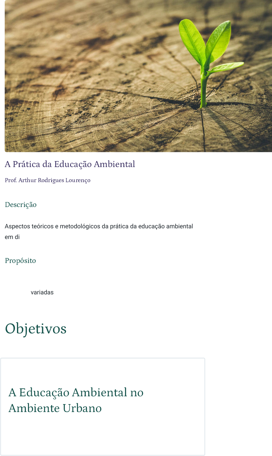 A Prática da Educação Ambiental Prof. Arthur Rodrigues Lourenço Descrição Aspectos teóricos e metodológicos da prática da educação ambiental em diferentes ambientes. Propósito Proporcionar um entendimento da dimensão da educação ambiental nas mais variadas esferas da vida humana. Objetivos Módulo 1 A Educação Ambiental no Ambiente Urbano Analisar a educação ambiental no ambiente urbano. Módulo 2 A Educação Ambiental no Ambiente Rural e em Populações Tradicionais Analisar a educação ambiental no ambiente rural e em populações tradicionais. Módulo 3 A Educação Ambiental em Unidades de Conservação Analisar a educação ambiental em Unidades de Conservação. Módulo 4 Projetos de Educação Ambiental Descrever a construção de projetos de educação ambiental. 1 - A Educação ambiental no Ambiente Urbano Ao �nal deste módulo, você será capaz de analisar a educação ambiental no ambiente urbano. Características e componentes do ambiente A prática da educação ambiental (EA) é um processo contínuo e permanente que deverá ser realizado em conjunto com diferentes instituições parceiras, sempre buscando a construção colaborativa e a minimização de impactos ambientais. Este conteúdo irá elucidar particularidades da prática da educação ambiental em diferentes contextos, como no ambiente urbano e em Unidades de Conservação, por exemplo. Ao final, serão pontuadas questões importantes para a elaboração e a execução de um projeto de educação ambiental. Introdução urbano As cidades são fruto do desenvolvimento do homem em determinado território, o que muitas vezes está relacionado às oportunidades que o território oferece. Temos como exemplo das diferentes oportunidades de cada localidade os seres humanos que migram de áreas rurais para áreas urbanas em busca de melhores condições de trabalho. Um ambiente com qualidade de vida só é possível se todas as pessoas que vivem e contribuem para o seu desenvolvimento estiverem satisfeitas nas várias dimensões da vida humana. A paisagem urbana também pode refletir os vários tipos de uso do território, se considerado o contexto histórico, cultural, social, econômico e ambiental em que o meio urbano está inserido. O que você imagina quando pensa em urbano? Quando nos deparamos com a palavra urbano, seja qual for o contexto, logo imaginamos um local com muitas pessoas, intensa movimentação de veículos, cores acinzentadas ou enegrecidas, muitas lojas, luzes e cartazes de propagandas. A cidade de Mumbai, uma das mais populosas da Índia. O fato é que a definição do que é urbano ou não vai levar em consideração principalmente a quantidade de pessoas que existem em determinado local, sendo assim, os ambientes considerados urbanos são densamente populosos. Entre os componentes do ambiente urbano, destacam-se: Grandes e contínuas edi�cações Prédios, avenidas, praças. Muitas habitações Casas, condomínios, ocupações irregulares e favelizações. Urbanização e infraestrutura Iluminação pública, calçadas, serviços de saúde, educação, cultura e lazer. Uma vez que o meio urbano é constituído pelas modificações que os seres humanos realizam no ambiente natural, torna-se evidente que tais modificações acarretarão algum tipo de impacto ambiental. Os impactos ambientais, em geral negativos, são diversificados e podem passar despercebidos devido à sua constância no cotidiano dos habitantes. É possível ainda que esses impactos sejam agravados por desinformação, preconceitos e ideologias. Historicamente, a forma como as áreas urbanas foram construídas e organizadas, na maioria dos casos, não consideraram a degradação ambiental ocasionada para o seu surgimento e consequente crescimento. Dessa maneira, um futuro modo de vida saudável e em harmonia entre os seres humanos e o meio ambiente, urbano ou não, é diretamente afetado. Impactos ambientais nos ambientes urbanos Os impactos e problemas ambientais encontrados no ambiente urbano são inúmeros e diversos, podendo variar de acordo com a geografia local, com a infraestrutura para sobrevivência proporcionada pelo governo, com os níveis de escolaridade e poder aquisitivo dos habitantes, entre muitas outras variáveis. Por isso, para se trabalhar a educação ambiental no ambiente urbano, é preciso estar muito atento às questões sociais que permeiam a problemática ambiental. Deve-se destinar atenção não só para a mitigação dos impactos ambientais, mas também para as causas dos problemas sociais, o que pode tornar as ações com intuito de promover a conscientização ambiental mais complexas. Resíduos e poluição Um dos grandes problemas ambientais relacionados às questões sociais é a geração e o descarte inadequado de resíduos, que podem ser classificados como: Resíduos líquidos Popularmente chamados esgoto ou chorume, oriundos do estilo de vida urbano, são também chamados de efluentes. Podem ser de origem doméstica, provenientes das casas, prédios e moradias em geral, ou industriais, oriundos de fábricas, refinarias e outros. Despejo de esgoto. Esse tipo de resíduo, na maioria das regiões urbanizadas do Brasil, é lançado sem tratamento em rios, lagoas e outros mananciais, ocasionando odor fétido (poluição do ar), visual desagradável (poluição visual) e até a disseminação de doenças. Em grandes metrópoles brasileiras, é comum encontrarmos algum rio que se tornou tão poluído ao ponto de atualmente só ter a função de receber e transportar os efluentes para outros locais. Existem também os resíduos líquidos provenientes de lixões e aterros sanitários, que podem contaminar o lençol freático e causar sérios problemas ambientais. Resíduos sólidos Popularmente chamado de lixo — também são um dos problemas ambientais mais comuns no meio urbano. São gerados por praticamente qualquer atividade humana e, se não forem destinados corretamen
