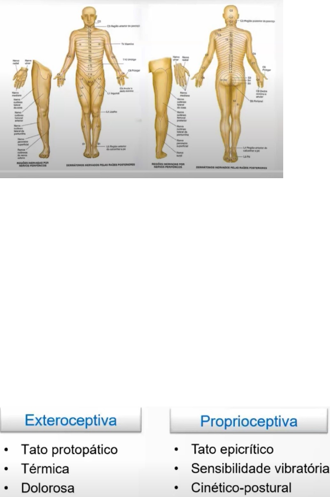 Exame neurológico – Sensibilidade O estudo da sensibilidade é importante, pois assim como a marcha e a força motora vai topografar a lesão... Aqui também. O raciocínio neurológico depende da sensibilidade para avaliarmos e fazermos uma hipótese diagnóstica correta. A imagem ao lado mostra os principais dermátomos de todo o corpo. Obviamente, não precisamos memorizar os detalhes de todos os dermátomos. Mesmo os especialistas não se lembra de todos os dermátomos. É preciso ficar ligado nos principais C4 fúrcula esternal. T4 região mamilar. T10 região do umbigo. Os dermátomos de membros inferiores podemos até na aula prática, ensaiar de forma didática... tem uma musiquinha. Com a mão na cintura temos L1. Na parte lateral. L1 Jogando a mão na parte lateral da cintura para região medial da coxa l2. Da região medial da coxa para região lateral a nível do joelho L3. Da região lateral a nível de joelho para região medial da panturrilha L4. Da região medial da panturrilha para região lateral da perna L5. Região plantar S1 Região do glúteo S5 Quando falamos de sensibilidade, o exame sensitivo não é tão simples. É preciso entender que temos 2 modalidades sensitivas. .EXTEROCEPTIVA E PROPRIOCEPTIVA. ambas passiveis de exame. EXTEROCEPTIVA diz respeito a sensibilidade mais superficial, com ligação com associação aos receptores sensitivos periféricos. Dentro dessa sensibilidade temos O TATO PROTOPÁTICO (grosseiro e sem riqueza de detalhes algum objeto tocou). Sensibilidade térmica e Sensibilidade dolorosa. Podemos encaixar esses 3 subtipos dentro da SENSIBILIDADE EXTEROCEPTIVA TATO PROPÁTICO (Grosseiro), SENSIBILIDADE TÉRMICA e SENSIBILIDADE DOLOROSA. PROPRIOCEPTIVA diz respeito a sensibilidade mais profunda, sensibilidade vibratória, sensibilidade sinética postural... são as VIAS QUE CORREM NO FÁSCICULO POSTERIOR (GRÁCIL E CUNEIFORME) e TATO EPICRITICO (tato mais fino que conseguimos entender qual objeto estamos tocando, segurando etc.). Tato epicrítico também sobe pela coluna posterior da medula. A figura acima é importante, pois vai ajudar a lembrar de uma variação anatômica, particularidade anatômica das vias que foram mencionadas. Na esquerda temos um primeiro neurônio sensitivo que sobe ipsilateralmente pela coluna dorsal. Faz conexão com o segundo neurônio sensitivo e lá em cima, a nível de BULBO, TRONCO CEREBRAL, NO LEMENISCO MEDIAL, ELE CRUZA PARA O LADO OPOSTO, sobe fazendo conexão com o tálamo e, a partir daí faz conexão com terceiro neurônio sensitivo e indo para o cortex, traduzindo a informação do 1 neuronio sensitivo. É por esse CAMINHO QUE A SENSIBILIDADE VIBRATÓRIA, PROFUNDA CHEGA AO CÓRTEX. SOBE IPISILATERALMENTE POR UM BOM TRAJETO E SOMENTE NO BULBO, ELE TROCA DE LADO. Quando pensarmos em síndromes medulares isso faz diferença no raciocínio. Na figura da direita temos o primeiro neurônio, que faz conexões com o segundo neurônio, E... a partir daí já tem uma mudança de lado. Ele cruza para o lado oposto logo que chega na medula e faz o trajeto ipsilateral (mas dps de cruzar) até o cortex. Esse é o caminho da sensibilidade dolorosa, vibratória e trato protopático (tato grosseiro). Essas informações farão diferença quando pensarmos nas lesões medulares. A figura ao lado mostra o conceito da sensibilidade profunda de membros inferiores e superiores. Os membros inferiores, a sensibilidade profunda (vibratória e cinética postural) corre por meio do fascículo GRÁCIL. Os membros superiores tem a informação correndo pelo FÁSCICULO CUNEIFORME. VIAS SOMESTÉSICAS A imagem ao lado mostra de forma mais didática. Na figura da esquerda mostra o caminho da informação da sensibilidade profunda. A informação sobe ipsilateralmente no local onde houve estímulo e SOMENTE NO NÍVEL DE BULBO, NO LEMINISCO MEDIAL AS INFORMAÇÕES CRUZAM PARA O LADO OPOSTO ALCANÇANDO O TALAMO E DEPOIS O CORTEX. No lado direito a sensibilidade superficial (trato protopatico, dor e temperatura) ela entra na medula e tem cruzamento ao lado oposto logo que o estímulo é recebido. Recebe o estímulo, em seguida muda de lado e segue ipisilateralmente para o tálamo e para o cortex. O caminho é diferente da sensibilidade profunda e da sensibilidade superficial. COMO TESTAMOS A SENSIBILIDADE? Primeiro dividimos a sensibilidade em EXTEROCEPTIVA e PROPRIOCEPTIVA. EXTEROCEPTIVA DOR, TATO PROTOPÁTICO E SENSIBILIDADE TERMICA. PROPIROCEPTIVA TATO EPICRÍTICO, SENSIBILIDADE VIBRATÓRIA E CINÉTICO-POSTURAL. Sempre o exame sensitivo deve ser feito num ambiente tranquilo e silencioso. É um exame que requer um pouco mais de atenção. SENSIBILIDADE EXTEROCEPTIVA – TATO PROTOPÁTICO, SENSIBILIDADE DOLOROSA E TÉRMICA SEMPRE FEITA DE OLHOS FECHADOS OS TESTES DO TATO PROTOPÁTICO, SENSIBILIDDE DOLOROSA E TÉRMICA. COMO TESTAMOS TATO PROTOPÁTICO? Geralmente nós testamos da região mais distal em direção a região mais proximal. O tato protopático (tato leve), devemos pegar um algodão ou um pedaço de gaze e começamos a passar na região distal dos dedos, primeiro lado direito e esquerdo.... comparando sempre os lados opostos. E COMPARANDO O MEMBRO EM SI. As vezes a alteração de sensibilidade é num membro só e devemos verificar se ela é mais proximal, mais distal.... Começaremos o exame de sensibilidade das regiões mais distais para as mais proximais, tanto em membros superiores como em membros inferiores e também pensando no tórax e abdomem. Além disso, é necessário comparar as regiões ipsilateralmente. Verificar terço superior do braço com o terço inferior do braço??? Verificar tudo isso. No tato protopático (grosseira) USAMOS O TATO, OU UMA GAZE E TESTAMOS A SENSIBILIDADE. E, O PROPRIO PACIENTE VAI DIZER SE ESTÁ SENTINDO OU NÃO. COMO TESTAMOS A SENSIBILIDADE TÉRMICA? Podemos usar um diapasão que é um metal frio que vai ajudar. Se tivermos condições.... (consultório, ambulatório tranquilo) pegamos