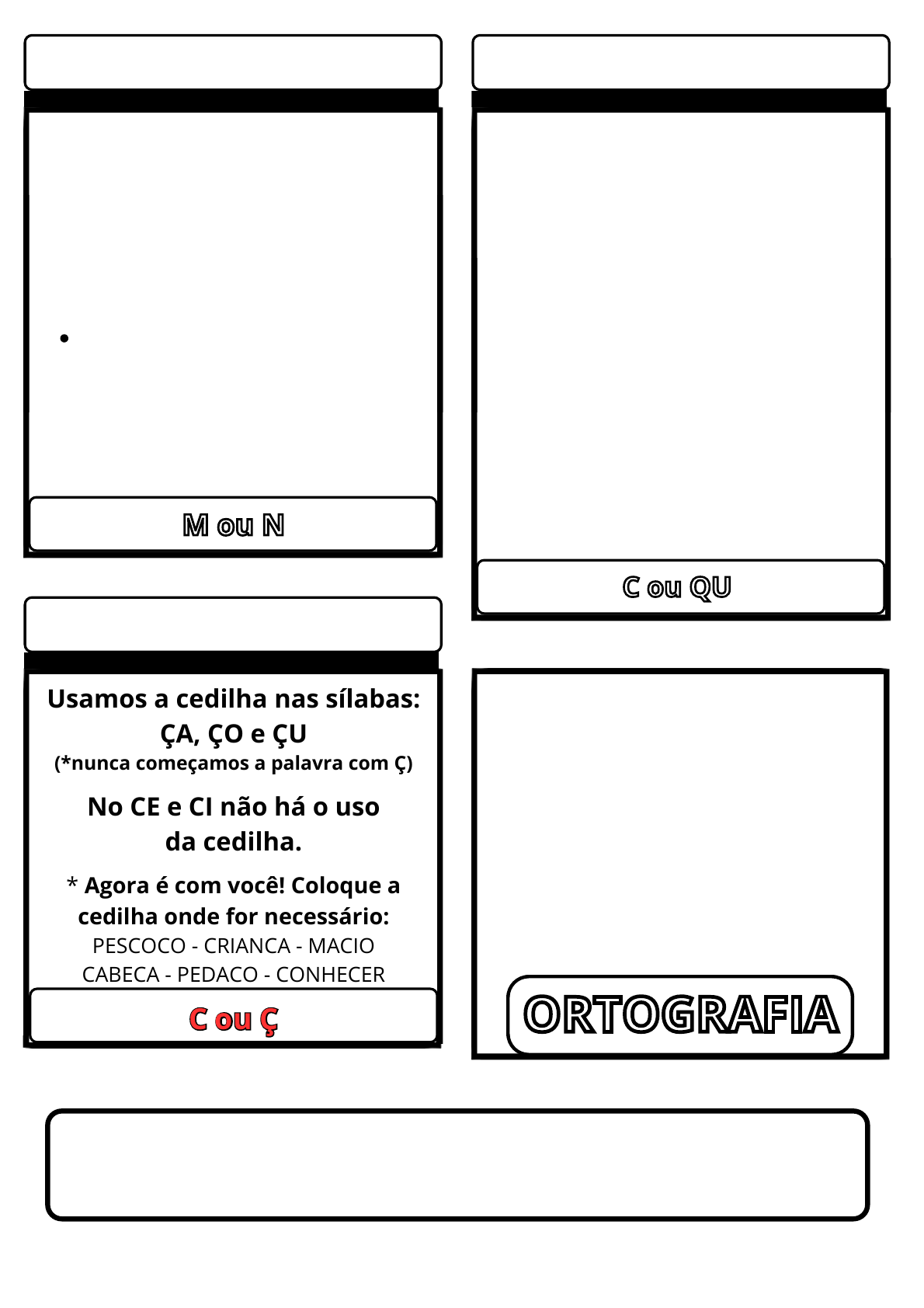 Usamos a cedilha nas sílabas: ÇA, ÇO e ÇU (*nunca começamos a palavra com Ç) No CE e CI não há o uso da cedilha. * Agora é com você! Coloque a cedilha onde for necessário: PESCOCO - CRIANCA - MACIO CABECA - PEDACO - CONHECER C ou ÇC ou Ç ORTOGRAFIAORTOGRAFIA COLAR M ou NM ou N Agora é sua vez! Complete: Antes de P e B usamos a letra M. Também usamos M no final da palavra. Exemplo: COMPRA - TAMBÉM AME___DOI___ CA___PEÃO BO___BO___ BO___BEIRO O___TE___ TE___PO COLAR C ou QUC ou QU COLAR Organizar e colar de baixo para cima na seguinte ordem: C ou QU, M ou N, C ou Ç e por cima ORTOGRAFIA. Usamos a letra C nas sílabas: CA, CO e CU Exemplo: CASA - CORUJA - CURRAL Usamos o QU nas sílabas: QUE e QUI (QUA e QUO também usamos o QU) Exemplos: QUEIJO - QUILO - QUARTO * Complete com C ou QU: ___ORUJA ___OMIDA PE___ENO CO___EIRO ___IABO ES___ELETO ___ARANGUEJO ___UBO É A PARTE DA GRAMÁTICA QUE MOSTRA A FORMA CORRETA DE UTILIZAR, NA ESCRITA, AS LETRAS E OS SINAIS GRÁFICOS. Usa-se MAL (advérbio ou substantivo) quando puder trocar por BEM. Ex: Ele está passando mal. Usa-se MAU (adjetivo) quando puder trocar por BOM. Ex: Ele é um mau exemplo. *Complete as frases com MAL ou MAU: Ela está de __________ humor. Não devemos fazer ___________ aos outros. Este menino é ____________. Meu primo dirige muito ____________. MAS ou MAISMAS ou MAIS TEM = SINGULAR Ex: Ela tem medo de escuro. TÊM = PLURAL Ex: Elas têm medo de escuro. *Agora é sua vez! Escreva uma frase usando a palavra TEM e outra usando TÊM: _________________________________________________ _________________________________________________ COLAR MAL ou MAUMAL ou MAU COLAR POR QUE, PORQUE, POR QUÊ, PORQUÊPOR QUE, PORQUE, POR QUÊ, PORQUÊ Escreve-se por que (separado) quando se faz uma pergunta. Ex: Por que você saiu cedo? Escreve-se porque (junto) para responder uma pergunta ou em explicações. Ex: Saí cedo porque passei mal. Escreve-se por quê (separado com acento) no final de uma frase interrogativa. Ex: Você chegou atrasado por quê? Escreve-se porquê (junto e com acento) como substantivo com significado de razão, motivo. Ex: Eu não sei o porquê desse atraso. COLAR Organizar e colar de baixo para cima na seguinte ordem: USO DOS PORQUÊS, MAL ou MAU, MAS ou MAIS, TEM ou TÊM, e, por cima, HOUVE ou OUVE. TEM ou TÊMTEM ou TÊM HOUVE ou OUVEHOUVE ou OUVE COLAR Usa-se MAS (conjunção) para indicar ideia contrária. Pode ser substituído por PORÉM. Ex: Estou de férias, mas ainda não descansei. Usa-se MAIS para indicar quantidade e intensidade. Ex: O sapato foi mais caro que a bolsa. *Complete as frases com MAS ou MAIS: O mundo precisa de _________ amor. Quero viajar, _________não tenho dinheiro. HOUVE = forma verbal do verbo HAVER no passado (no sentido de EXISTIR). Ex: Houve muita confusão naquele dia. OUVE = forma verbal do verbo OUVIR no presente. Ex: A criança não ouve a professora. *Complete as frases com HOUVE ou OUVE: ____________alguma dúvida após a explicação? Ela sempre ____________ os pais.
