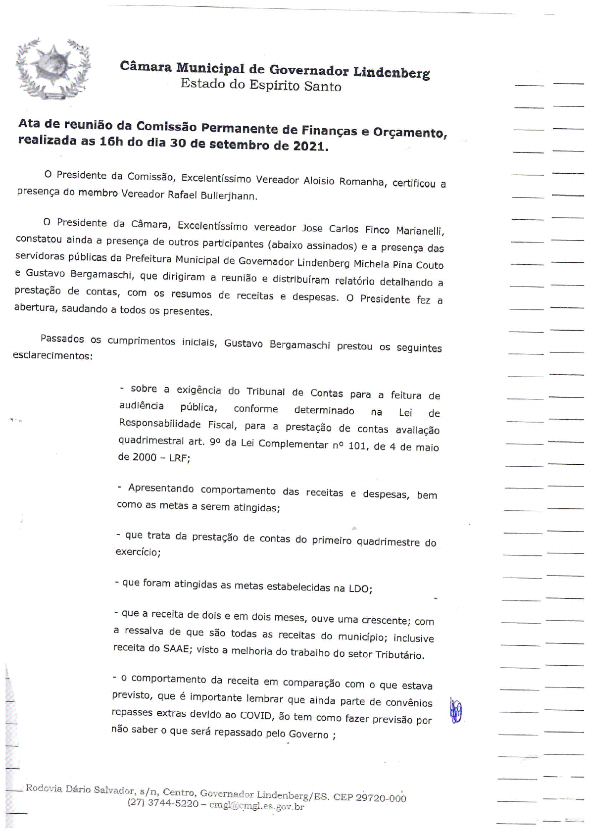 Câmara Municipal de Governador Lindenberg Estado do Espírito Santo Ata de reunião da Comissão Permanente de Finanças e Orçamento, realizada as 16h do dia 30 de setembro de 2021. O Presidente da Comissão, Excelentíssimo Vereador Aloisio Romanha, certificou a presença do membro Vereador Rafael Bullerjhann. O Presidente da Câmara, Excelentíssimo vereador Jose Carlos Finco Marianelli, constatou ainda a presença de outros participantes (abaixo assinados) e a presença das servidoras públicas da Prefeitura Municipal de Governador Lindenberg Michela Pina Couto e Gustavo Bergamaschi, que dirigiram a reunião e distribuíram relatório detalhando a prestação de contas, com os resumos de receitas e despesas. O Presidente fez a abertura, saudando a todos os presentes. Passados os cumprimentos iniciais, Gustavo Bergamaschi prestou os seguintes esclarecimentos: - sobre a exigência do Tribunal de Contas para a feitura de audiência pública, conforme determinado na Lei de a». Responsabilidade Fiscal, para a prestação de contas avaliação quadrimestre! art. 90 da Lei Complementar nº 101, de 4 de maio de 2000 — LRF; - Apresentando comportamento das receitas e despesas, bem como as metas a serem atingidas; - que trata da prestação de contas do primeiro quadrimestre do exercício; — que foram atingidas as metas estabelecidas na LDO; - que a receita de dois e em dois meses, ouve uma crescente; com a ressalva de que são todas as receitas do municipio; inclusive receita do SAAE; visto a melhoria do trabalho do setor Tributário. _ — o comportamento da receita em comparação com o que estava previsto, que é importante lembrar que ainda parte de convênios repasses extras devido ao COVID, ão tem como fazer previsão por não saber o que será repassado pelo Governo ; Rodovia Dário Saia-atém, s/n, Centro, Governador Lindenberg] ES. CEP 29720-000 12?) 3744—5220 — cmgíja. agitação-nbr Câmara Municipal de Governador Lindenberg Estado do Espírito Santo — Na parte da despesa, foi feita por bimestre, despesa inclusive com a câmara, SAAE e Prefeitura, que o primeiro bimestre tem um valor abaixo, por conta da pandemia; no quarto bimestre retornam os gastos, dentro da normalidade, que mercê atenção, por conta dos repasses; - Resultado primário os gastos do Município estão compatíveis com a arrecadação, resultando saúde Financeira; — Prefeitura praticamente não tem dividas; o endividamento é muito baixo, sendo o único hoje o FINISA (financiamento na Caixa para troca de lâmpadas de led), sendo que ela mesma se paga em virtude da economia na rede/ iluminação pública; —gastos com educação, arrecadação de impostos municipais são repassados 25%, e transferências constitucionais, aplicando R$ 3.092.000,00 (três milhões e noventa e dois reais); - Resultado de transferência do FUNDEB, no nosso caso teve perda, de acordo com a quantidade de aluno ele devolve o dinheiro, no caso de Lindenberg/ES, perde-se por causa da quantidade de alunos matriculados; - Gasto com saúde, R$ 5.757.000,00, não entra recurso de COVID; - no final, gasto pessoal, calculado num intervalo de 12 meses, setembro de 2020 a agosto de 2021, percentual de 42.22%, contando que o município esta recebendo muito recurso devido a &COVID; ' Finalmente, Gustavo Bergamaschi abriu eSpaços para perguntas (que não houveram) e encerrou sua fala. O Presidente da Câmara encerrou a reunião, agradecendo a presença de todos. Nada mais havendo a tratar, o Presidente da Comissão decretou encerrada a reunião e solicitou ao Vereador Robim Altoé Campana que lavrasse a ata que, após lida e aprovada, foi assinada por todos os presentes. Rodovia. Dário Salª,-"actor, s/n, Centro, Gc'nr'ernaíc-r Lindenberg/ES. CEP 29720000 (2?) 3744—5220 — cmglj't-i'ogl.esgotam" Câmara Municipal de Governador Lindenberg Estado do Espírito Santo Leonrdo Finco . lí, rªfª-”'ª. ""'“? ?ª, o (“Jose Carlos Finco Marianelli *Presidente da Câmara Municipal de Governador Lindenberg/ESfºº“ Aloisio Romanha Presidente da Comissão de Finanças e Orçamento Prefeit Muíiicipal , ," ,ªsº/º'“ ' f-f/ & XvAIX “x .“ . , .*.“ ..«v, '; x_ “&ka _“; Pºvo“-3535335 «& xt _ x & Mi 'hel ”pinª Cºuto Ráfàªelª unerjhãªímªº && Relator a Comissão de Finanças e Orçamento Se vid ra da Prefeitura Municipal de Governador Lindenberg/ES Gustavo Bergamasohi _ Demais presentes: % * Mm A Miu/%%. ,- i ,( k # Rodovia 'Dáíio Salvador, 3/31; Centro, G.;“..éi Linde (27; 37445220 _ Qing,! j;; ªí:-agf ES. CEP 2%?ZG-íif'ª — Sig-311%)? 2022-03-30T14:10:16-0300 LEONARDO PRANDO FINCO:08063476786