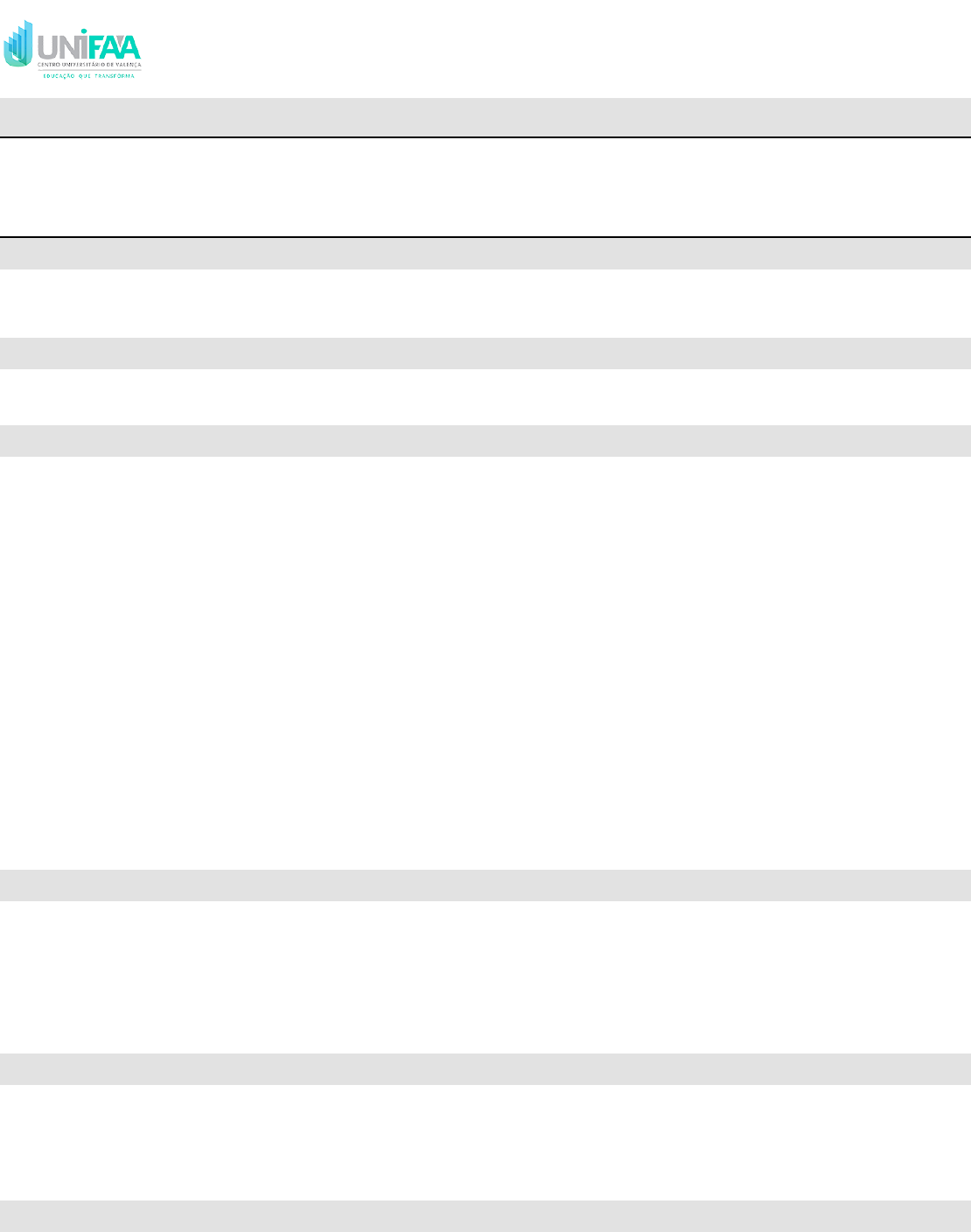Rua Sargento Vitor Hugo, 161 - Bairro Fátima - Valença/RJ - 27.600-000 Tel: (24) 2453 0700 FUNDAÇÃO EDUCACIONAL DOM ANDRÉ ARCOVERDE UNIFAA-CENTRO UNIVERSITÁRIO DE VALENÇA Plano de Ensino Disciplina: ANATOMIA PATOLÓGICA GERAL Medicina VeterináriaCurso: 4º PERÍODOPeríodo: 4º PERÍODO MEDICINA VETERINÁRIA - 2953Turma: 2019/2Período Letivo: Carga Horária: 60 horas Ementa Mecanismos gerais da doença. Degenerações, inflamação, cálculos, neoplasias, malformações e outras doenças relacionadas aos animais além de métodos de diagnóstico anatomohistopatológico e técnicas de necropsia. Objetivo Geral Entender o processo fisiopatológico das doenças dando o alicerce para disciplinas do ciclo profissional vinculadas à prática médica e diagnóstico. Conteúdo Programático Introdução à patologia.1. Metodologia para coleta de material de biopsia e necropsia para exame histopatológico.2. Alterações cadavéricas.3. Malformações e distúrbios do crescimento e desenvolvimento.4. Neoplasias.5. Distúrbios degenerativos intra e extracelulares.6. Necrose, calcificação e apoptose.7. Alterações circulatórias e noções de choque.8. Inflamação e processos granulomatosos.9. Processos de reparação.10. Pigmentações patológicas.11. Necropsia e coleta de material para exame histopatológico.12. Análise macroscópica de peças cirúrgicas13. Sistema de Avaliação ___NPC 1___ P1 - AVALIAÇÃO TEÓRICA: 8,0 PONTOS + TIN 1,0 pontos + DI: 1,0 ponto = Totalizando 10,0 pontos; (a avaliação teórica do conteúdo ministrado até à época da NPC 1; Avaliação teórica será composta por questões objetivas e questões discursivas) ___NPC 2___ P2 - AVALIAÇÃO TEÓRICA: 8,0 PONTOS + AVALIAÇÃO PRÁTICA: 2,0 = Totalizando 10,0 pontos; (avaliação teórica e a prática de todo o conteúdo do semestre (conteúdo acumulativo); Avaliação teórica será composta por questões objetivas). ___NPC 3___ P3 - AVALIAÇÃO TEÓRICA: 10,0 pontos (avaliação teórica do conteúdo de todo o conteúdo do semestre para os alunos que não obtiveram a média em vigor em NPC1+ NPC2, que tenham faltado à avaliação NPC1 ou NPC2; Avaliação teórica será composta por questões objetivas e questões discursivas). IMPORTANTE: o sistema de avaliação dos alunos em situação "semi presencial" seguem as mesmas regras. JONES, Thomas Carlyle; HUNT, Ronald Ducan; KING, Norval William. Patologia veterinária. 6.ed. São Paulo: Manole, 2000. 1415p. THOMSON, Reginald G.; CARLTON, William; MCGAVIN, M. Donald. Patologia veterinária especial de Thomson. 2.ed. Porto Alegre: ARTMED, 1998. MEYER, D. J.; COLES, Embert H.; RICH, Lon J.. 1.ed. São Paulo: Roca, 1995. 308p. Bibliografia Básica Bibliografia Complementar SCHVARTSMAN, Samuel. Plantas venenosas e animais peçonhentos. 2.ed. São Paulo: Sarvier, 1992. LARINI, Lourival. Toxicologia dos praguicidas. 1.ed. São Paulo: Manole, 1999. 2Emitido em 23/07/2021 21:00 | JACAD - Sistema Acadêmico 3.1.44 Código de identificação: 9561DC001R285191 Para consultar a autenticidade do documento acesse: https://faa.jacad.com.br/academico/docs/ Página 1 de Disciplina: ANATOMIA PATOLÓGICA GERAL Medicina VeterináriaCurso: 4º PERÍODOPeríodo: 4º PERÍODO MEDICINA VETERINÁRIA - 2953Turma: 2019/2Período Letivo: Carga Horária: 60 horas JUBB, K. V. F.; KENNEDY, Peter C.; PALMER, Nigel. Pathology of domestic animals. 4.ed. London: Academic Press, 1992. 3v. COLES, Embert H. Veterinary clinical pathology. 4.ed. Philadelphia: W. B. Saunders Company, 1986 MCGAVIN, M.D.; ZACHARY, J.F. Bases da patologia em veterinária. 4. ed. Rio de Janeiro: Editora Elsevier, 2009. Contribuição Para a Formação do Egresso Formação de Médico Veterinário generalista e humanista com capacidade crítica e reflexiva, apto a compreender e traduzir as necessidades de indivíduos, grupos sociais e comunidades, com relação às atividades inerentes ao exercício profissional, em especial: III ? desenvolver, orientar, executar e interpretar exames clínicos e laboratoriais, bem como identificar e interpretar sinais clínicos e alterações morfofuncionais; IV ? identificar e classificar os fatores etiológicos, compreender e elucidar a patogenia, bem como, prevenir, controlar e erradicar as doenças de interesse na saúde animal, saúde pública e saúde ambiental; V ? instituir diagnóstico, prognóstico, tratamento e medidas profiláticas, individuais e populacionais; XIV ? realizar perícias, assistência técnica e auditorias, bem como elaborar e interpretar laudos periciais e técnicos em todos os campos de conhecimento da Medicina Veterinária; Docente: ANA PAULA DE ARAGÃO GAMA Coordenadora: LILIAN CRISTINA DE SOUSA OLIVEIRA BATISTA CIRNE 2Emitido em 23/07/2021 21:00 | JACAD - Sistema Acadêmico 3.1.44 Código de identificação: 9561DC001R285191 Para consultar a autenticidade do documento acesse: https://faa.jacad.com.br/academico/docs/ Página 2 de