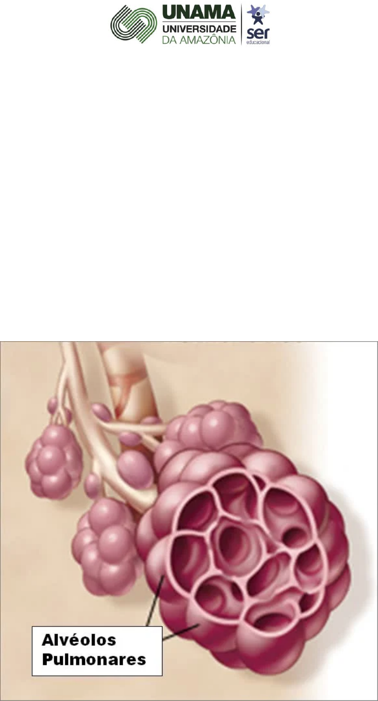 Os alvéolos pulmonares são minúsculos sacos aéreos, presentes nos pulmões, envolvidos por capilares sanguíneos e uma �na membrana. Situam-se onde terminam as �nas rami�cações dos brônquios. Os alvéolos podem se apresentar isolados ou em grupos, formando os chamados sacos alveolares. Em cada pulmão existem milhões alvéolos. São responsáveis pelo aspecto esponjoso dos pulmões. UNIVERSIDADE DA AMAZÔNIA Alvéolos Pulmonares https://www.todamateria.com.br/login/?f=3173 Histologia dos alvéolos pulmonares Os alvéolos são revestidos por uma camada de células epiteliais, denominadas de pneumócito tipo I e pneumócito tipo II. Os pneumócitos tipo I são células pavimentosas, com pequena quantidade de citoplasma. Essa característica facilita a passagem de gases. Os pneumócitos tipo II são células ovais e volumosas. Esse tipo de célula produz uma secreção lipoproteica, chamada de surfactante. A função do surfactante é manter os alvéolos abertos e auxiliar na difusão dos gases pela membrana alveolar. Função dos alvéolos pulmonares A principal função dos alvéolos pulmonares é ser o local onde ocorrem as trocas gasosas entre o ar e o sangue, a hematose. Ao chegar aos alvéolos, o oxigênio difunde-se para o sangue dos capilares. Enquanto, o gás carbônico, pr esente no sangue dos capilares difunde-se para o interior dos alvéolos. A hematose consiste na difusão dos gases, devido ao diferente grau de concentração de cada um. https://www.todamateria.com.br/ https://www.todamateria.com.br/login/